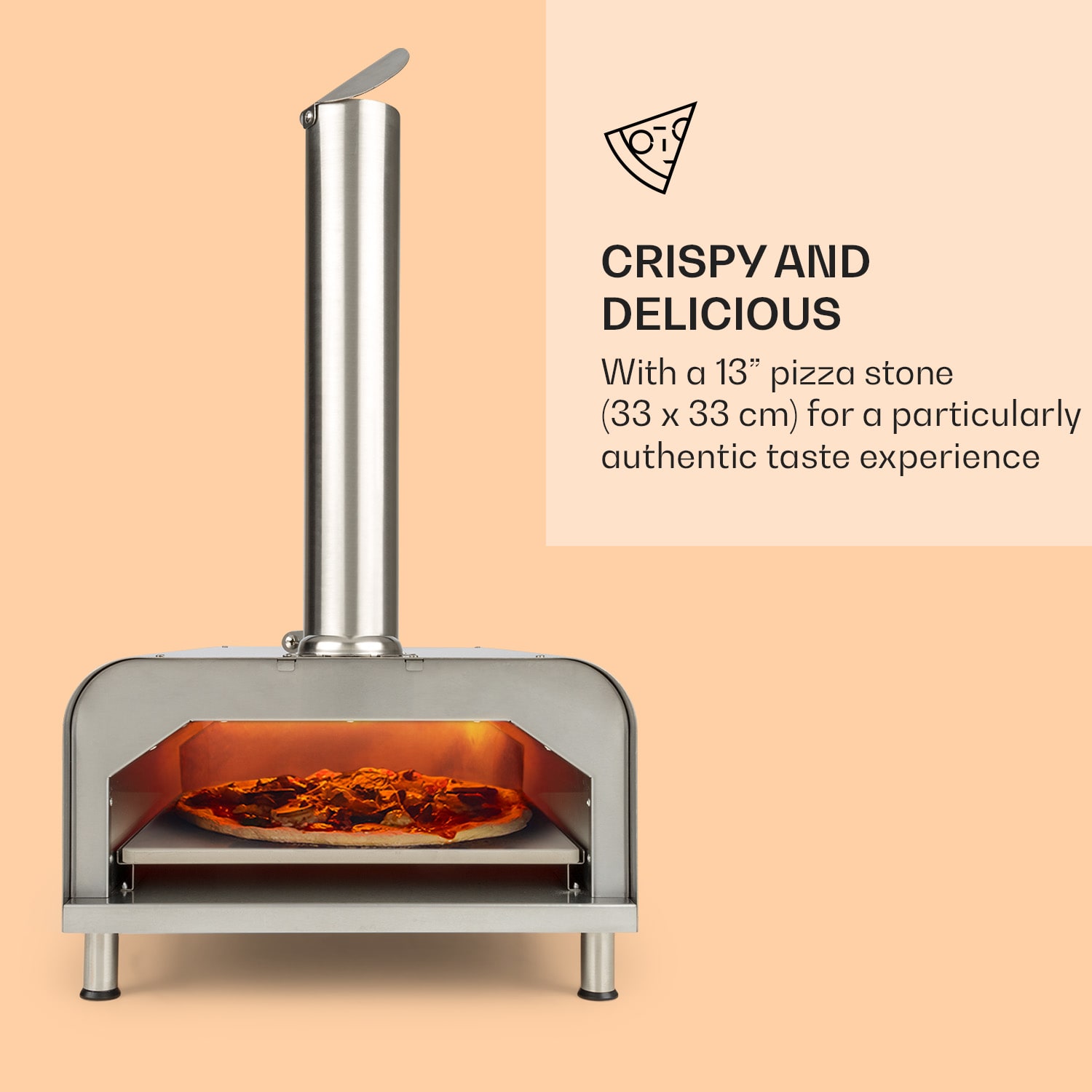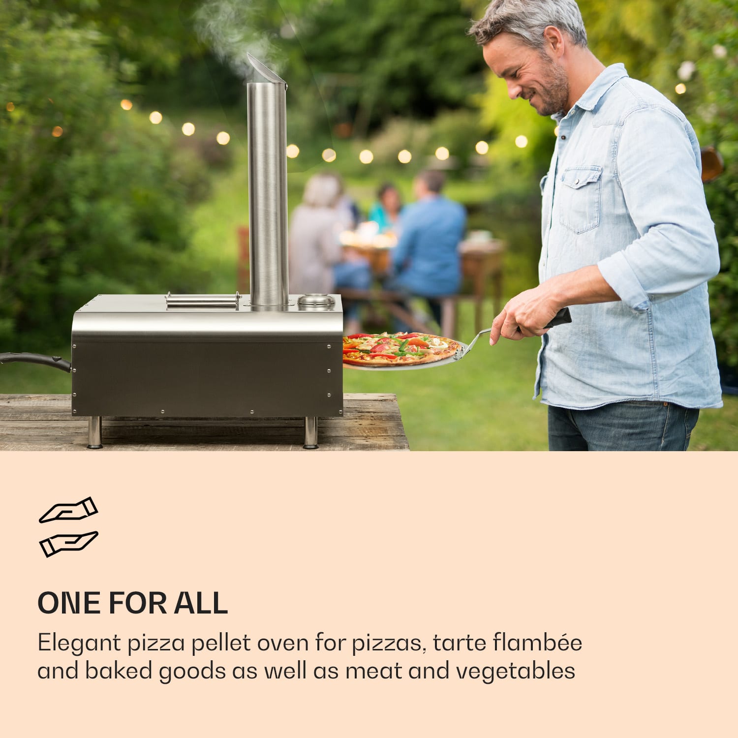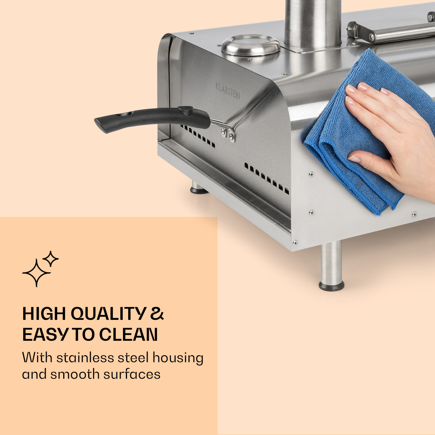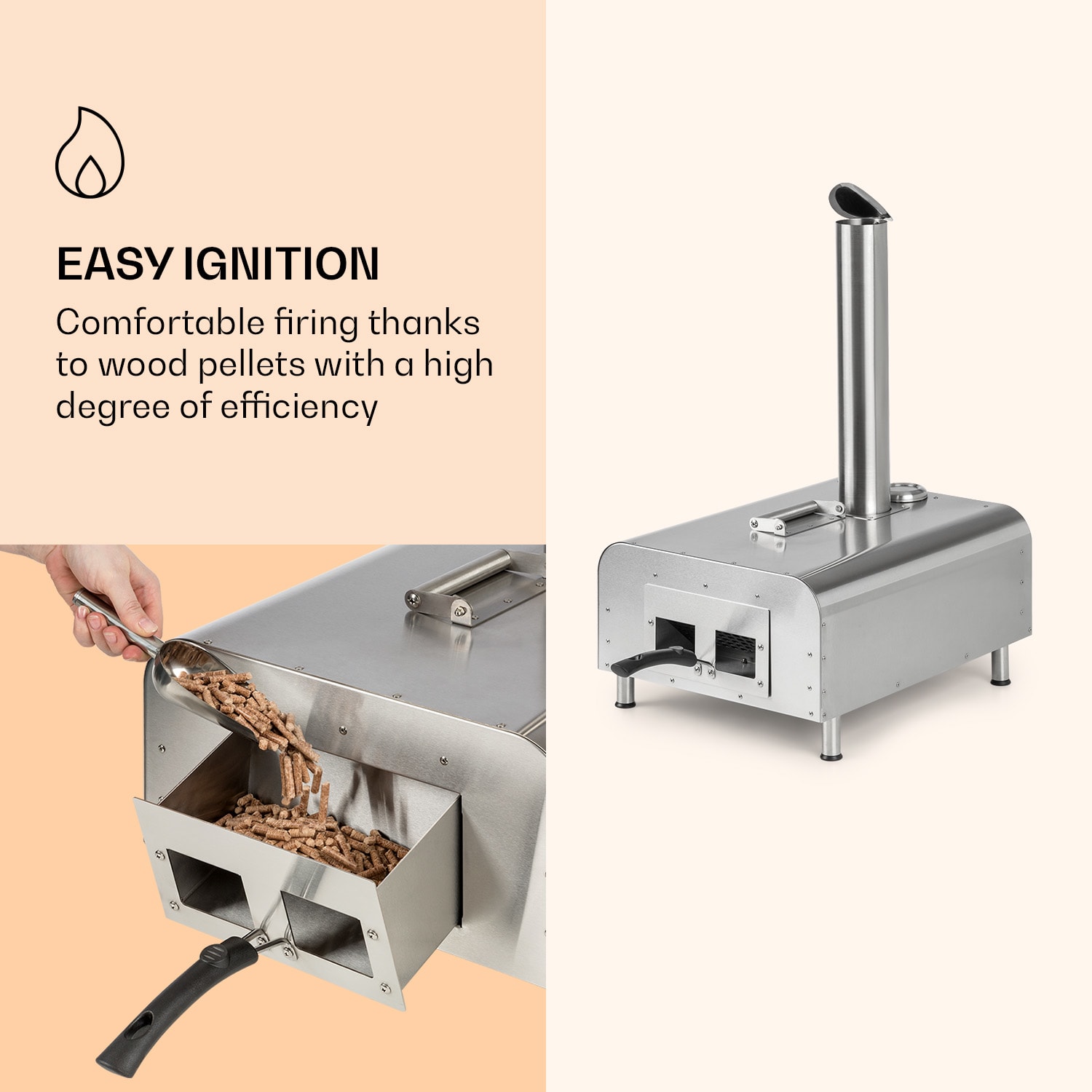 Najlepšie gurmánske zážitky úplne bez elektriny: jedinečná pec na pizzu Diavolo od Klarsteinu ti umožní pripraviť aromatické jedlá na skutočnom ohni. Pizza, chlieb z pece, mäso, zelenina alebo koláče – upečené tradične, no s najmodernejšou technológiou pece na pelety, chutia nezameniteľne. Umiestni Diavolo do exteriéru, zadnú časť naplň drevenými peletami a vyhrej ju na požadovanú teplotu. Integrovaný teplomer ti spoľahlivo ukáže presnú teplotu, zatiaľ čo konštrukcia z nehrdzavejúcej ocele sa postará o rýchle rozdelenie tepla a zaujímavý komín zaisťuje dobré odsávanie dymu.