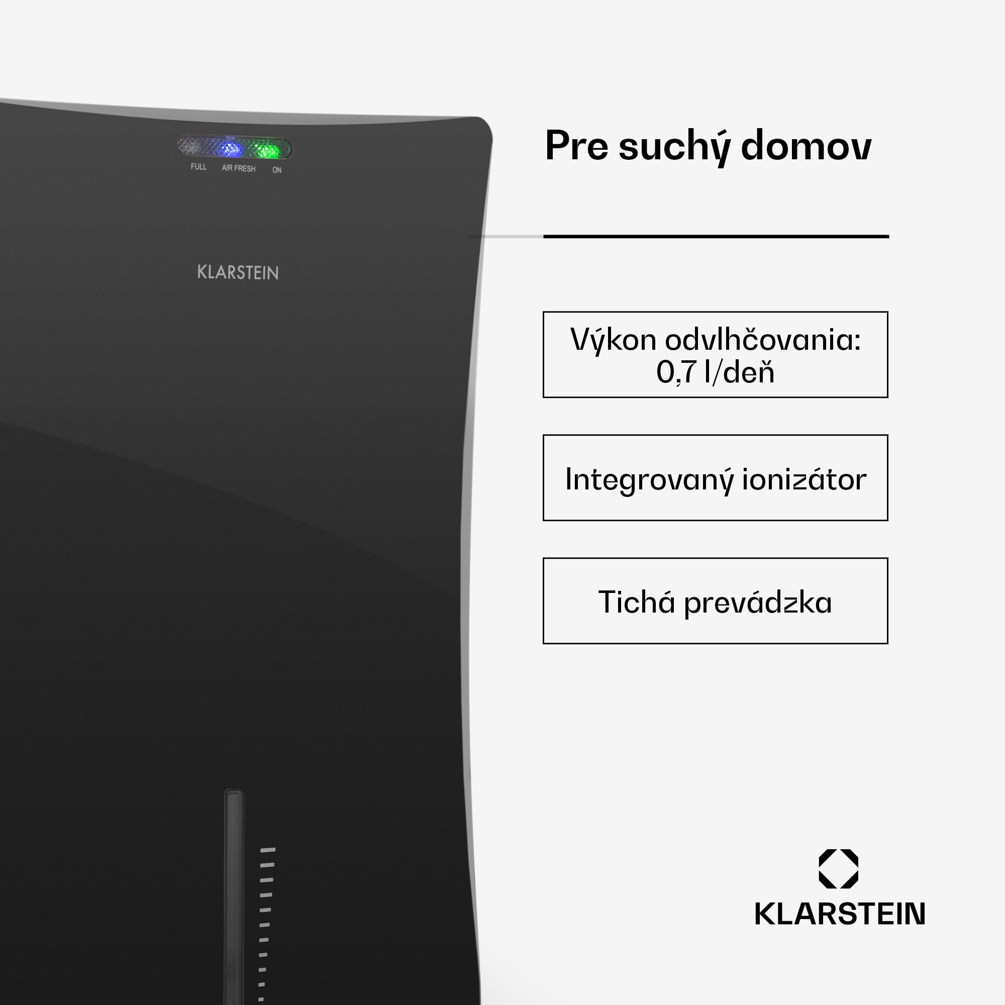 Odvlhčovač vzduchu Klarstein Drybest 2000 2G Vás oslobodí od vlhkého, zatuchnutého vzduchu v miestnosti a dýchanie urobí pôžitkom. Rozlúčte sa s vlhkým vzduchom a zrážaním kondenzovanej vody. S druhou generáciou osvedčeného odvlhčovača vzduchu Klarstein Drybest 2000 teraz odstránite prebytočnú vlhkosť zo vzduchu ešte lepšie. Odfiltruje zo vzduchu do 700 ml vody za deň a zhromažďuje ju vo svojom 2-litrovom zásobníku. Pomocou použitia Peltierovho článku je Drybest 2000 2G maximálne energeticky úsporný, zariadenie spotrebuje iba 70 W – a pritom je veľmi tiché. Zariadenie pracuje, kým senzor rozpozná, že jeho nádrž na vodu je plná, potom sa automaticky vypne. Akonáhle je nádoba vyprázdnená – napríklad na polievanie izbových rastlín – prevádzka pokračuje. Dve LED diódy viditeľne zobrazujú, či je zariadenie v prevádzke a či treba vyprázdniť nádrž na vodu. Zlepšite si s odvlhčovačom vzduchu Klarstein Drybest 2000 2G efektívne vzduch v malých, zle vetraných izbách, ako sú šatníky, kúpeľne a špajzy. Tento odvlhčovač do kúpeľne odstraňuje nežiaducu vodnú paru a pomáha predchádzať plesniam a zrážaniu kondenzovanej vody. O ešte viac sviežosti sa postará integrovaný ionizátor, ktorý viaže zo vzduchu prach a redukuje nepríjemné pachy. Osvedčený jednoduchý elegantný dizajn odvlhčovača vzduchu Klarstein Drybest 2000 sa bez problémov začlení so svojimi kompaktnými rozmermi do každého obytného aj pracovného prostredia. Odvlhčovač vzduchu Klarstein Drybest 2000 2G zbavuje prebytočnej vlhkosti a prispieva k príjemnej klíme v miestnosti. Dostupné farby: čierna, hnedá (produkt 10029871)