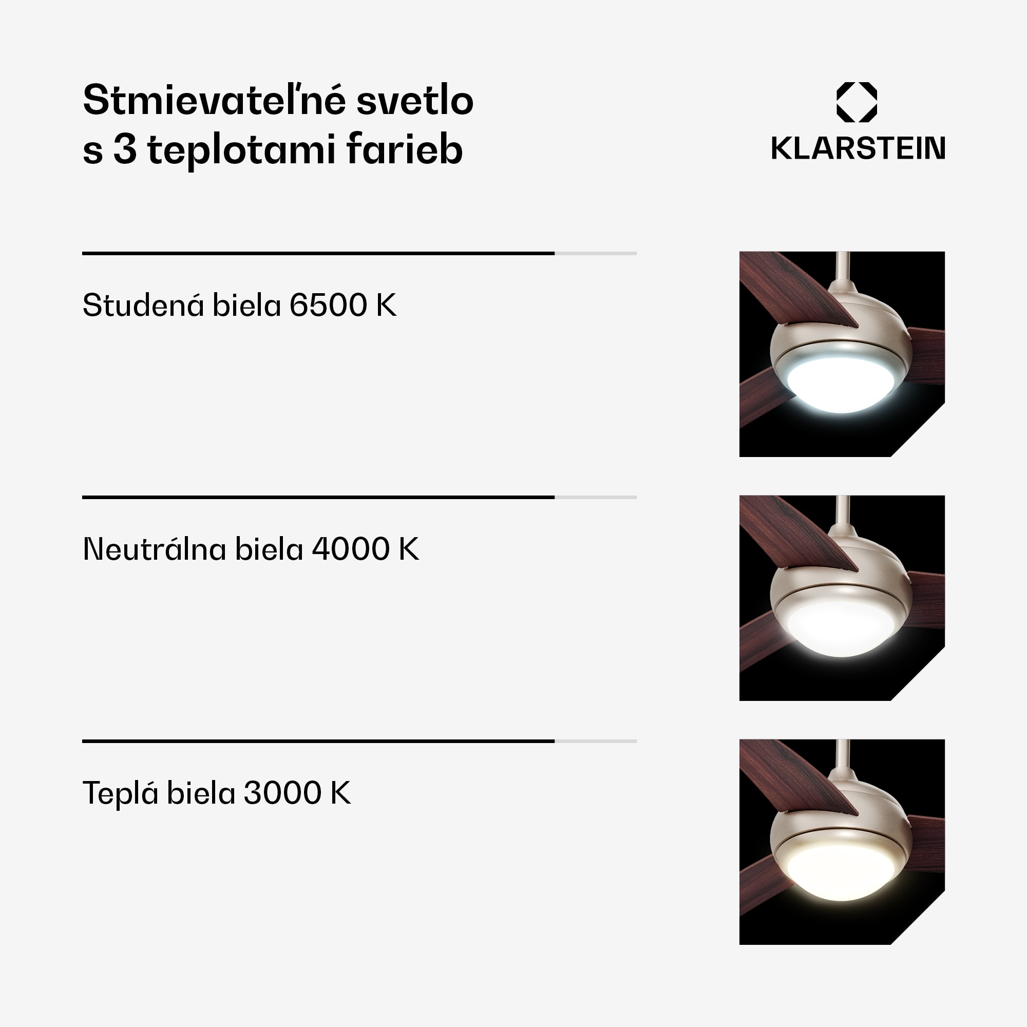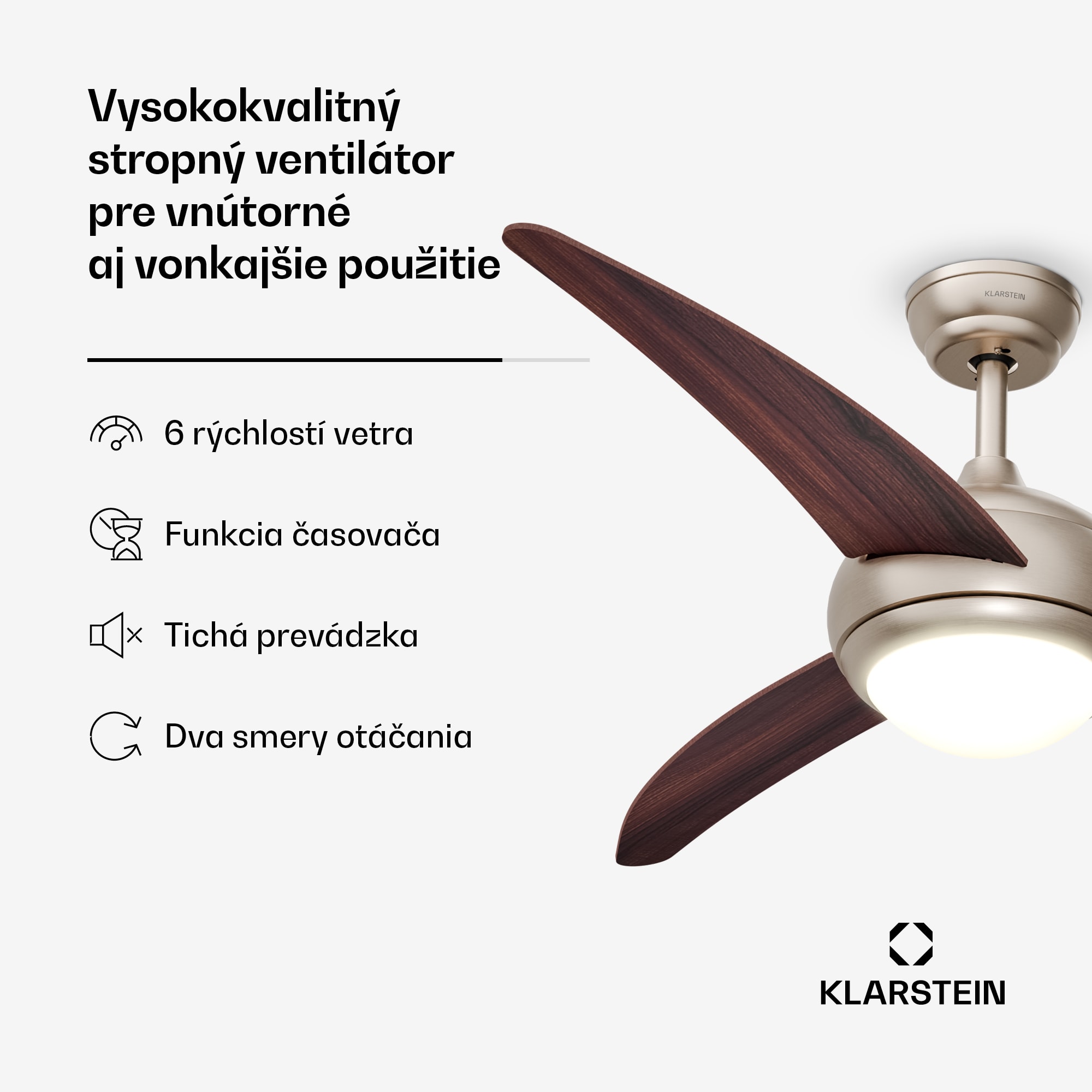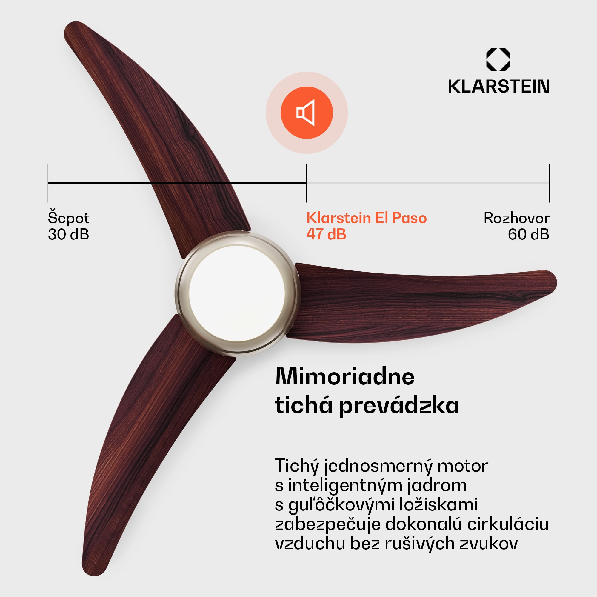 Stropný ventilátor so svetlom Klarstein El Paso sa vyznačuje vysokou kvalitou materiálov a príťažlivým, diskrétnym dizajnom.S tromi lopatkami rotora a maximálnym prietokom vzduchu 10 260 m³ za hodinu zabezpečuje príjemnú vnútornú klímu v miestnostiach s rozlohou do 25 m².Obsluhuje sa diaľkovým ovládaním a možno si vybrať šesť rôznych úrovní výkonu a dva rôzne smery otáčania. V lete ventilátor fúka vzduch smerom nadol a vytvára chladný vánok, zatiaľ čo v zime v opačnom režime nasáva vzduch smerom nahor a jemne rozvádza teplý vzduch po miestnosti.Integrovanú lampu s výkonom 60 W a svietivosťou 800 lúmenov možno ľahko použiť ako stropné svietidlo. Užívatelia si môžu vybrať z troch farieb a intenzity svetla, čo im umožňuje prispôsobiť osvetlenie svojej nálade a požiadavkám.Môže sa používať v interiéri aj exteriéri, napríklad na terasách a balkónoch. To znamená, že stropný ventilátor možno kedykoľvek použiť individuálne a podľa potreby.