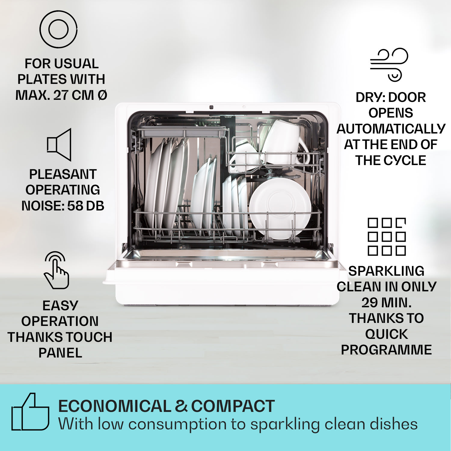 Umývačka riadu Emerald 5 Slim od Klarstein je vďaka svojim kompaktným rozmerom a množstvu programov ideálna na použitie v malých bytoch! Dotykový ovládací panel umožňuje pohodlnú obsluhu a stará sa o ten najlepší prehľad. Vďaka 7 rôznym programom a spotrebe len približne 8 litrov vody na jeden umývací cyklus sa umývačka Emerald 5 Slim spoľahlivo postará o to, aby váš riad a príbory žiarili. Obzvlášť užitočná je integrovaná funkcia sušenia a automatické otvorenie predného poklopu po skončení umývania, aby mohli uniknúť vodné pary a riad bol pripravený na uloženie do skrinky.Kompaktný dizajn, rýchle spustenie a široký výber programov: Umývačka riadu Emerald 5 Slim od Klarstein!