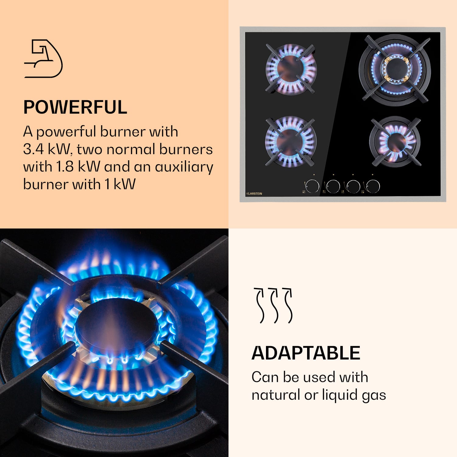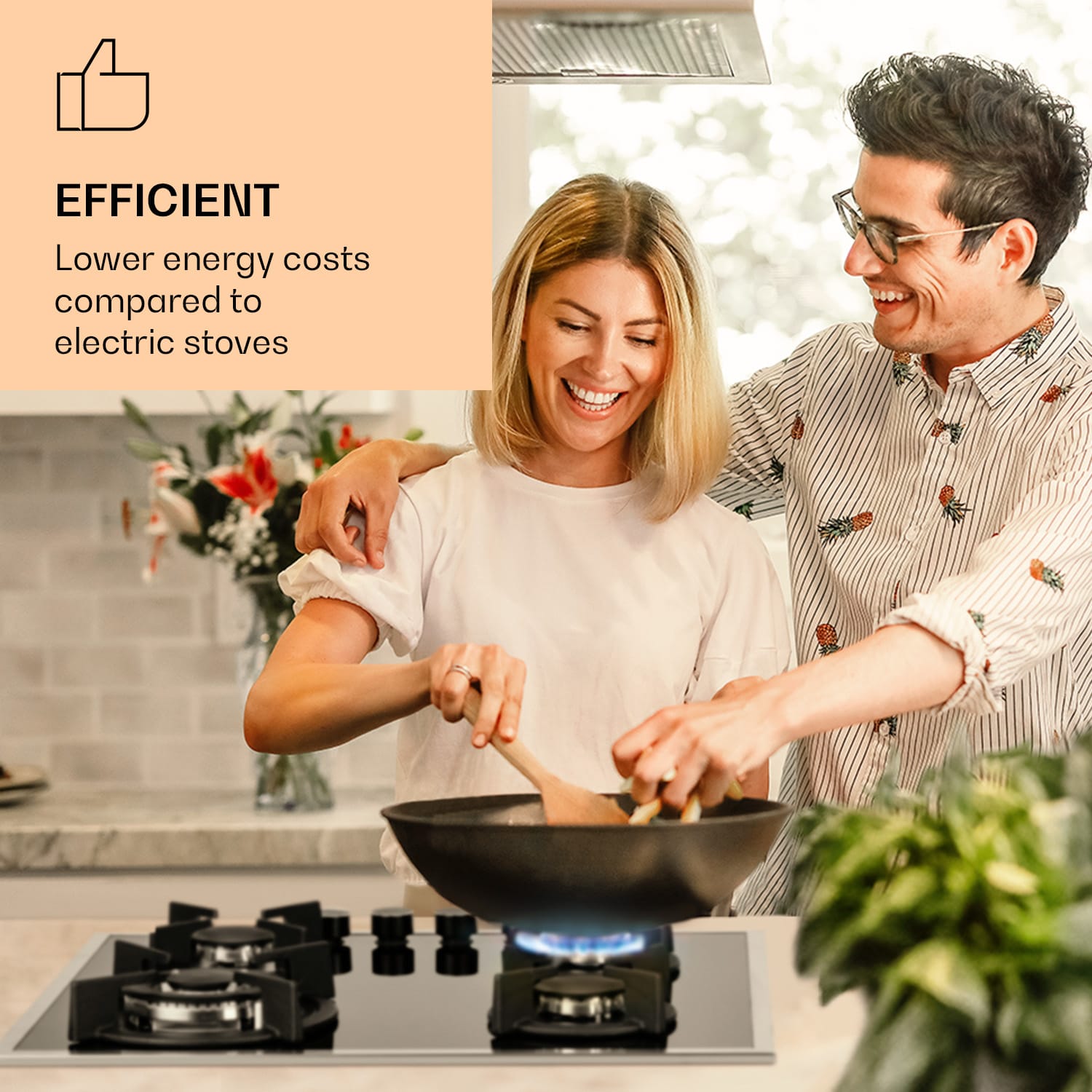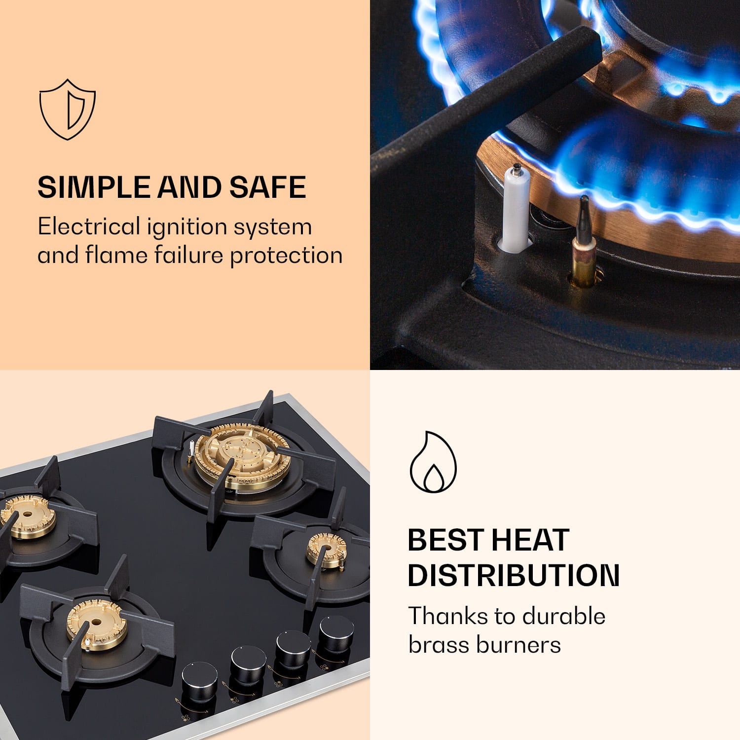 Plynová varná doska Klarstein Goldflame 4 Prime pozostáva z štyroch vysoko kvalitných horákov Messing, ktoré sú umiestnené na 8 mm hrubej sklokeramickej doske. S celkovým výkonom 8 kW poriadne podkúria tvojim hrncom na mriežkach z liatiny. Aby ste Goldflame Domino Prime zapálili, nepotrebujete žiadny dodatočný plameň, pretože plynový sporák je vybavený so zapaľovaním SnapJetIgnition. Prívod tepla regulujete pomocou otočných ovládačov. O luxusný vrchol vzhľadu sa postará rám z nerezovej ocele.Efektívny, rýchly a šetriaci energiu: plynový varná doska Klarstein Goldflame 4 Prime.