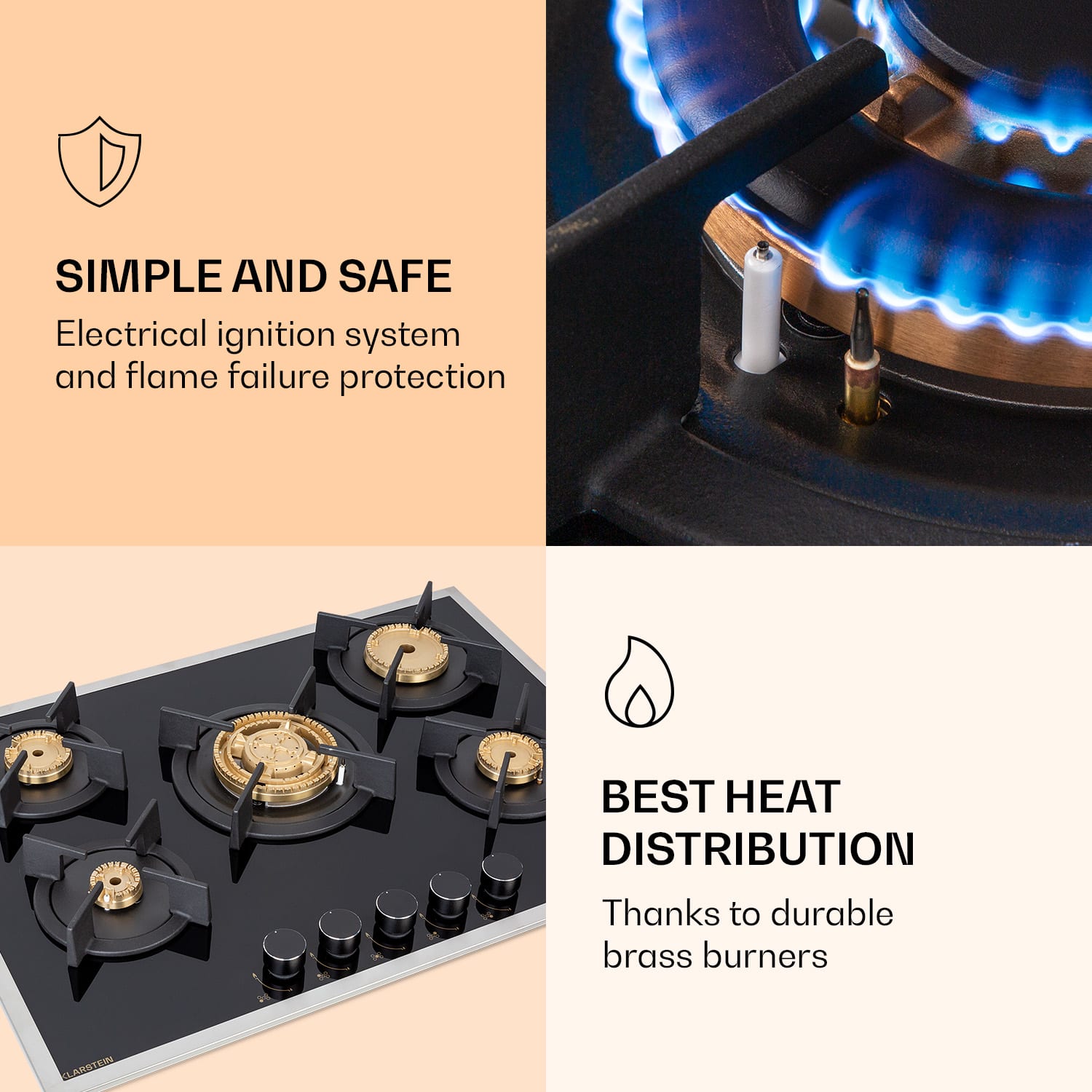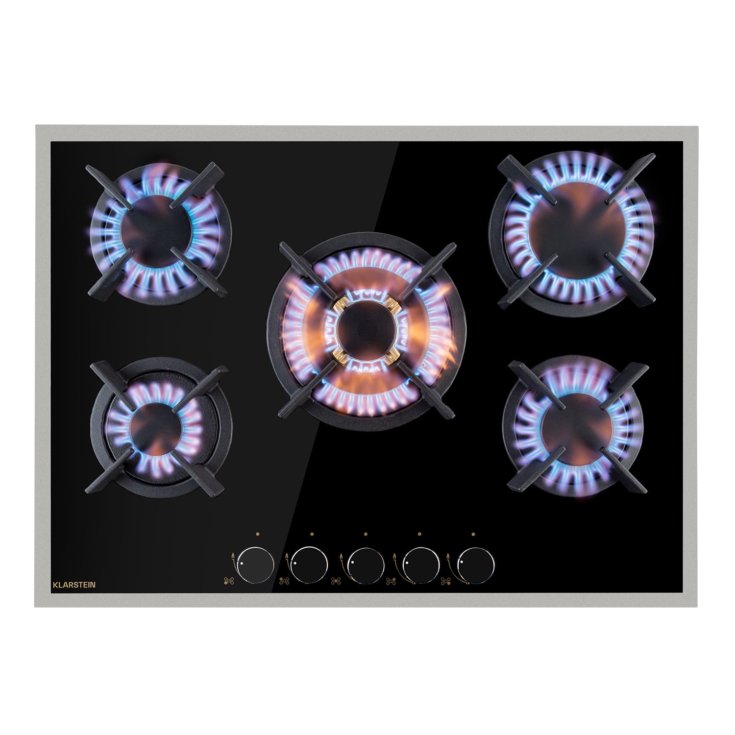 Plynová varná doska Klarstein Goldflame 5 Prime pozostáva z piatich vysoko kvalitných horákov Messing, ktoré sú umiestnené na 8 mm hrubej sklokeramickej doske. S celkovým výkonom 10,4 kW poriadne podkúria tvojim hrncom na mriežkach z liatiny. Aby ste Goldflame Domino Prime zapálili, nepotrebujete žiadny dodatočný plameň, pretože plynový sporák je vybavený so zapaľovaním SnapJetIgnition. Prívod tepla regulujete pomocou otočných ovládačov. O luxusný vrchol vzhľadu sa postará rám z nerezovej ocele.Efektívny, rýchly a šetriaci energiu: plynový varná doska Klarstein Goldflame 5 Prime.