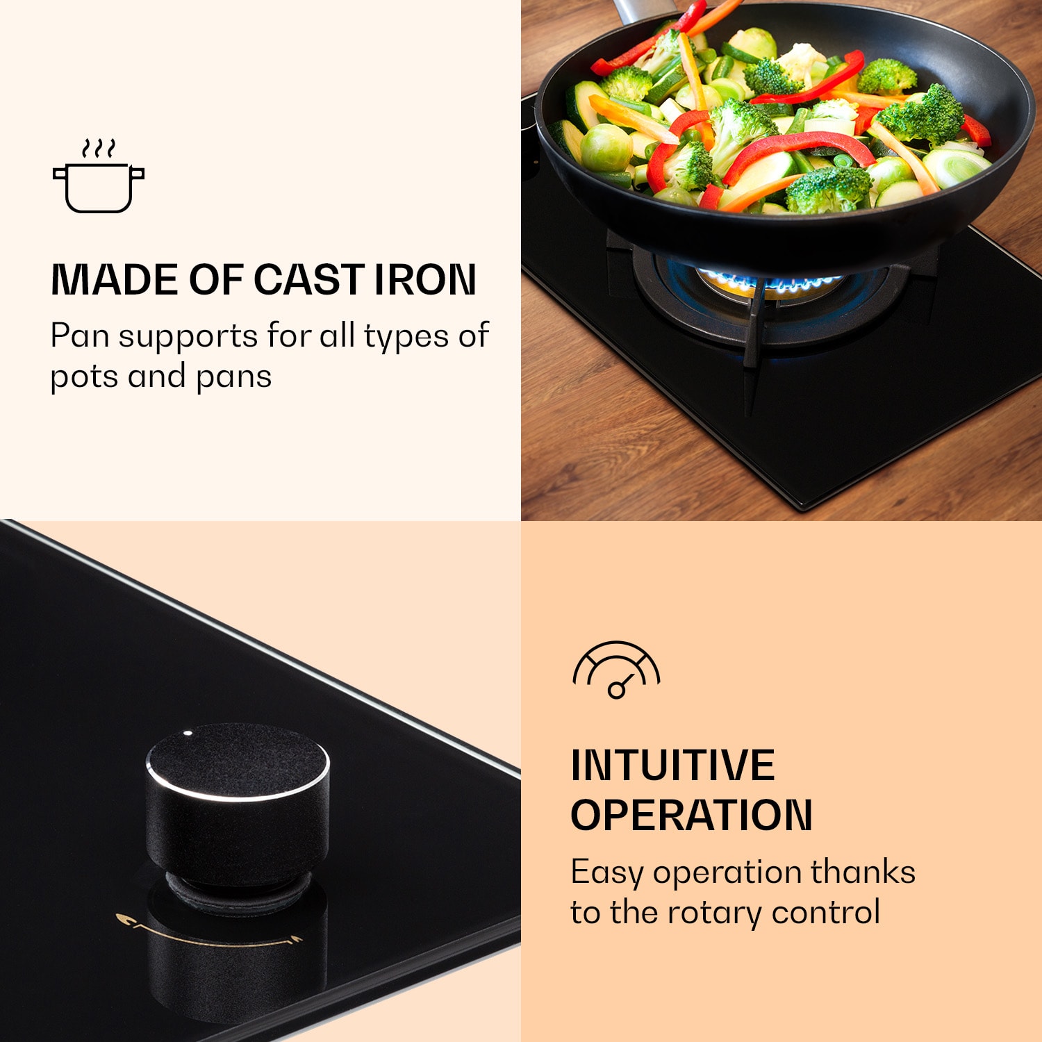 Oheň a plameň pre teba: plynová varná doska Klarstein Goldflame presvedčí kvalitným wok horákom, ktorý tvoju kuchyňu poriadne rozohreje s výkonom 3,4 kW. Trojitý horák rozdeľuje teplo rovnomerne v strede a po okrajoch tvojich hrncov a panvíc. Rôzne veľkosti plameňa majú priamy vplyv na tepelný výkon. Môžeš ho pohodlne prispôsobiť kedykoľvek počas procesu varenia pomocou otočného plynule pohyblivého regulátora. Tvrdené keramické sklo s hrúbkou 8 mm nielenže vyzerá neuveriteľne kvalitne, ale je tiež úžasne jednoduché pri údržbe.