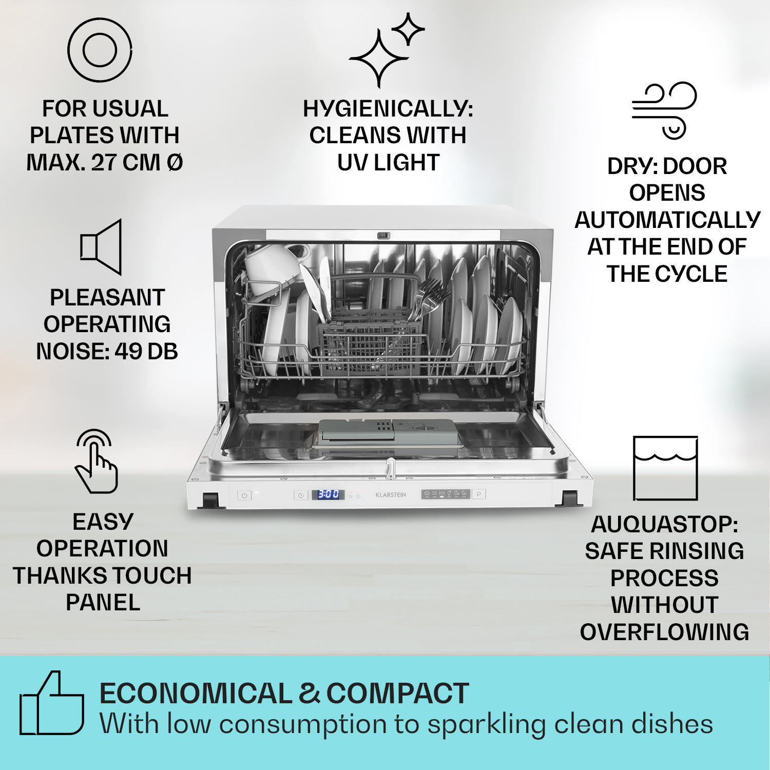 Umývačka riadu Havasia UV 6 Secret od spoločnosti Klarstein je presvedčivý pomocník pri umývaní s mnohými užitočnými funkciami! Zmestí sa do nej až 6 súprav riadu. S výkonom 1380 W a šiestimi rôznymi programami sa umývačka Havasia UV 6 Secret postará o to, aby sa špinavý riad znovu leskol. Všetky programy sa dajú rýchlo a jednoducho nastaviť pomocou prehľadného panelu s tlačidlami. Vstavaná umývačka riadu Havasia UV 6 Secret prináša so svojím elegantným dizajnom nádych luxusu do každej kuchyne.
