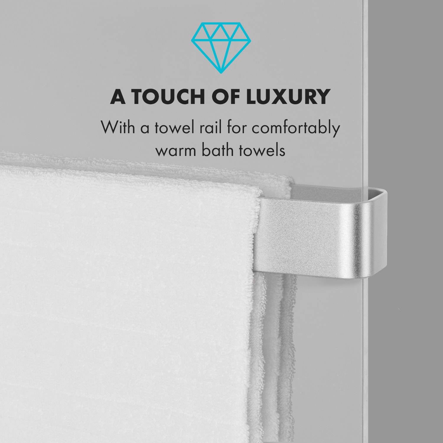 Revolučná technológia pre príjemné teplo: Infračervený ohrievač Klarstein Hot Spot Crystal Reflect Smart prináša do kúpeľne teplo s príjemnými zdraviu prospešnými infračervenými lúčmi a zároveň poskytuje príjemne vyhriate uteráky. Vysoko účinný vyhrievací panel , ktorý je veľmi plochý, možno zavesiť priamo na stenu a elegantne tak zapadne do vašej kúpeľne. Praktická zrkadlová predná časť dodáva sálavému ohrievaču mimoriadne elegantný vzhľad s nádychom luxusu. Celých 95 % absorbovanej energie sa premieňa na tepelné žiarenie pretože technológia IR ComfortHeat využíva princíp slnečného tepla.Revolučná technológia vyhrievania, zrkadlo a držiak na uteráky v jednom: infračervený elektrický ohrievač Klarstein Hot Spot Crystal Reflect Smart .