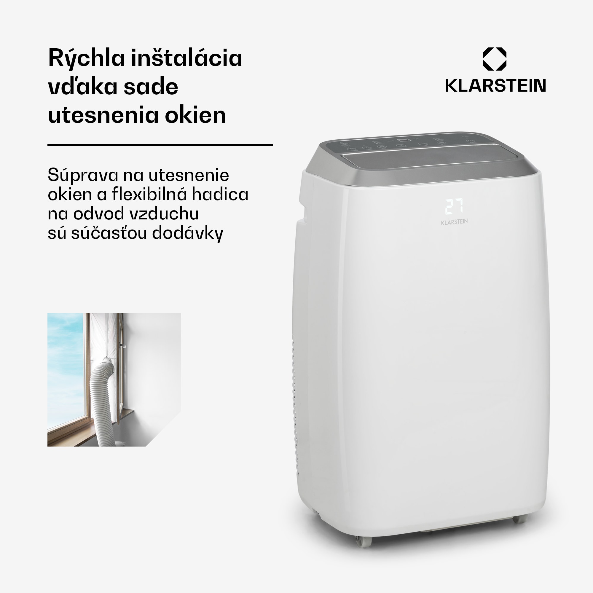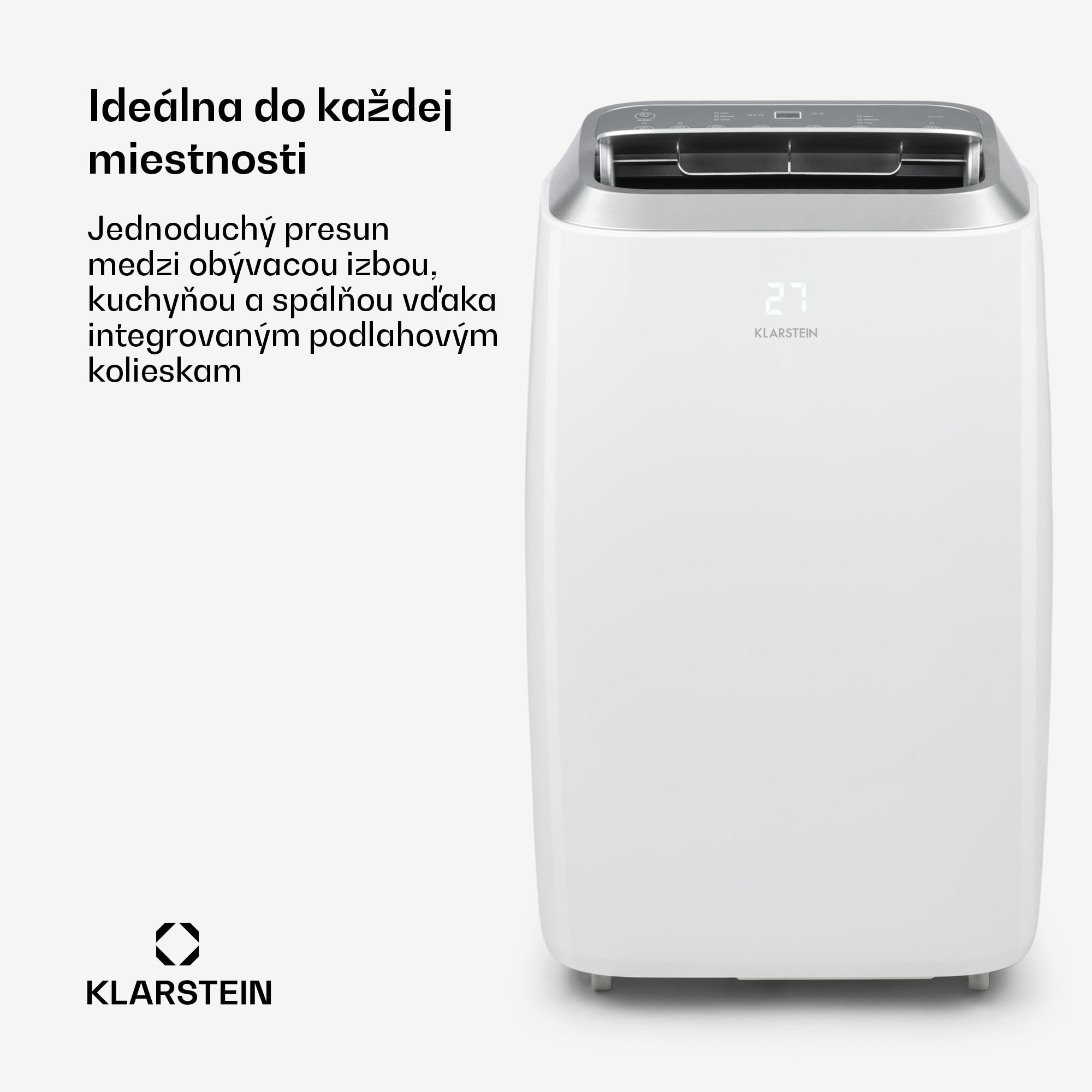 Mobilná Klimatizácia Klarstein Iceblock Smart 12K poskytuje dokonalú letnú pohodu v obytných alebo pracovných miestnostiach. Vyniká svojou účinnosťou 3 v 1 ako klimatizácia, ventilátor a odvlhčovač vzduchu. Ako klimatizácia, ochladzuje miestnosti s rozlohou 13 – 18 m² na príjemnú teplotu od 16 do 31 °C. Integrovaný ventilátor s 3 stupňami výkonu voľne rozvádza ochladený vzduch po celej miestnosti. Výkonný chladiaci kompresor pracuje s výkonom 12 000 BTU alebo 3,5 kW v triede energetickej účinnosti A, takže klimatizácia 3 v 1 Klarstein Iceblock Smart 12K zostáva príjemne úsporná a šetrná k životnému prostrediu aj pri nepretržitej prevádzke. Táto mobilná klimatizácia s hadicou je ideálna pre flexibilné použitie.Pre ideálne chladenú inteligentnú domácnosť: S aplikáciou Klarstein môžete klimatizáciu Iceblock Smart 12K ovládať odkiaľkoľvek: Klarstein.