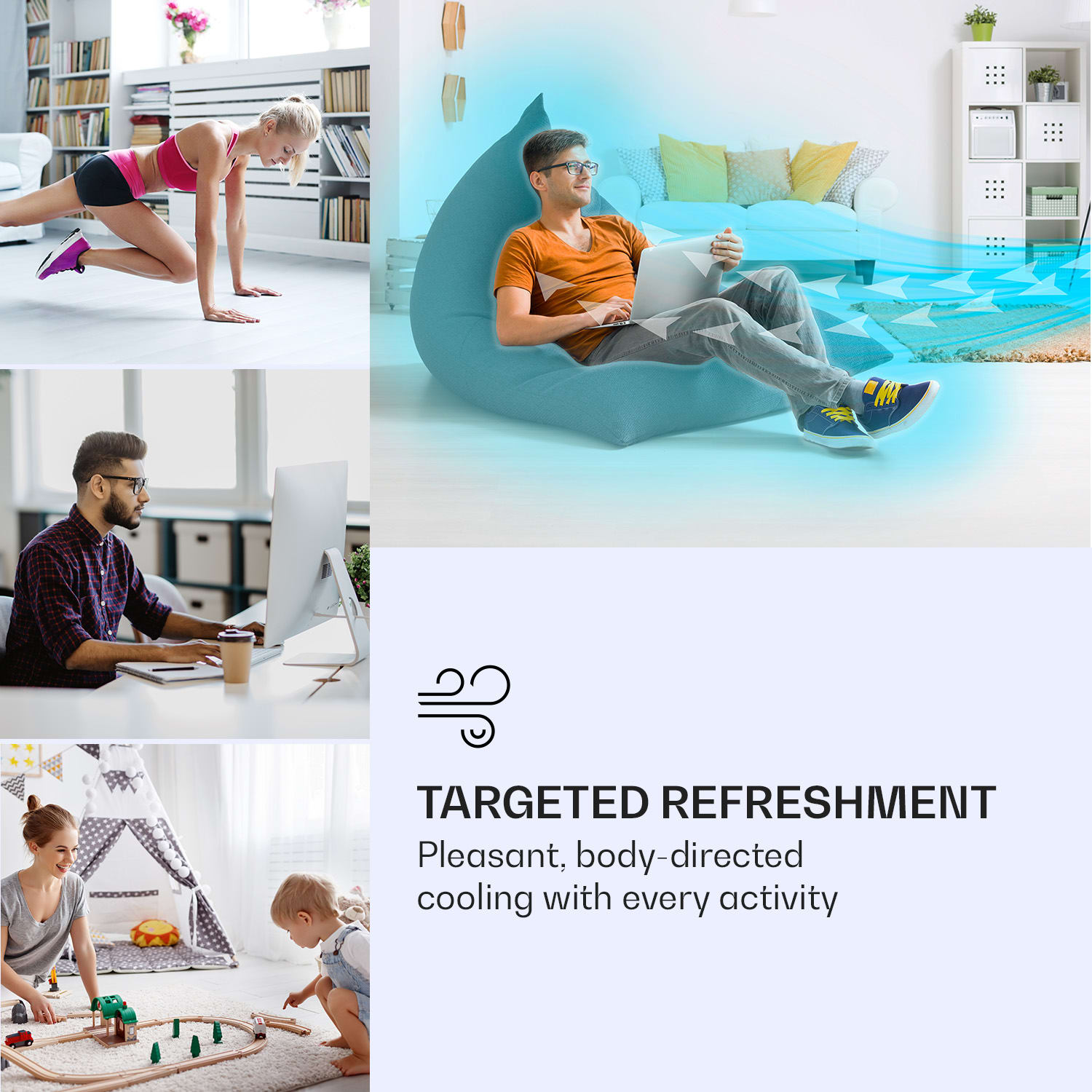 Chladné osvieženie počas horúcich dní: 3-v-1 ochladzovač vzduchu Klarstein IceWind Max ťa spoľahlivo ochladí chladným prúdom vzduchu a aj počas chladných dní presviedča svojou praktickou funkciou zvlhčovača vzduchu. Vďaka automatickej, horizontálnej a vertikálnej oscilácii, 4 rýchlostným stupňom a tromi módami fúkania, si vždy zachováš chladnú hlavu. Pomocou vyparovania zo 6 litrovej nádrže na vodu sa prúd vzduchu príjemne ochladí. To Ti pomôže presne sa osviežiť počas horúcich dní – či už za písacím stolom, na gauči alebo pri hraní s deťmi. A v zime tak priamo zvlhčíš vzduch, aby si sa mohol zhlboka nadýchnuť.