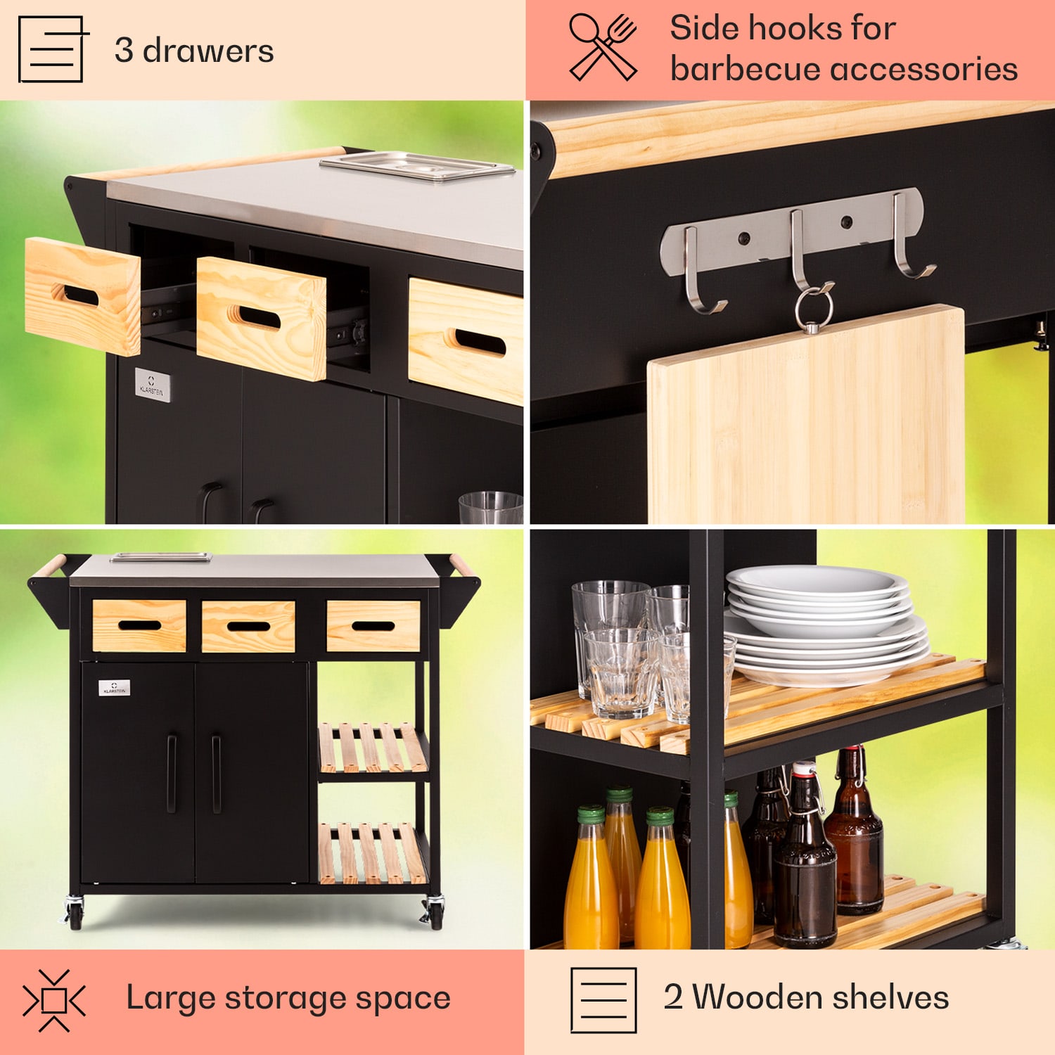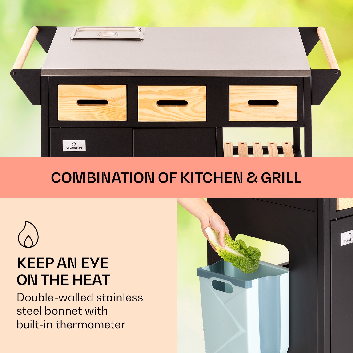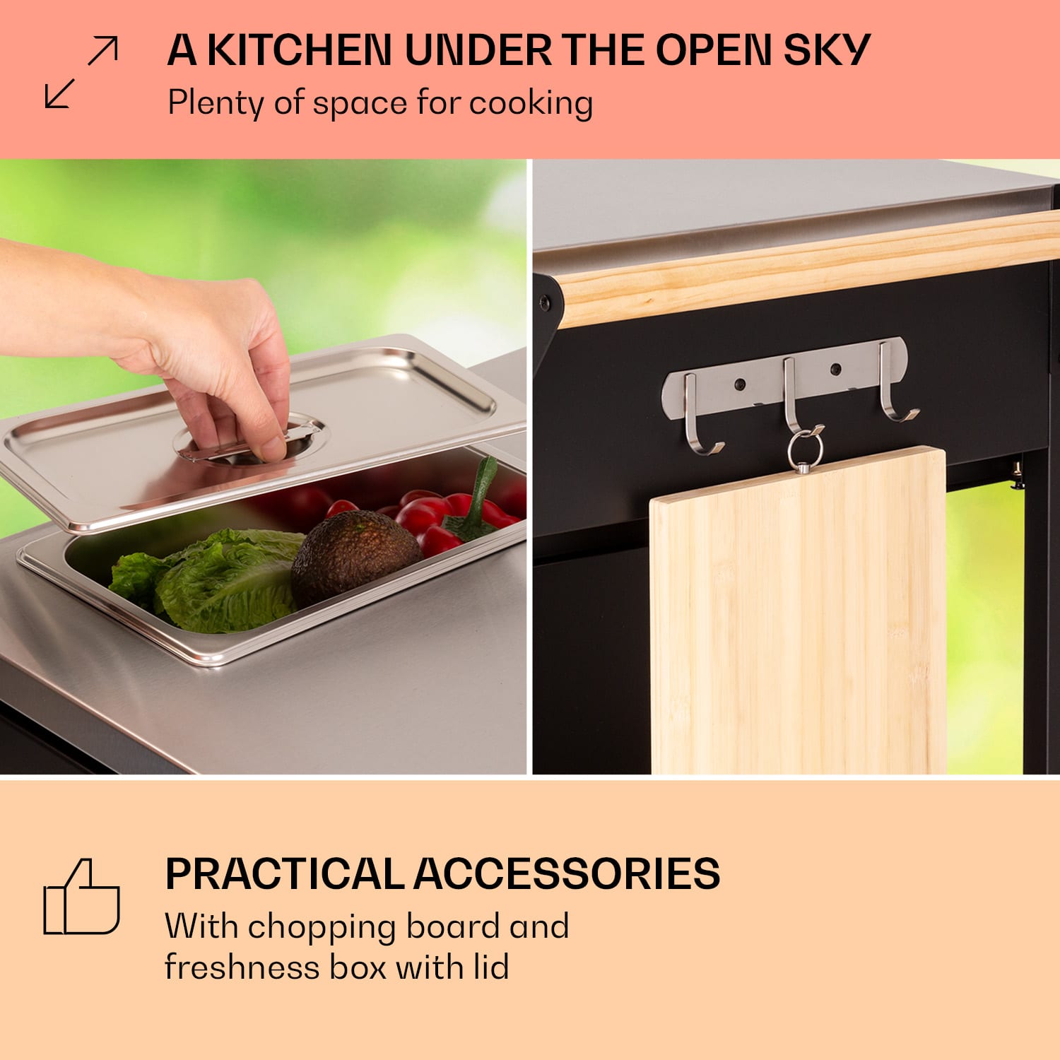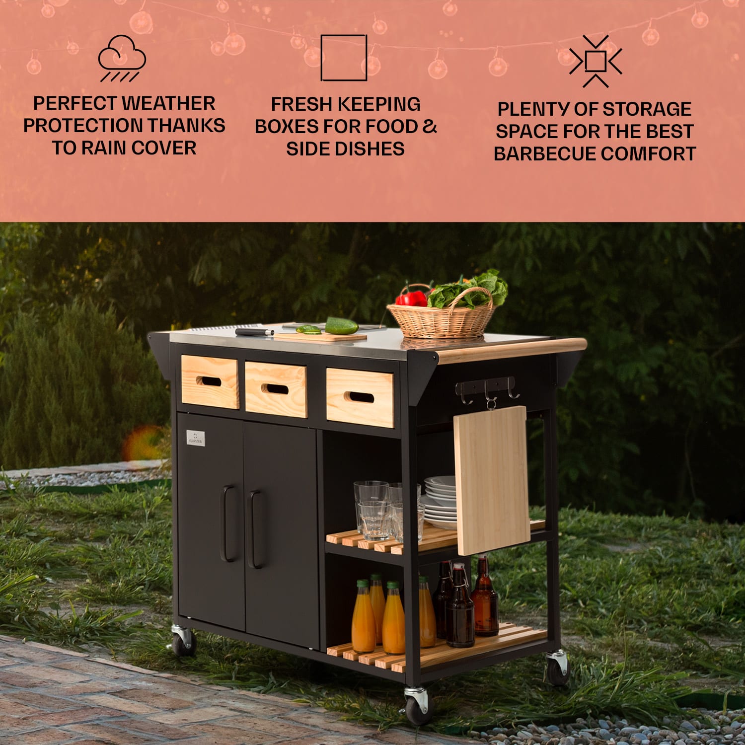 Doma v záhrade! So sériou Jersey od spoločnosti Klarstein si zostavíš v záhrade plnohodnotnú vonkajšiu kuchyňu! Pracovná stanicaJersey poskytuje perfektné miesto na všetky kuchynské práce vo vonkajšom prostredí. Na veľkej pracovnej ploche z ušľachtilej ocele môžeš celkom pokojne pripravovať a servírovať jedlo. Súčasťou balenia je aj doska na krájanie a rezanie. Integrovanú nádobu na zachovanie čerstvosti potravín s vekom môžeš naplniť ľadom alebo surovinami – napríklad na prípravu chutných hamburgerov. Priestor na riad, nože a ostatné pomôcky ponúkajú tri zásuvky, dve police pod pracovnou doskou a tiež tri háčiky. Ďalší úložný priestor s integrovaným odpadkovým košom sa nachádza za dvoma dvierkami v základni pracovnej stanice. Aby si mohol svoju novú pracovnú stanicu Jersey od spoločnosti Klarstein postaviť kamkoľvek potrebuješ, disponuje štyrmi kolieskami s parkovacími brzdami a drevenou rukoväťou na ľavej aj pravej strane na jednoduché tlačenie alebo ťahanie – alebo na zavesenie uterákov. Celá súprava je doplnená ochranným krytom proti dažďu, ktorý chráni pred vetrom, dažďom a prachom. Vitaj doma v záhrade! Zapôsob na priateľov a rodinu s outdoorovou kuchyňou Jersey od spoločnosti Klarstein!