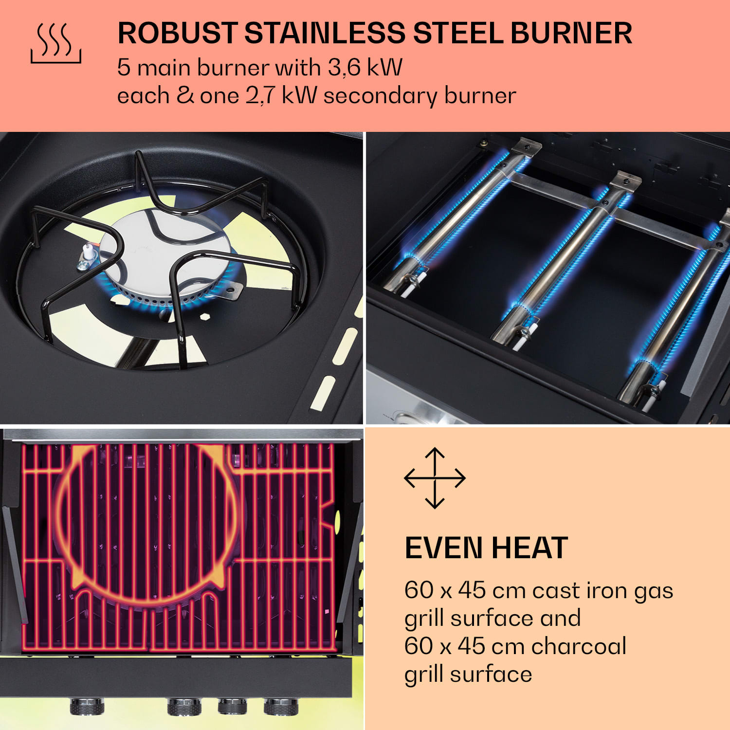Sezóna grilovania sa môže začať: 2 v 1 kombinovaný gril Klarstein Kingsville XL výnimočné BBQ podujatia v priateľskej atmosfére a ponúka maximálnu zábavu pri grilovaní v záhrade, na balkóne alebo na terase. Vďaka svojim veľkým grilovacím plochám a silnému tepelnému výkonu bude príprava jedla zážitkom.Po pripojení plynovej fľaše zabezpečuje piezo zapaľovanie rýchle zapnutie horákov vďaka systému SNAP-JET Ignition-System: stačí stlačiť otočný gombík a plynový gril je pripravený na použitie. Silné teplo piatich hlavných horákov a jedného bočného horáka z ušľachtilej ocele s enormným celkovým výkonom 20,5 kW sa postará o dobré ugrilovanie najrôznejších jedál. Na liatinových roštoch s obrovskou veľkosťou každého roštu 60 × 45 cm budú steaky a iné mäsové špeciality vynikajúco pripravené: vďaka vysokým teplotám bude mäso z vonkajšej strany chrumkavé a vnútri jemné a šťavnaté. Teplo je vo vnútri obzvlášť dobre udržiavané vďaka dvojitej stene veka z ušľachtilej ocele. Teplomer neustále spoľahlivo informuje o aktuálnych teplotách.Gril Kingsville XL kombinuje plynový gril a pec na pizzu v jednom zariadení: Pre milovníkov talianske špeciality z cesta má kombinovaný gril na ľavej strane plnohodnotnú pec na pizzu z ušľachtilej ocele. Dva plynové horáky, každý s výkonom 3,6 kW, zásobujú pec na pizzu potrebným teplom. Vďaka kameňu na pizzu s priemerom 30 cm bude cesto chrumkavé. Tvoji hostia budú nadšení.Kombinovaný gril Kingsville XL ponúka množstvo doplnkov, vďaka ktorým je grilovanie ešte príjemnejšie: výškovo nastaviteľný grilovací rošt poskytuje každému kuchárovi pohodlnú pracovnú výšku, pričom kolesá zabezpečujú jednoduchý presun kombinovaného grilu. Bočný stolík vytvára priestor na grilované jedlo a množstvo grilovacieho príslušenstva, aby si mal pri grilovaní voľné ruky. Vstavaný otvárač na fľaše ponúka možnosť kedykoľvek sa trochu občerstviť.Celá konštrukcia kombinovaného grilu je vyrobená z odolnej ušľachtilej ocele a umožňuje, rovnako ako smaltované grilovacie rošty, mimoriadne rýchle a nekomplikované čistenie.Výnimočne dobrý a enormne výkonný: kombinovaný gril Kingsville XL od spoločnosti Klarstein prináša dokonalosť na každú grilovačku!