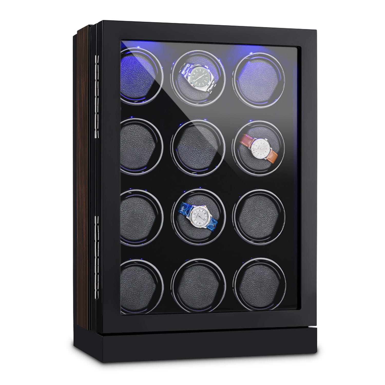 Milovníci hodiniek a zberatelia vedia: Hodinky s automatickým naťahovaním musia byť neustále udržiavané v pohybe, aby nezastali alebo dokonca aby olej vnútri nestuhol. To sa stane, keď vlastníte viac ako jedny takéto hodnotné hodinky alebo keď ich nemôžete určitú dobu nosiť. Tu pomôže pohyblivý stojan na hodinky Klarstein Klagenfurt watch winder, v ktorom hodinky neúnavne kmitajú a hodinový strojček ich drží v neustálom pohybe. Luxusná čierna vitrína pohyblivého stojana na hodinky Klarstein Klagenfurt má dvanásť držiakov na hodinky, každý s čiernym zamatovým vankúšom, a elegantne uvedie na scénu každé hodinky. Penový materiál zabezpečí, že aj hodinky s dlhým remienkom sa dajú pevne umiestniť. Čierny poťah vnútra so štruktúrovaným vzhľadom kompletizuje celkový elegantný dojem. Plastové dvierka chránia cenné chronometre pred prachom a špinou, zatiaľ čo zapínateľné, modré LED osvetlenie sa postará o dobrý pohľad do vnútra. Dva jednoducho zrozumiteľné, digitálne, dotykové displeje, každý so 6 tlačidlami, slúžia pre samostatné ovládanie dvanástich rotátorov. Pre každý držiak možno jednotlivo nastaviť otáčanie v smere otáčania hodinových ručičiek, proti smeru otáčania hodinových ručičiek alebo v striedajúcich sa smeroch otáčania ako aj želaný počet otáčok za deň až do 2200 otáčok. Pohyblivý stojan na hodinky Klarstein Klagenfurt má extrémne tichý motor, ktorého prevádzkový hluk je sotva vnímateľný aj z malej vzdialenosti. Preto je veľmi vhodný pre umiestnenie v spálni či pracovni. Vďaka svojej elegantnej, čiernej vitríne s ozdobným okrajom je pohyblivý stojan na hodinky Klagenfurt zvlášť vhodný aj pre prezentáciu kvalitných chronometrov v profesionálnej oblasti, napríklad hodinármi alebo v klenotníctvach. Modré vnútorné osvetlenie podporuje túto možnosť, integrovaný zámok dvierok zabráni zasa neželanému prístupu k vystaveným hodinkám.