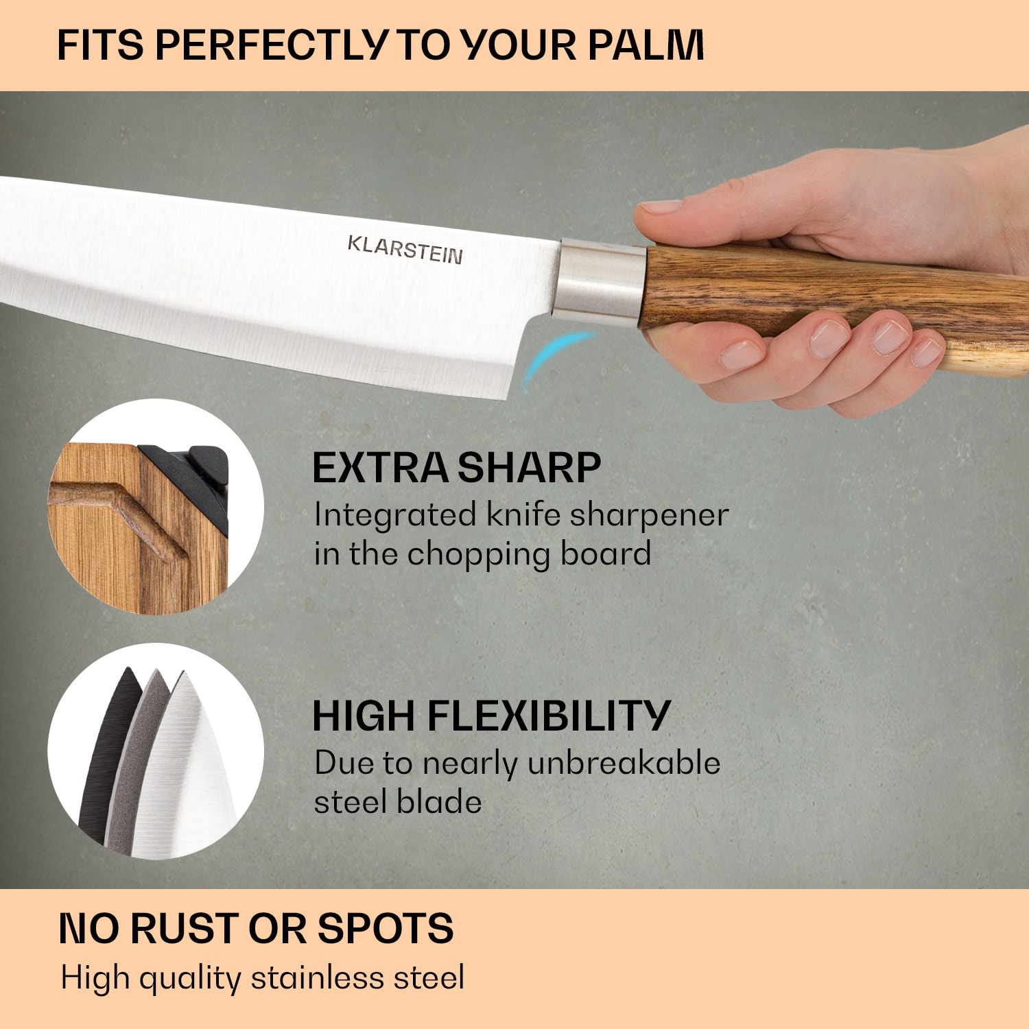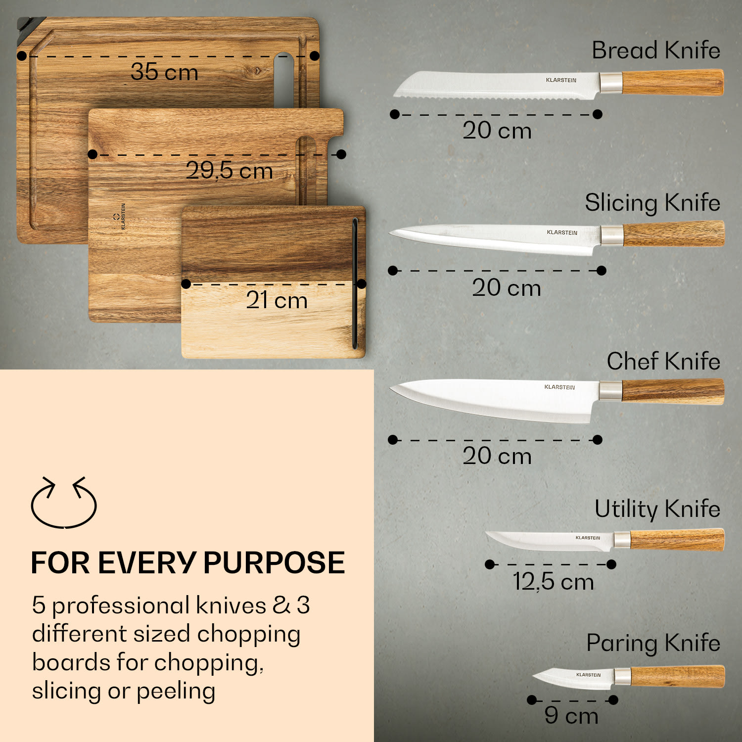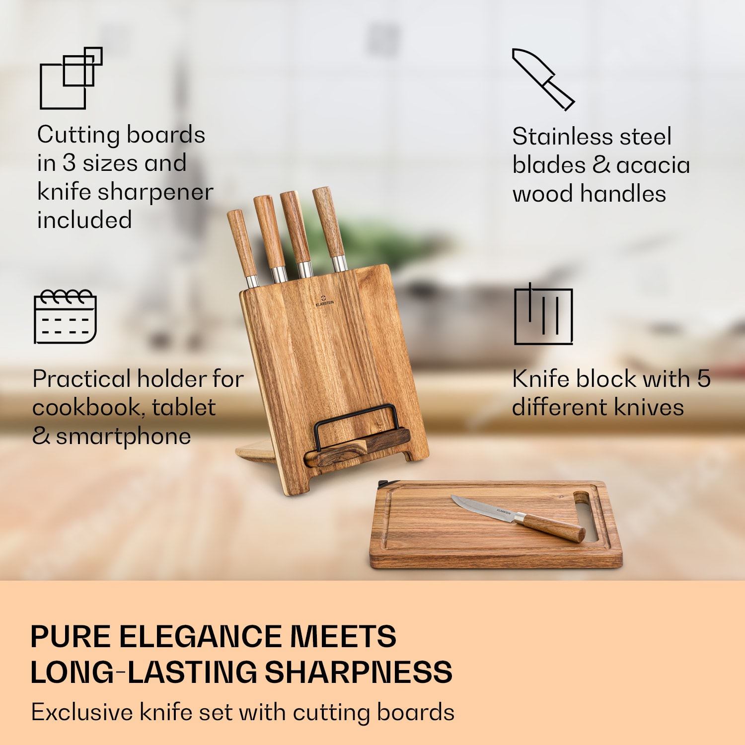 Ostré nože sú v kuchyni absolútnou nevyhnutnosťou: so sadou nožov Klarstein Komaki k vám domov prichádza 5 rôznych precíznych čepelí z nehrdzavejúcej kalenej ocele. A priamo si so sebou prinesú 3 dosky na krájanie. Sada nožov Komaki má však špeciálnu vlastnosť: tri dosky na krájanie sa dajú do seba zasunúť a vytvoriť blok nožov. Stredová doska má 5 otvorov, v ktorých sú bezpečne a prehľadne uložené čepele. To však nie je jediná zaujímavosť: dve dosky na krájanie spolu tvoria aj praktický držiak na kuchárske knihy, smartfóny alebo knihy s receptami. Akoby to nestačilo, veľká doska na krájanie má aj praktický integrovaný brúsič nožov. Tím snov vo vašej kuchyni: Klarstein Komaki sada nožov a vy!