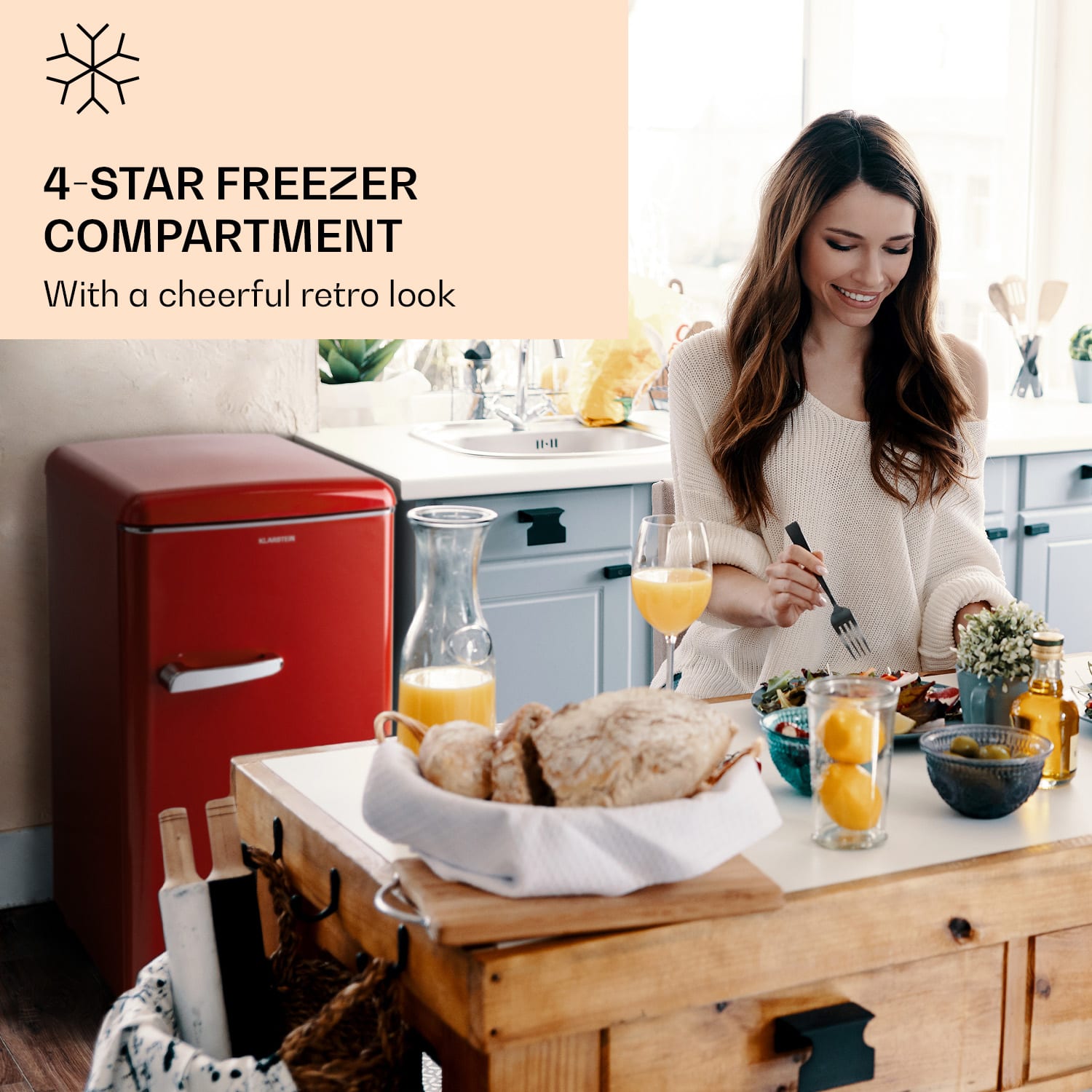 Komfort sa snúbi s nostalgiou: Extravagantná mraznička Klarstein Laika ponúka najinovatívnejšiu technológiu so 4-hviezdičkovým mraziacim priestorom zabaleným v modernom retro dizajne. Kompaktná veľkosť s objemom 60 litrov ponúka dostatok priestoru pre mrazené potraviny stredne veľkej domácnosti. Jej tri praktické zásuvky zaisťujú poriadok a umožňujú dlhodobé zmrazenie potravín. Špeciálny druh hlbokého mrazenia: Mraznička Laika od spoločnosti Klarstein vyžaruje v kuchyni veselý šarm 50. rokov vďaka svojmu retro dizajnu!