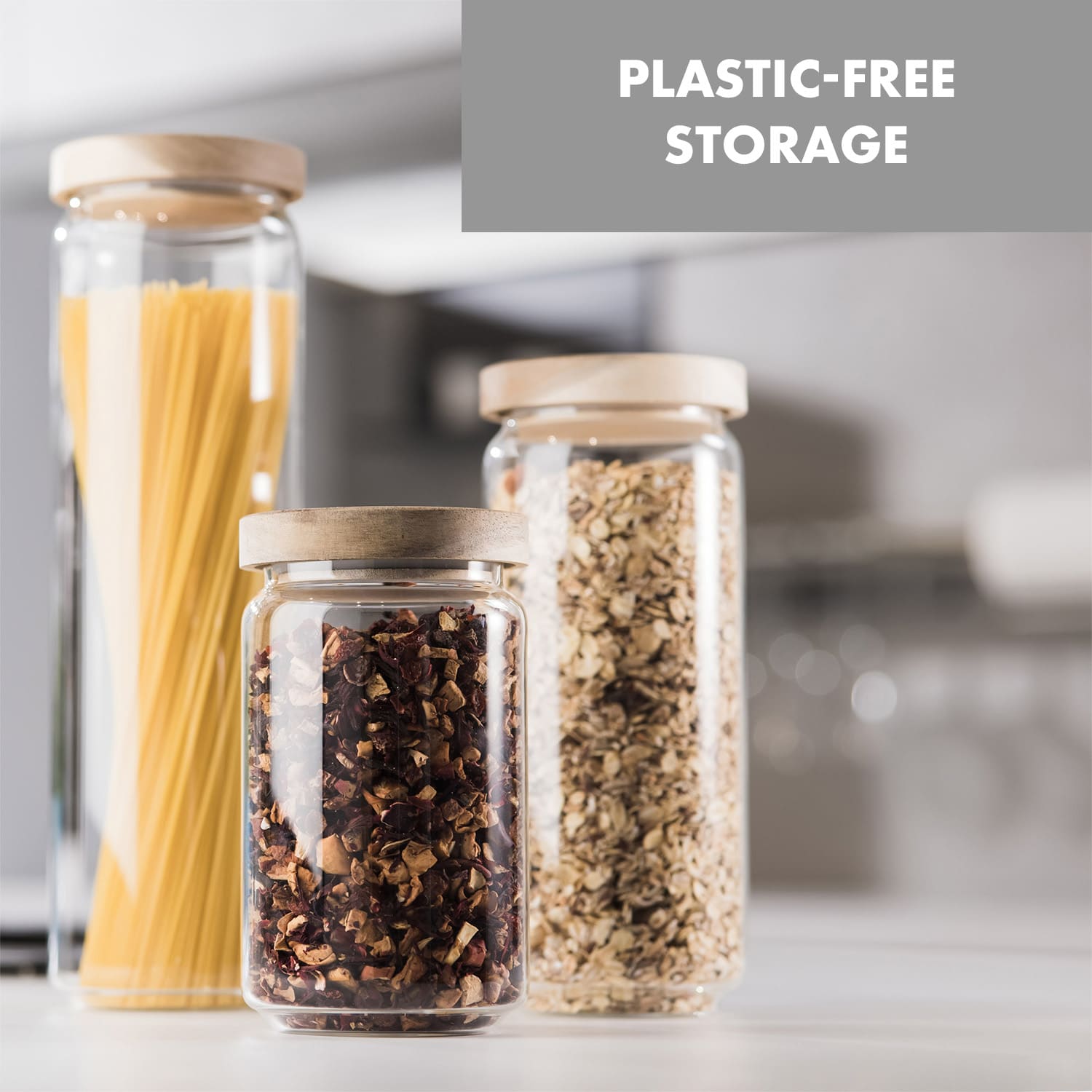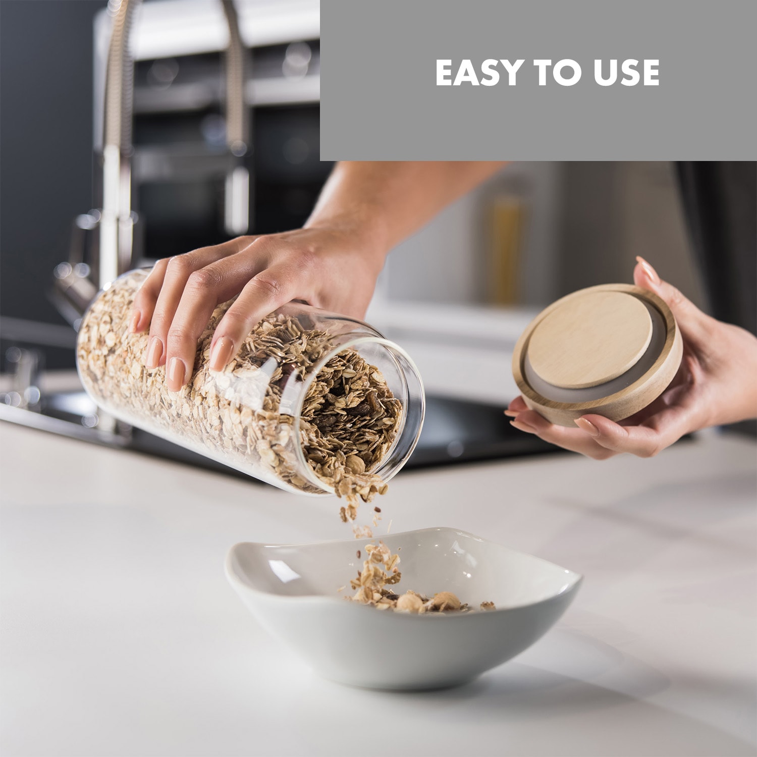 So skladovacími dózami Lovage Klarstein sa do tvojej kuchyne nasťahuje prehľad, poriadok a štýl. Skladovacie dózy sú vyrobené z trvácneho a odolného borosilikátového skla, ktoré je obzvlášť žiaruvzdorné a odolné voči chladu a zároveň ľahké ako pierko. Silikónové tesnenie bez BPA sa v kombinácii s praktickým vekom z akáciového dreva, stará o 100% tesnosť a ochranu pred pachmi. S objemom 0,75, 1,1 a 1,5 litra ponúkajú skladovacie dózy Klarstein Lovage dostatok miesta pre zásoby rôzneho druhu. Priehľadné nádoby sú ideálne na skladovanie cestovín, zrnkovej kávy, múky, cukru alebo müsli. Pri tom nie sú len skutočnou pastvou pre oči na tvojom kuchynskom regáli, ale vďaka tvaru veka sa dajú poháre na seba úsporne uložiť. Skladovacie dózy sú samozrejme vhodné do umývačky riadu. Silikónové tesnenie sa dá jednoducho vybrať a umožňuje tak pohodlné a dôkladné čistenie jednotlivých dielov.Skladovacie nádoby bez plastov, vysokokvalitné a trvácne v štýlovom dizajne z prírodných materiálov: skladovacie dózy Klarstein Lovage.