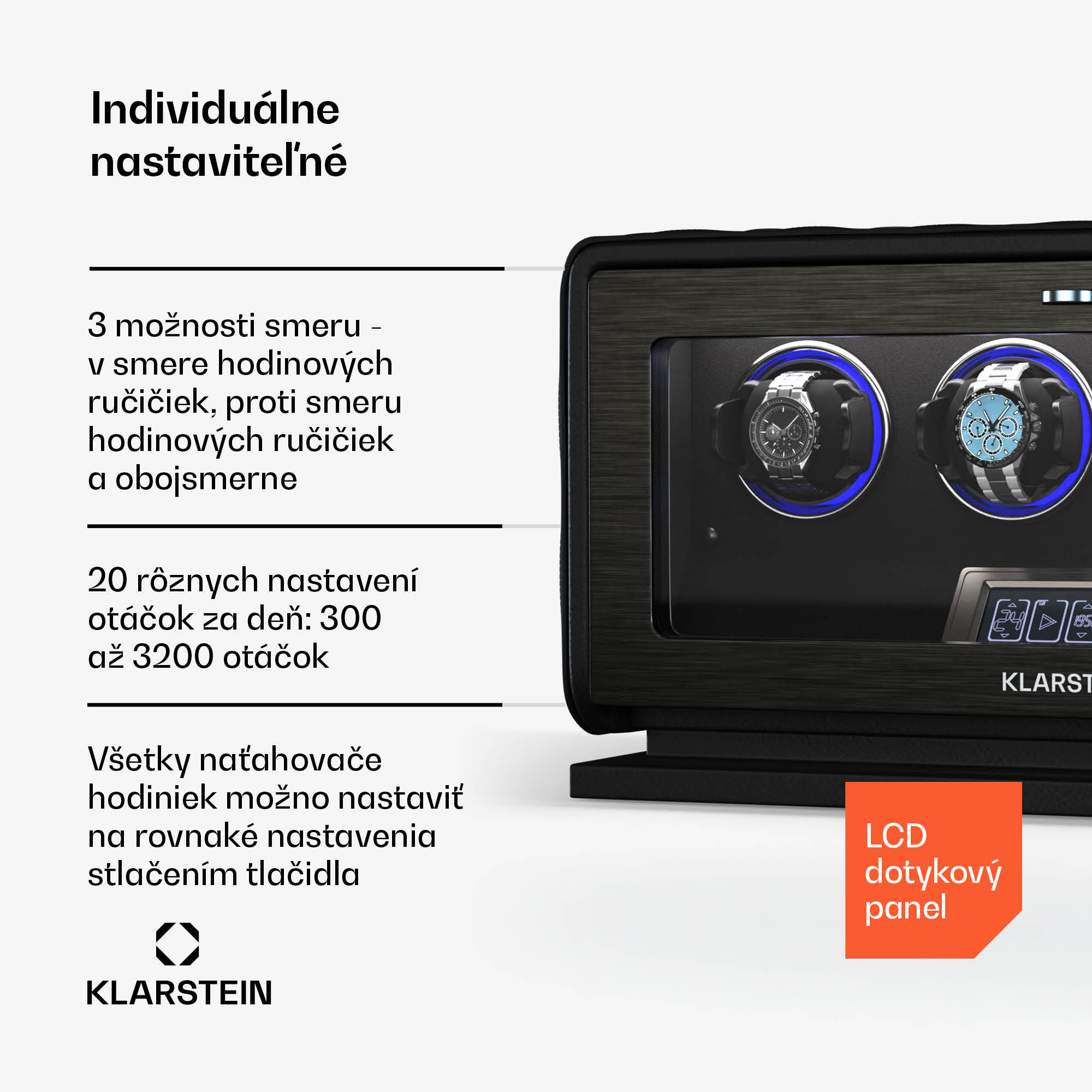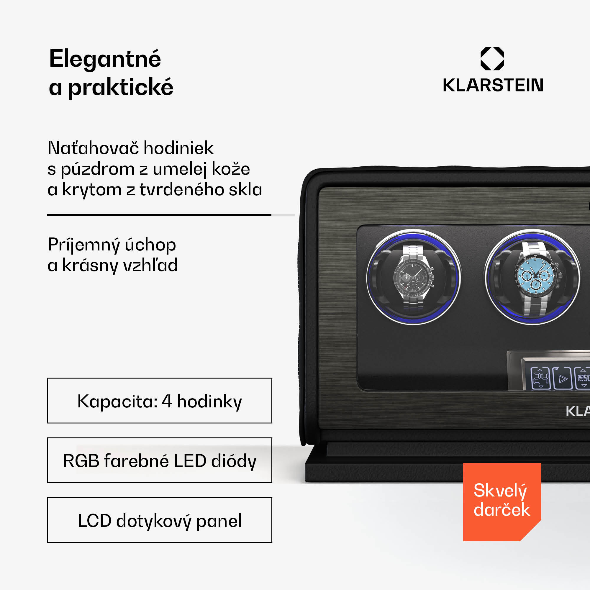 Naťahovač hodiniek   Klarstein  LuminousTime ponúka luxusné a tiché riešenie, vďaka ktorému budú vaše automatické hodinky vždy pripravené na použitie. Naťahovač hodiniek a stojan na hodinky LuminousTime od spoločnosti  Klarstein  zaujme elegantným dizajnom z vegánskej kože a tvrdeného skla v kombinácii s ozdobami z nehrdzavejúcej ocele. Tichý japonský motor zaručuje nehlučnú prevádzku, ktorá je ideálna do spální a kancelárií. Vďaka flexibilným vankúšikom sa prispôsobí väčšine hodiniek a ovláda sa pomocou dotykového LCD panela alebo diaľkového ovládača. Vďaka 20 rôznym nastaveniam TPD a trom smerom otáčania môžete zabezpečiť dokonalú starostlivosť o svoje mechanické hodinky. Integrované svetlá RGB a biele LED diódy tiež štýlovo prezentujú vaše hodinky. Klarstein  LuminousTime by sa mal prevádzkovať v pravidelných cykloch. Trpezlivo počkajte, kým sa naťahovač hodiniek po niekoľkých minútach zastaví, pretože sa spúšťa automaticky každú hodinu.Zažite dokonalú starostlivosť o svoje hodinky a kúpte si  naťahovač hodiniek  Klarstein  LuminousTime už teraz!