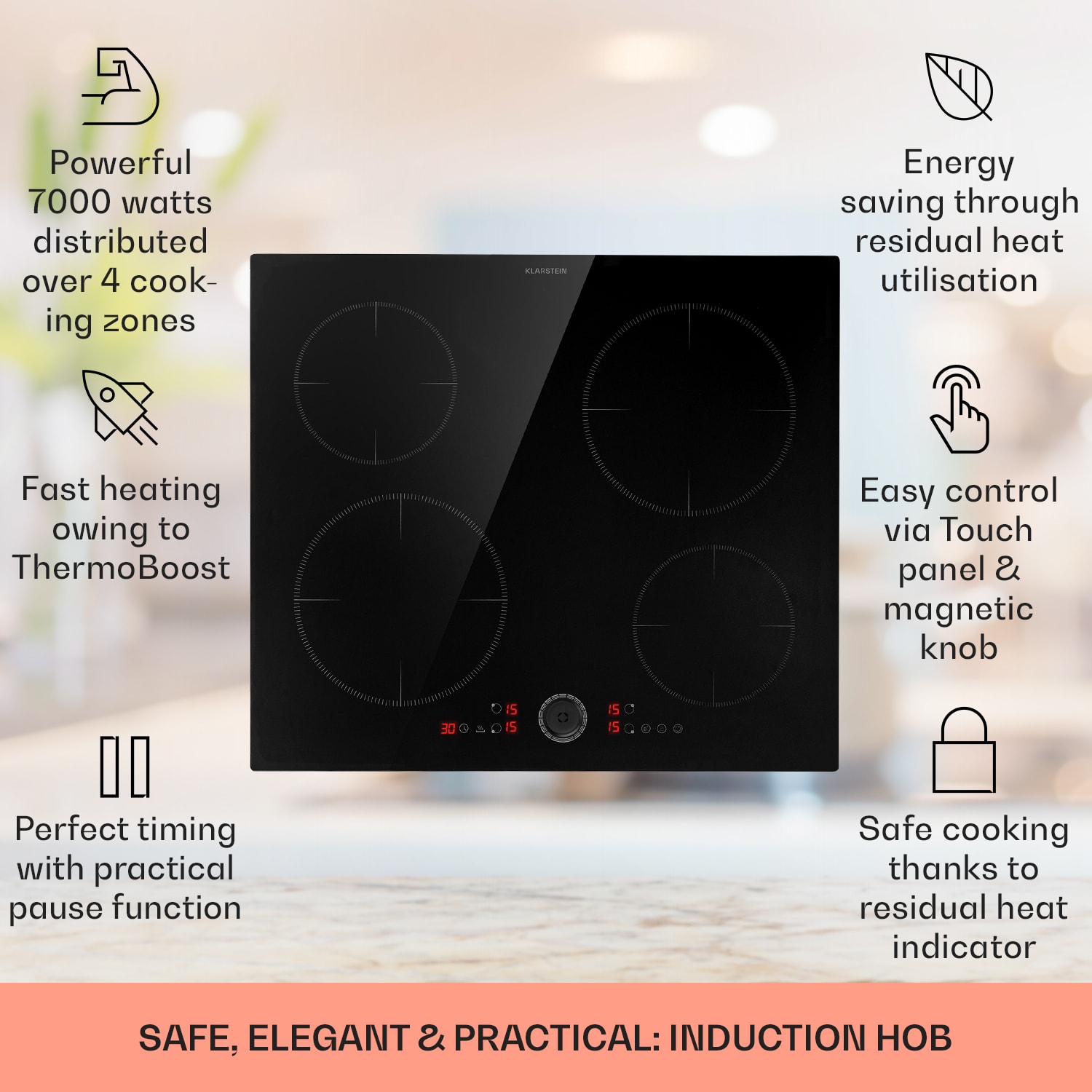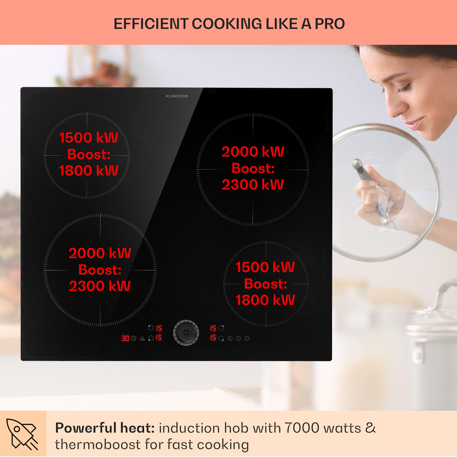 Jednoducho flexibilnejšie varenie: Indukčná varná doska Magnichef 4 od Klarstein umožňuje optimálne využitie priestoru s minimálnou spotrebou energie počas varenia. Spája technické inovácie s luxusným vzhľadom a vďaka sklokeramickému povrchu prináša kuchynskej linke nový lesk. Okrem toho ponúka vstavaná varná doska vysokú úroveň bezpečnosti: ochranu proti prehriatiu, detekciu hrnca, ukazovateľ zvyškového tepla, funkciu udržiavania teploty, automatické vypnutie a detskú poistku. Obsluha je nenáročná a vykonáva sa kompletne pomocou dotykového ovládacieho panela a magnetického gombíka. Zlatý klinec: odnímateľný magnetický regulátor na jednoduché čistenie a ako detská poistka