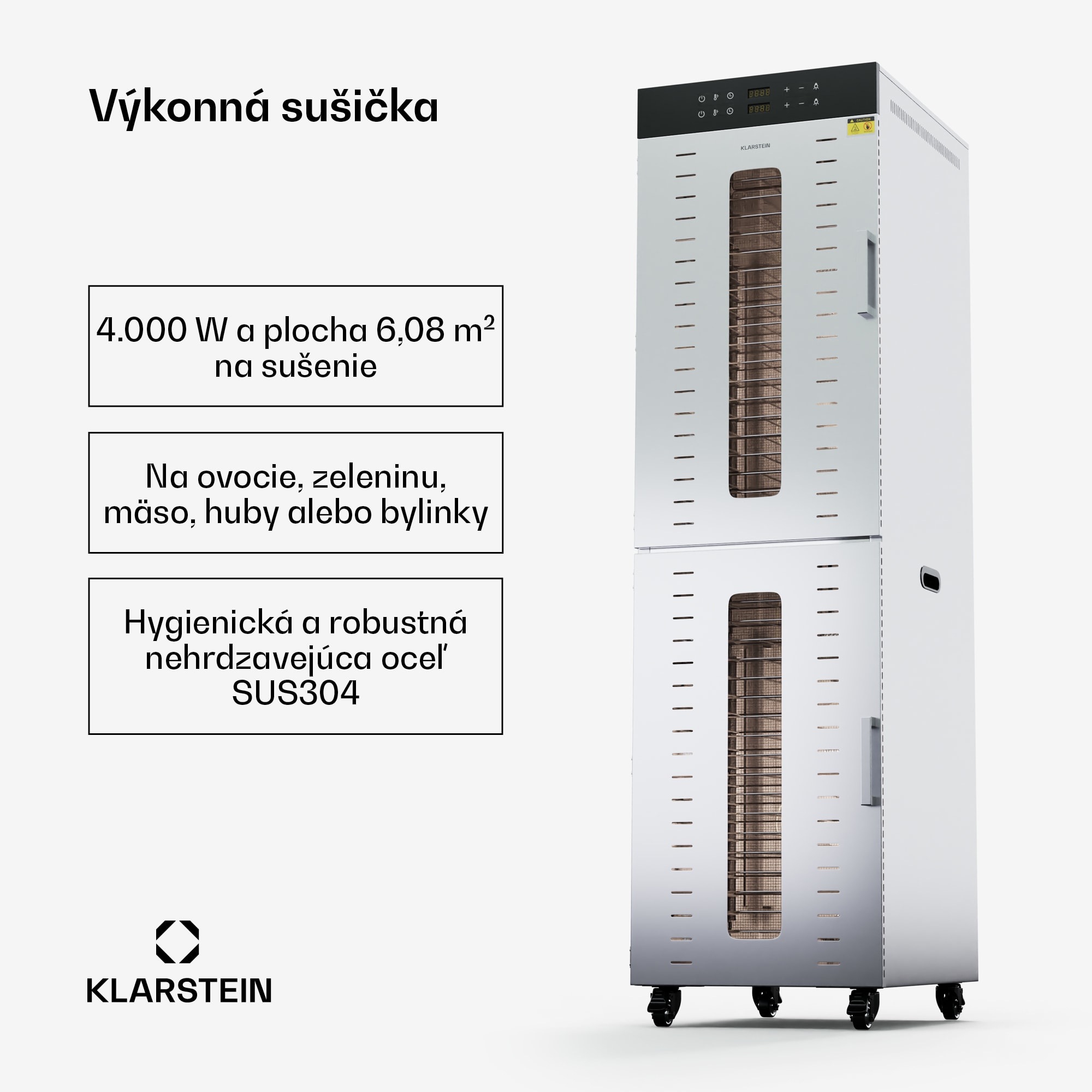Výkonná sušička potravín Klarstein MasterJerky 600 suší ovocie, zeleninu, mäso a ďalšie potraviny rekordnou rýchlosťou. To znamená, že si môžete sami pripraviť chutné občerstvenie a prísady s dlhou životnosťou za krátky čas. Či už sušené ovocie bohaté na vitamíny, ako sú jablkové a banánové lupienky, alebo zdravá zelenina, ako sú sušené paradajky. Master Jerky 600 má pre každú potravinu tú správnu teplotu sušenia.Sušička Klarstein Master Jerky 600 so svojím enormným tepelným výkonom 4 000 W a rovnomernou distribúciou tepla vďaka 6 ventilátorom (tri v každej komore) zaisťuje optimálne sušenie potravín a krátku dobu sušenia. Každá zo 40 vyberateľných políc z nehrdzavejúcej ocele ponúka 40 x 38 cm priestoru pre celkovú plochu až 6,08 m². Mimoriadne praktické sú dve oddelené komory na sušenie, ktoré možno ovládať nezávisle od seba. Ideálne podmienky na profesionálne sušenie, napr. v špecializovaných obchodoch na sušené hovädzie mäso, čaje alebo sušené ovocie. Pre flexibilnú prípravu rôznych jedál je možné na dotykovom ovládacom paneli nastaviť teplotu od 30 do 90 °C. Časovač do 24 hodín tiež zaručuje optimálne zladenie s vlastnosťami potravín, ktoré sa majú sušiť.Vďaka plne automatickému procesu sušenia s presným dodržiavaním teploty všetko funguje perfektne. Dôležité živiny a vitamíny sa zachovajú a chuť sa ešte zvýrazní. MasterJerky 600 je samozrejme vhodná aj na výrobu sušených kvetov do aranžmánov alebo na šetrnú extrakciu sušených bylín a čajov.Čistenie sušičky Klarstein MasterJerky 600 po dokončení procesu sušenia je úplne jednoduché: odkvapkávacie misky a vložky z nehrdzavejúcej ocele možno jednoducho opláchnuť alebo vyčistiť v umývačke riadu. Kryt z nehrdzavejúcej ocele sa jednoducho utiera a vďaka kolieskam sa dá ľahko premiestňovať.