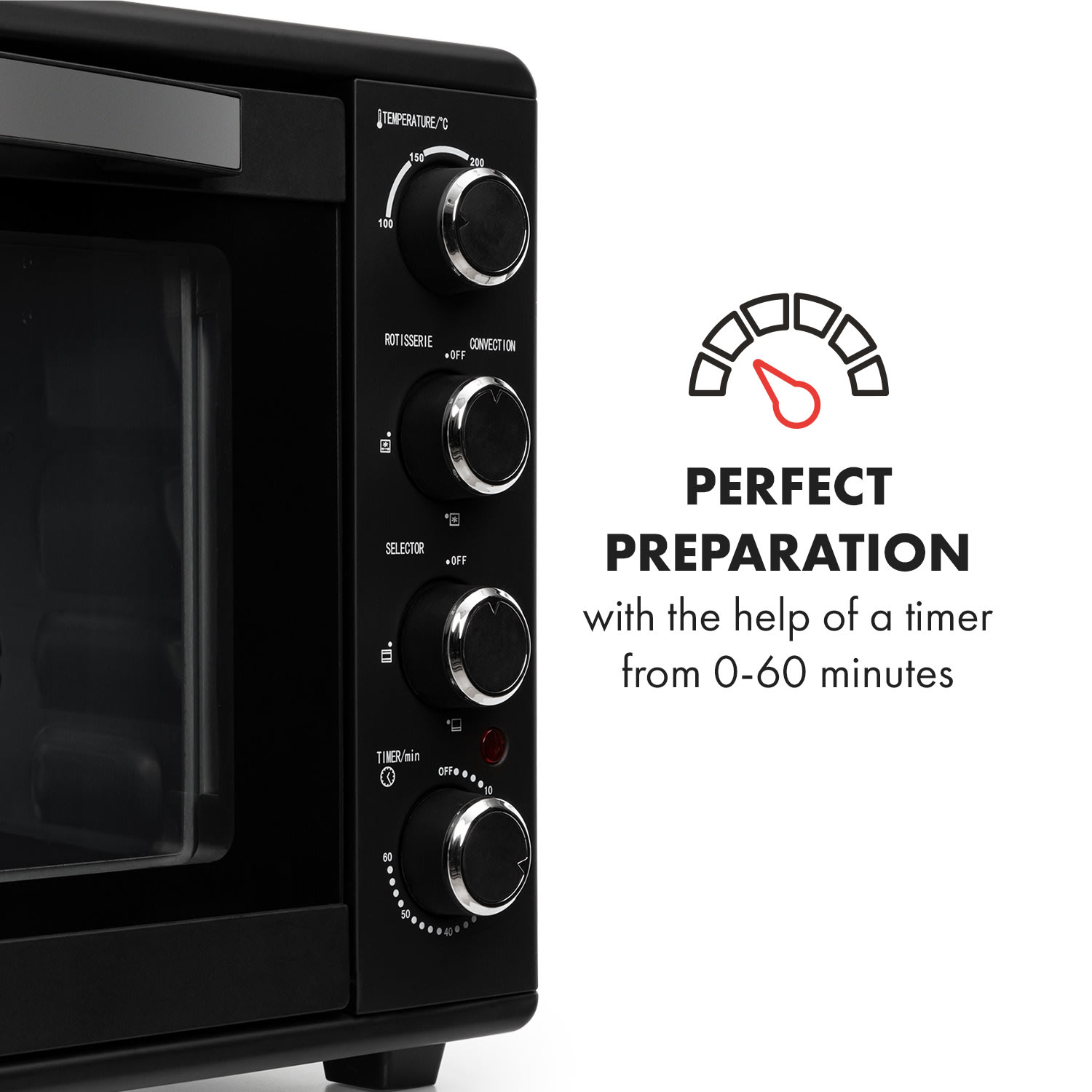 Mini rúra Klarstein Masterchef 60 je priestorovo úsporným rozšírením do všetkých maličkých kuchýň a mini domácností. Pizza, koláč alebo pečené kurča – tento šéfkuchár s výkonom 2000 W splní všetky požiadavky a vďaka zaujímavej konštrukcii z ušľachtilej ocele pritom zároveň vždy dobre vyzerá! Na obsluhu priestrannej rúry s objemom 60 litrov sa používajú štyri zrozumiteľné otočné regulátory. Regulátor teploty umožňuje plynulý výber teploty pečenia od 100 do 230 °C. Regulátor prevádzky vyberá medzi režimom s cirkuláciou vzduchu, grilovacím špízom alebo kombinovanou prevádzkou. Keď je aktivovaná rotácia špízu, kurča, gyros, rolky alebo bravčové stehno získajú šťavnaté chrumkavé pripečenie. 3-stupňový regulátor funkcií určuje, či sa má používať horný ohrev, spodný ohrev alebo oboje súčasne. V neposlednom rade Vás integrovaný časovač od 0 do 60 minút po uplynutí času upozorní výstražným tónom a tým uľahčuje prípravu časovo kritických jedál. Okrem špízu na grilovanie je súčasťou balenia mini rúry Klarstein Masterchef 60 aj plech na pečenie a grilovací rošt. Pre dokonalé umiestnenie sú k dispozícii štyri úrovne vloženia roštu.Silný výkon v kompaktnom dizajne, veľa praktických funkcií na prípravu jedál a robustná skriňa z ušľachtilej ocele: mini rúra Masterchef 60 od spoločnosti Klarstein.