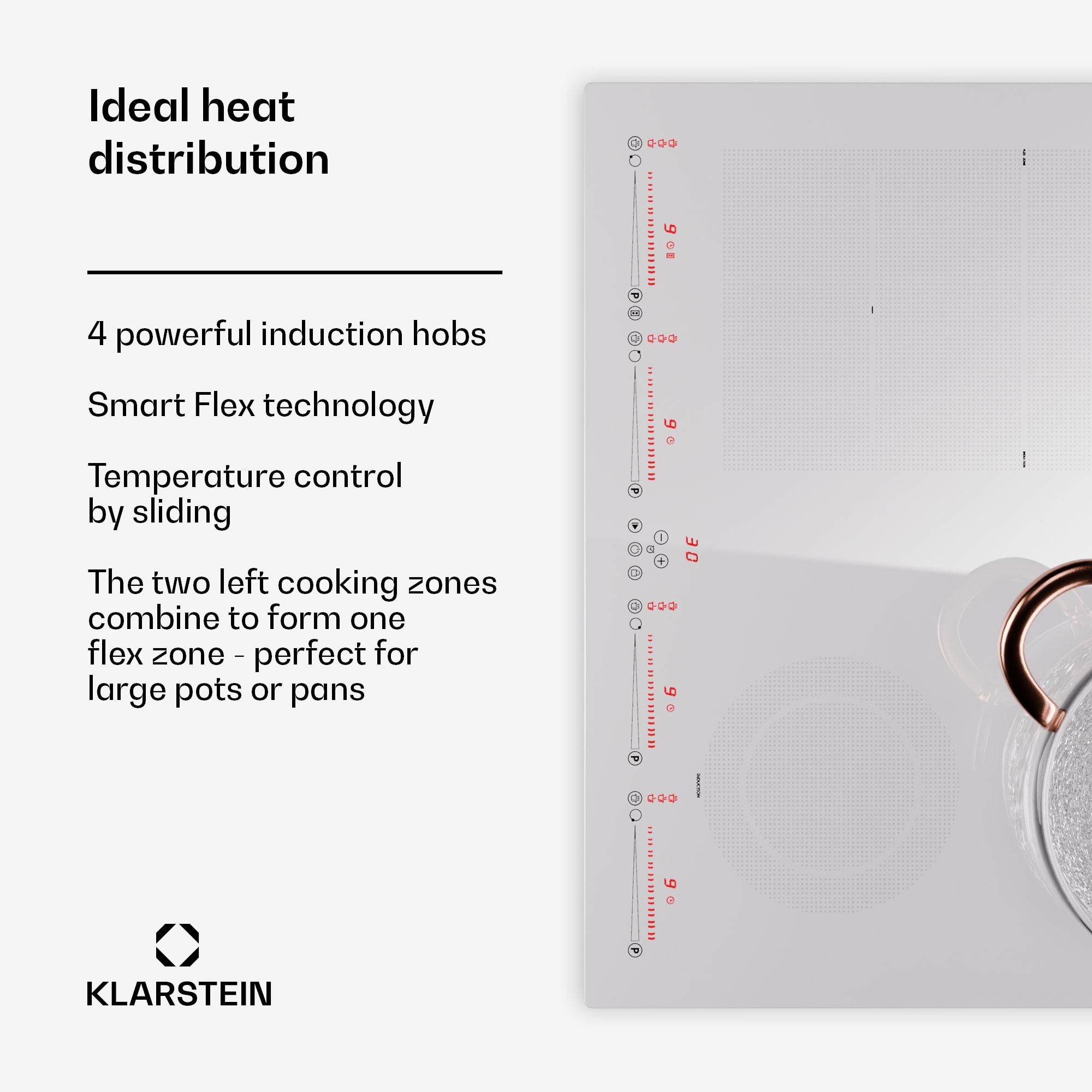 Indukčná varná doska Klarstein Masterzone 60 Hybrid nanovo definuje varenie. Na pravej strane varnej dosky sú dve pevné varné zóny, zatiaľ čo na ľavej strane je integrovaná flexi zóna s automatickým prispôsobením veľkosti hrnca a technológiou Smart Flex. Teplota sa reguluje automaticky jednoduchým posúvaním panvice dopredu a dozadu. Túto prelomovú funkciu je možné kedykoľvek aktivovať alebo deaktivovať klepnutím na ikonu na varnej doske.So štyrmi varnými zónami a celkovým výkonom 7000 W ponúka varná doska všestranné možnosti varenia. Hladký sklokeramický povrch sa ľahko čistí a bezpečnostné funkcie, ako je ochrana proti prehriatiu a automatické vypnutie, zabezpečujú bezpečné varenie. Funkcia Simmer umožňuje nepretržité varenie pri nízkej teplote, ideálne na dusenie alebo roztopenie. Posuvný dotykový ovládací panel umožňuje nastaviť výkon 9600 W s funkciou Boost a zabezpečuje presnú reguláciu teploty.Elegantný dizajn so sklokeramickým povrchom sa hodí do každej kuchyne nielen esteticky, ale aj funkčne. Flexi zóna umožňuje použitie väčších hrncov a panvíc. Ďalšie funkcie, ako napríklad senzor panvice, funkcia pauzy a detský zámok, zvyšujú komfort obsluhy Indukčná varná doska Klarstein Masterzone 60 Hybrid je kompatibilná s rôznymi materiálmi, nie je však vhodná pre hliník, meď, sklo alebo žiaruvzdorné sklo. Dokonalá kombinácia inovácie, výkonu a elegancie pre náročných domácich kuchárov.Upozornenie: Farba produktu sa môže mierne líšiť od zobrazenia na fotografii.