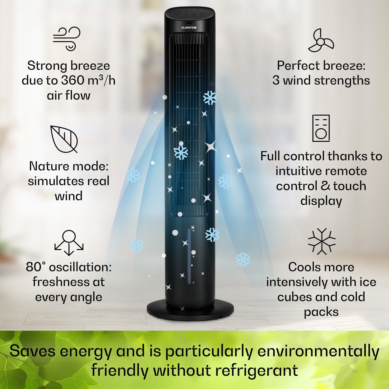 Chladivé osvieženie v horúcich dňoch: Ochladzovač vzduchu 5 v 1 Mistral od Klarstein vám spoľahlivo poskytne osviežujúci prúd vzduchu a naopak v chladných dňoch vás presvedčí aj svojimi praktickými funkciami zvlhčovača vzduchu a čističky vzduchu.Tri stupne intenzity vetra a tri prevádzkové režimy poskytujú rozmanité, na telo zamerané osvieženie ako ventilátor. Zapínateľná 80° oscilácia tiež rozprúdi čerstvý vzduch k viac ako jednej osobe. Ak použijete aj ochladzovač vzduchu, budete mať k dispozícii chladenie pri akejkoľvek činnosti. Dva vymeniteľné chladiace balíčky do nádrže na vodu môžu tento efekt ešte zvýšiť. Akoby to nestačilo, v zime poskytuje úľavu od suchého vzduchu ako zvlhčovač a odstraňuje čiastočky nečistôt a zápachu ako ionizátor. Obsluhuje sa prostredníctvom ovládacieho panela alebo diaľkového ovládaniaVýkonný, efektívny a ekologický: 5-v-1 ochladzovač vzduchu Mistral od Klarstein.