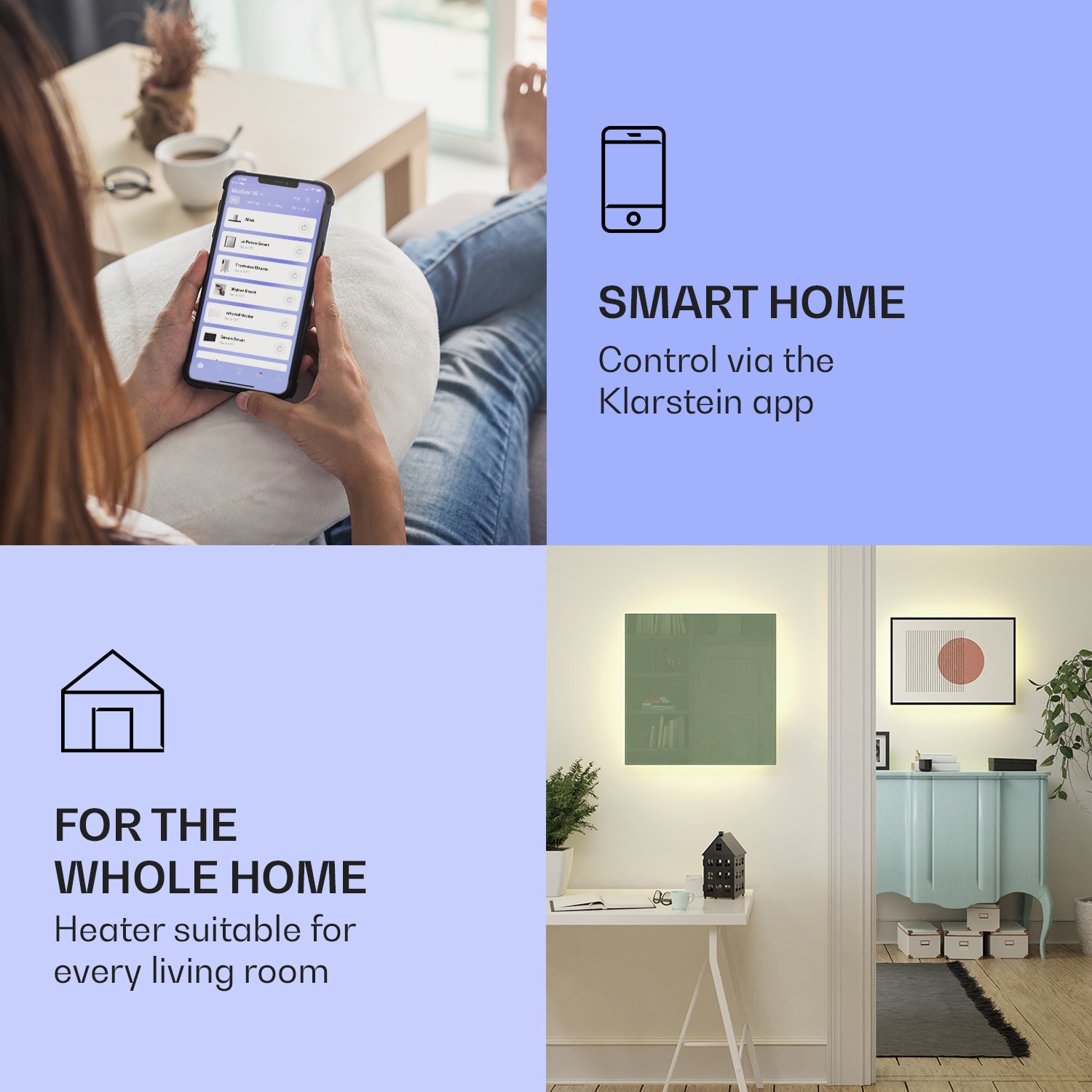 Dvojitý výkon pri rovnakej veľkosti, Klarstein Mojave ohrievače 2 v 1 šikovne kombinujú infračervený sálavý ohrievač s konvektorom a tým nielen rýchlo vytvárajú citeľné infračervené teplo v priestorovo úspornom dizajne, ale vytvárajú aj príjemne teplý vzduch v miestnosti prostredníctvom tepla stúpajúceho zo zadnej strany. V závislosti od veľkosti miestnosti si môžete vybrať ohrievač s výkonom 500, 750, alebo 1000 W. Termostat, ktorý možno nastaviť v stupňoch, a týždenný časovač sa ovládajú veľmi inteligentne prostredníctvom aplikácie Klarstein alebo diaľkovým ovládaním. Vďaka ochrannej triede IP44 sú konvektory ideálne aj do kúpeľne. Nezáleží na tom, kam zavesíte svoj nový vykurovací panel Klarstein Mojave Smart, so svojím farebným ambientným svetlom RGB vytvorí tú správnu atmosféru, nech ste kdekoľvek.
