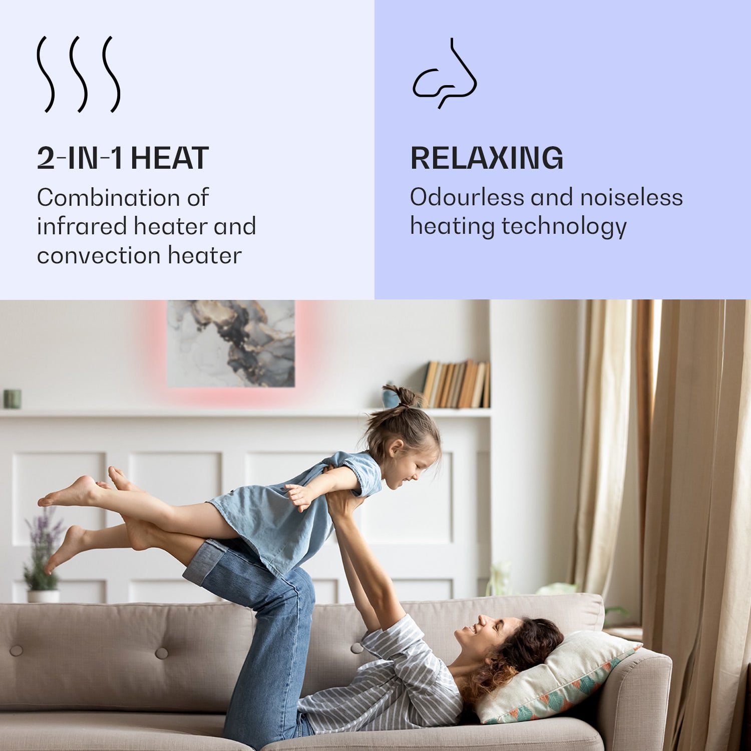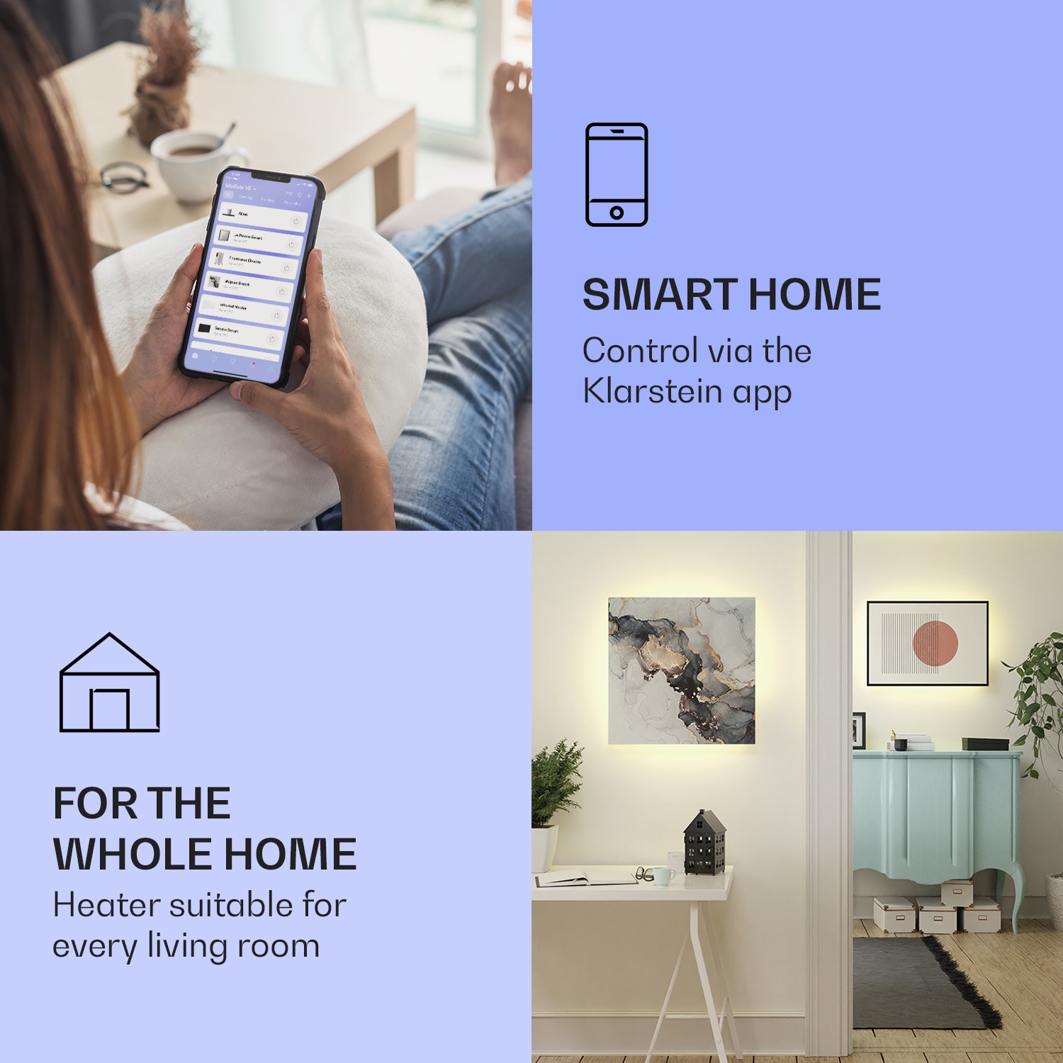 Dvojitý výkon pri rovnakej veľkosti, Klarstein Mojave ohrievače 2 v 1 šikovne kombinujú infračervený sálavý ohrievač s konvektorom a tým nielen rýchlo vytvárajú citeľné infračervené teplo v priestorovo úspornom dizajne, ale vytvárajú aj príjemne teplý vzduch v miestnosti prostredníctvom tepla stúpajúceho zo zadnej strany. V závislosti od veľkosti miestnosti si môžete vybrať ohrievač s výkonom 500, 750, alebo 1000 W. Termostat, ktorý možno nastaviť v stupňoch, a týždenný časovač sa ovládajú veľmi inteligentne prostredníctvom aplikácie Klarstein alebo diaľkovým ovládaním. Vďaka ochrannej triede IP44 sú konvektory ideálne aj do kúpeľne. Nezáleží na tom, kam zavesíte svoj nový vykurovací panel Klarstein Mojave Smart, so svojím farebným ambientným svetlom RGB vytvorí tú správnu atmosféru, nech ste kdekoľvek.