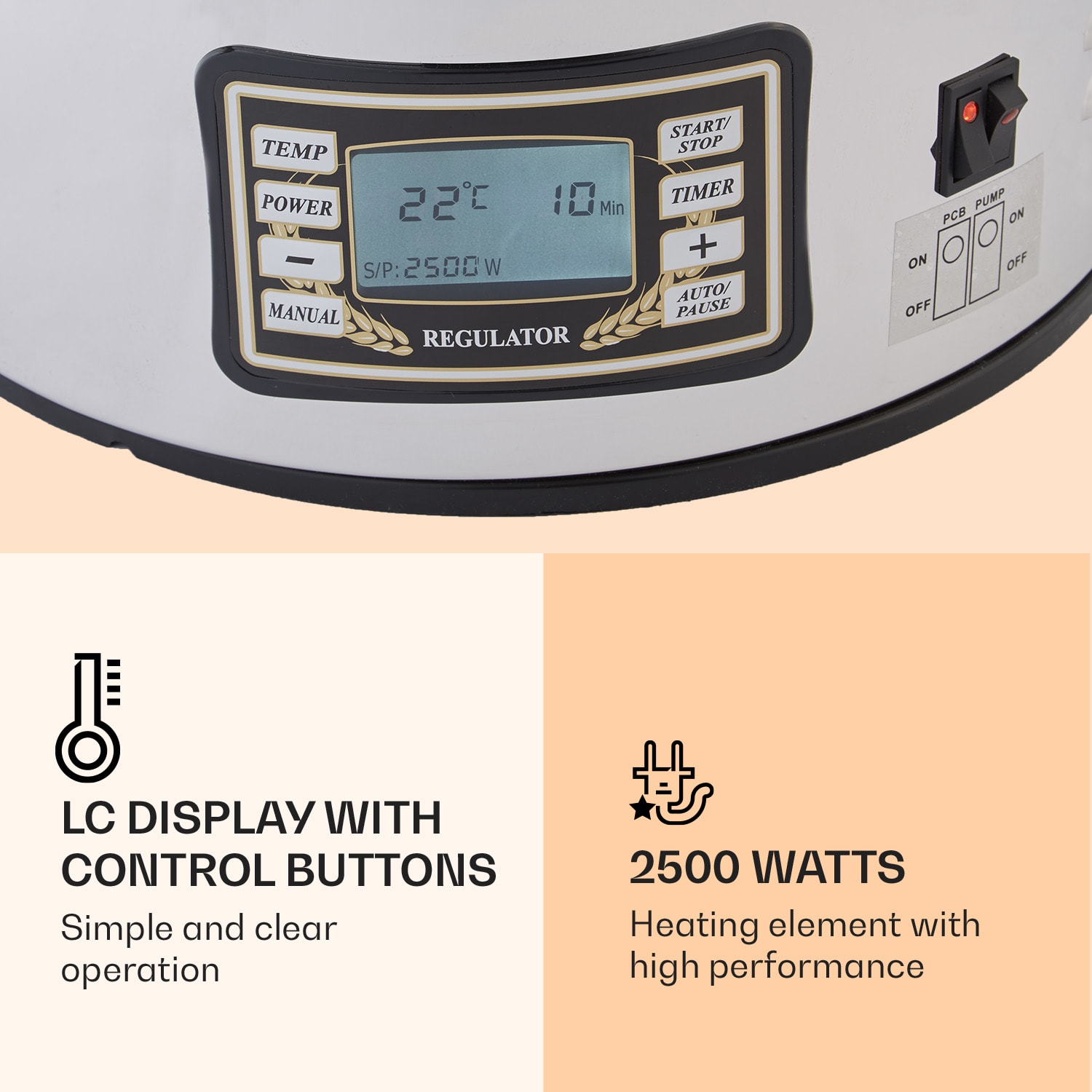 Či už ide o svetlé alebo tmavé, vrchne alebo spodne kvasené, pšeničné alebo plzenské pivo, Klarstein Mundschenk rmutovací kotol je kompletný balík na varenie piva – poskytuje domácemu pivovaru tú správnu originálnu mladinu. Na prehľadnom LCD displeji s ovládacími tlačidlami môžete presne nastaviť teplotu, čas varenia a výkon, alebo môžete celý proces prenechať na automatické ovládanie MemoryBrew-. Čerstvé pivo z vlastného domáceho pivovaru? Nie je nič jednoduchšie: s kotlom na varenie Klarstein Mundschenk Upozornenie: V Nemecku sa varenie piva musí nahlásiť príslušnému hlavnému colnému úradu.