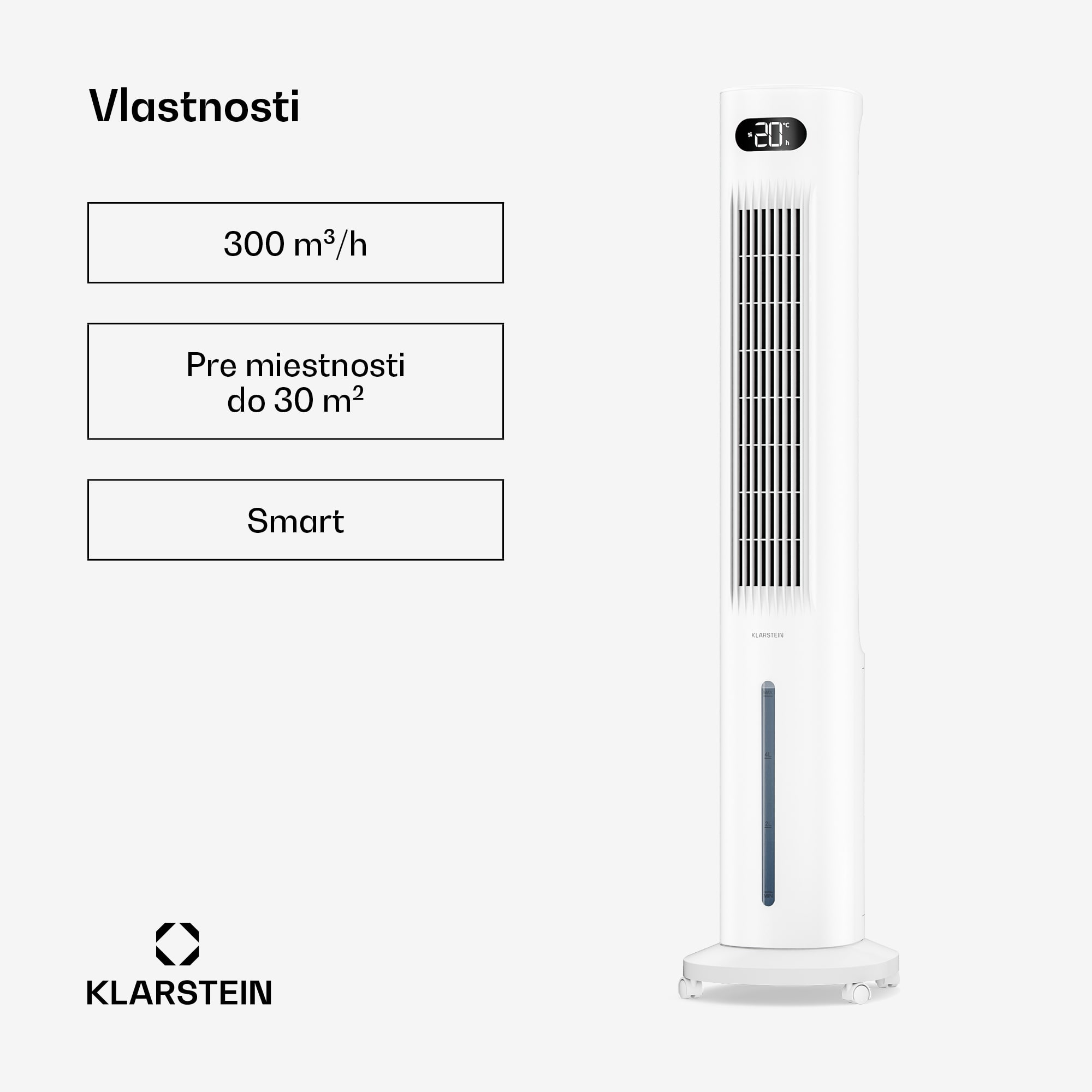 Ochladzovač vzduchu s vodným chladením Klarstein Polar kombinuje vysoký výkon s inteligentnou a pohodlnou obsluhou. Chladí miestnosti s plochou až 30 m² s prietokom vzduchu 300 m³/h, dvoma chladiacimi balíkmi, tromi úrovňami výkonu a tromi režimami. Zariadenie je možné ovládať buď diaľkovým ovládačom, priamo na zariadení, cez aplikáciu alebo pomocou asistenta inteligentnej domácnosti, ako je Google Home alebo Alexa.24-hodinový časovač a integrovaný nočný režim vždy zaručujú optimálne nastavenie doby prevádzky, ako aj obzvlášť pohodlnú obsluhu. Chladič je navyše vybavený odnímateľnou 5-litrovou nádržou na vodu.