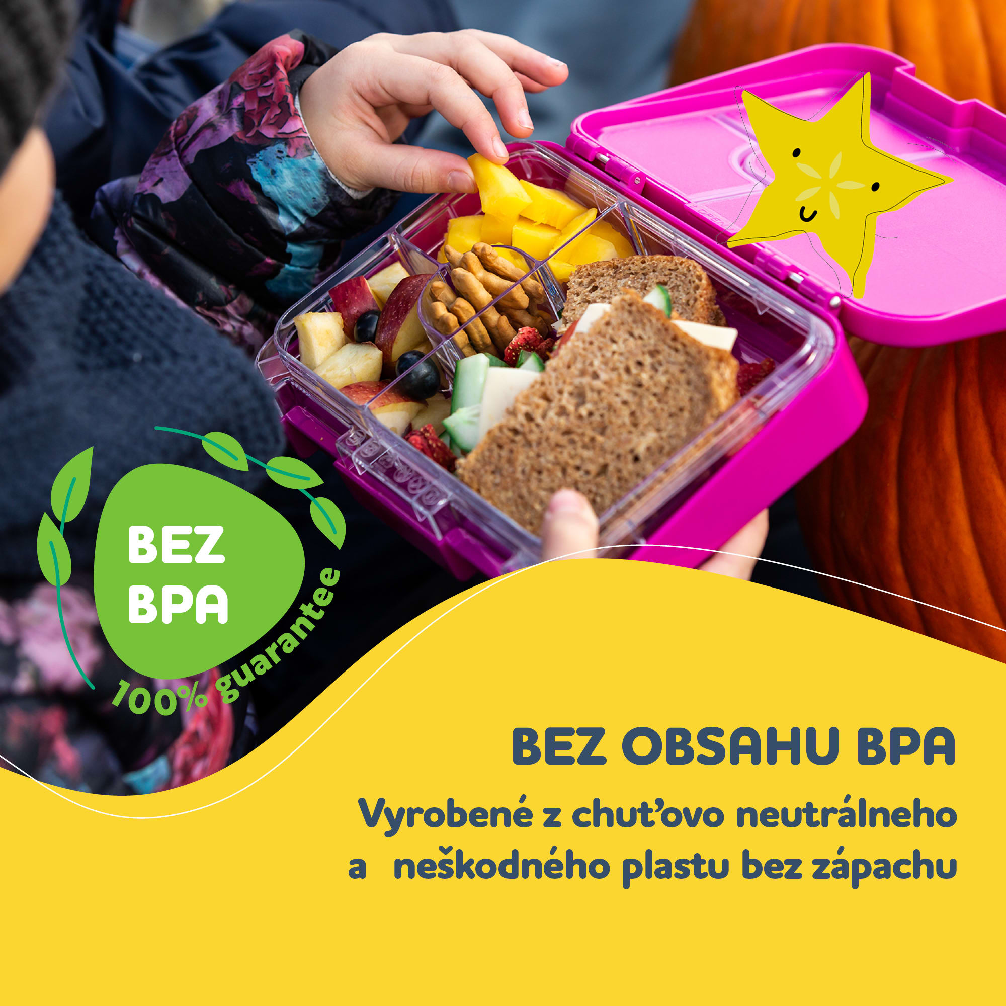 >Desiatový box Schmatzfatz Junior s praktickým delením je ideálnym spoločníkom pre deti do školy, škôlky či na výlety. Vďaka dvom vkladacím častiam – jednej so 4 priehradkami a druhej s 2 priehradkami – umožňuje pohodlne oddeliť rôzne druhy potravín. Ovocie, zelenina, pečivo či jogurt si tak zachovajú svoju chuť, štruktúru aj čerstvosť bez miešania aróm.>Vnútorné veko so silikónovým tesnením dokonale uzavrie každú priehradku zvlášť, čím zabráni vytekaniu aj hustejších pokrmov, ako je kaša či ovocné pyré. Spoľahlivé klipy na zatváranie udržia box pevne uzavretý aj počas pohybu – či už v batohu, školskej taške alebo na ihrisku.>Box je vyrobený z odolného plastového materiálu bez BPA, ktorý je zdravotne nezávadný a bezpečný pre každodenné používanie. Vnútorné priehradky je možné jednoducho vybrať a umyť v umývačke riadu, vďaka čomu je čistenie rýchle a pohodlné. Vonkajšiu časť stačí pretrieť vlhkou handričkou.>Farebný dizajn s veselými motívmi robí z tohto boxu nielen praktickú pomôcku, ale aj zábavnú súčasť každého detského dňa. S boxom Schmatzfatz Junior bude mať vaše dieťa vždy po ruke chutnú, pestrú a hygienicky oddelenú desiatu.