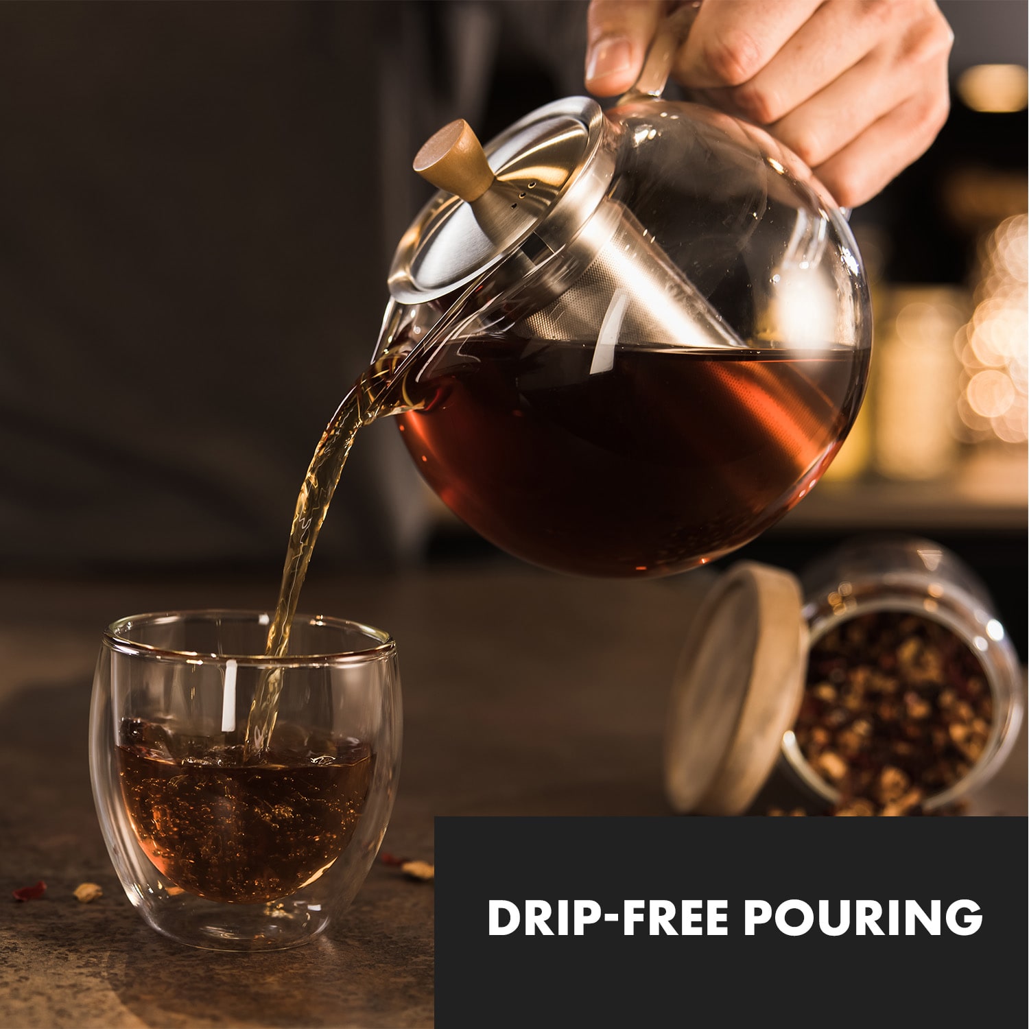 Pre neopakovateľný aromatický zážitok z čaju: užívajte si momenty relaxu s čajovou kanvicou od Klarstein s objemom 1,3 litra, sitkom z nehrdzavejúcej ocele a vyrobenú z odolného borosilikátového skla. Pod vekom z brúsenej, nehrdzavejúcej ocele s drevenou rukoväťou sa ukrýva vyberateľné a jemné sitko. Sypké a voľne kombinovateľné čajové zmesi sa v ňom zalievajú horúcou vodou a vďaka mimoriadne dlhému filtru môžu optimálne rozvinúť svoju arómu aj s malým množstvom vody. Po uplynutí požadovaného času lúhovania môžete vložku sitka ľahko vytiahnuť a vyčistiť pomocou priloženej rukoväte, zatiaľ čo dobre tvarovaná výlevka zaručuje nalievanie čerstvého čaju bez kvapkania. Vďaka žiaruvzdornému a odolnému borosilikátovému sklu môžete čajník jednoducho umiestniť na dodaný ohrievač a udržiavať ho teplý. Jedinečný pôžitok z čaju v atraktívnom dizajne: obohaťte svoj každodenný život o individuálne čajové kreácie v dizajnovej kanvici Sencha s ohrievačom na ibištekový čaj od Klarstein.