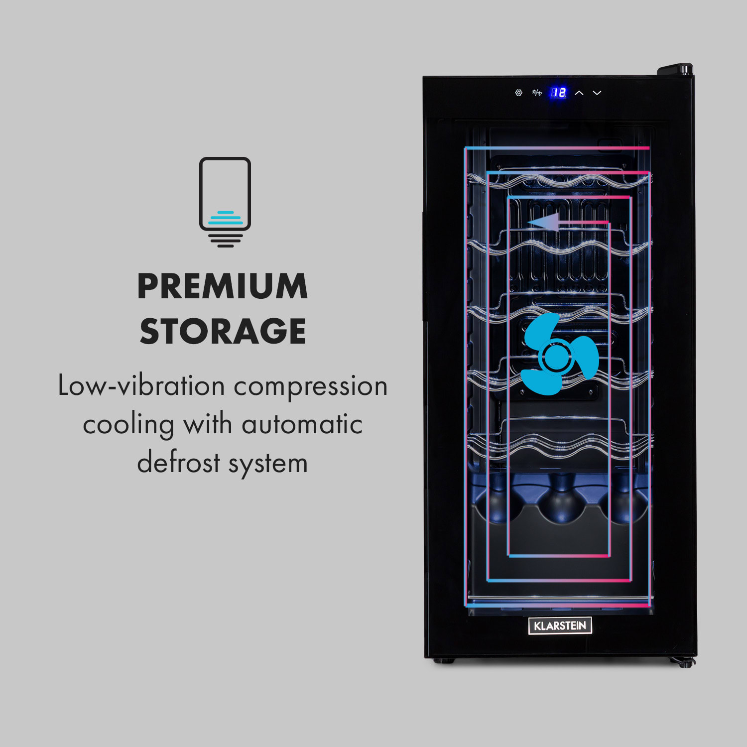 Z lásky k vínu: vinotéka Klarstein Shiraz 18 Uno zaibezpečuje ten najlepší pôžitok z vína tým, že fľašiam vína zabezpečí tú správnu teplotu na pitie. Táto vinotéka vyniká svojím tenkým dizajnom a perfektne sa zmestí aj do malých medzier. Môžete v nej optimálne uskladniť až 18 fliaš vína a vychladiť ich na teplotu medzi 5 až 18 °C. Predné dvierka z bezpečnostného skla vám umožňujú prezentovať ušľachtilé fľaše úžasným spôsobom.