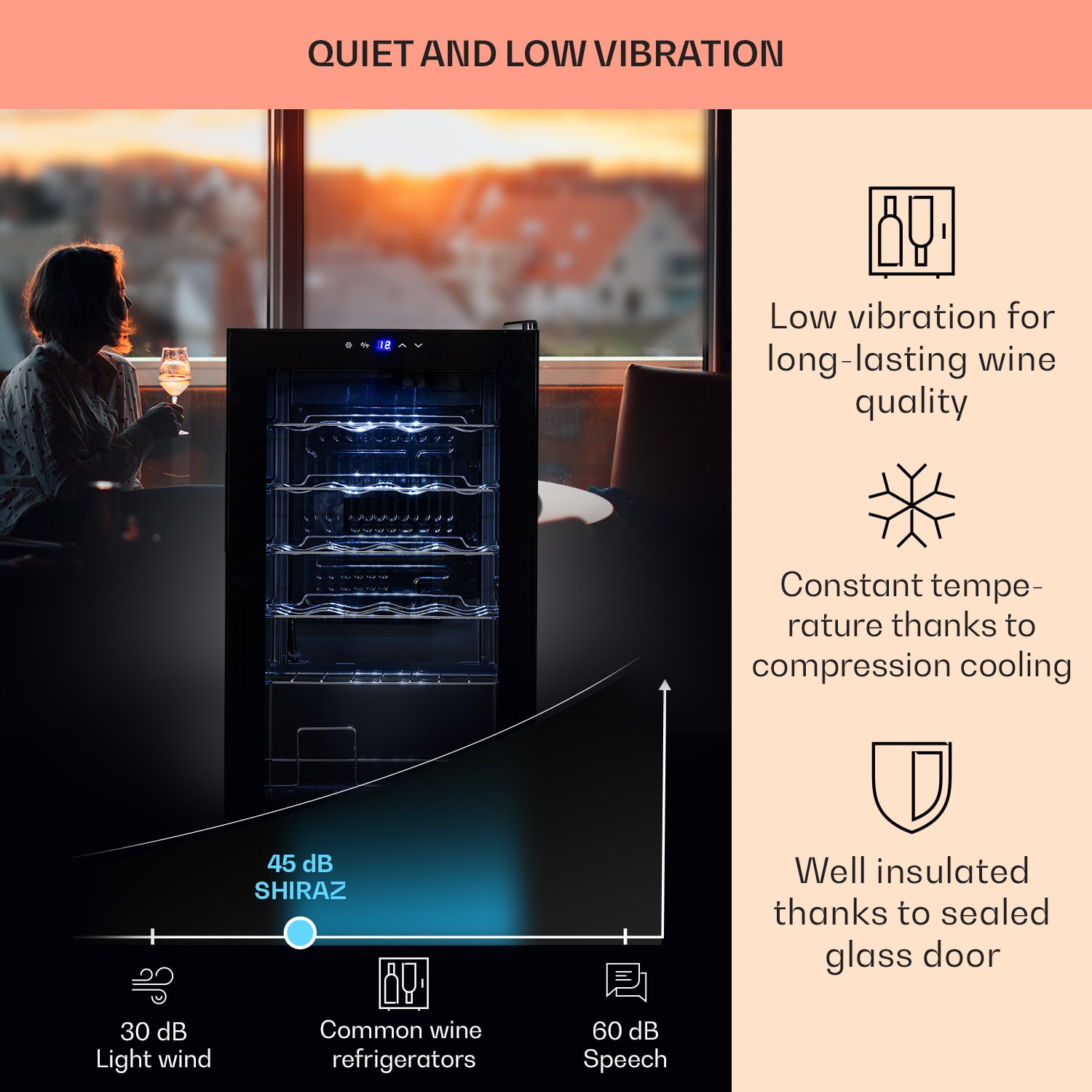 Z lásky k vínu: Vinotéka Klarstein Shiraz 24 Uno sa postará o ten najlepší pôžitok z vína tým, že fľašiam vína poskytne tú správnu teplotu na pitie. Táto vinotéka zároveň vyniká svojím štíhlym dizajnom a skvele sa hodí aj do malých priestorov. Môžete v nej optimálne skladovať až 24 fliaš vína a chladiť ich na teplotu od 5 do 18 °C. Predné dvere z bezpečnostného skla umožňujú nádhernú prezentáciu ušľachtilých fliaš.