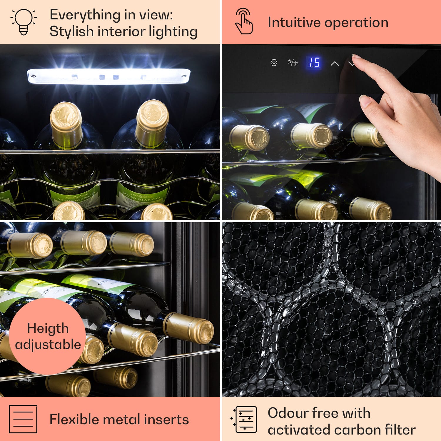 Pre lásku k vínu: Vinotéka Klarstein Shiraz 28 Uno zaisťuje najlepší pôžitok z vína tým, že poskytuje ušľachtilým vínam tú správnu teplotu pitia. Zároveň vyniká svojím kompaktným dizajnom a šikovne vytvára scénu pre víno – najmä vďaka predným dverám z bezpečnostného skla. Takto môžete dokonale prezentovať celkom 28 fliaš vína a atmosféricky ich prezentovať pomocou vnútorného osvetlenia. Táto vinotéka je ideálna pre každého, kto si chce vychutnať víno v jeho najlepšej podobe.Pre milovníkov a znalcov: Shiraz 28 Uno chladnička na víno od Klarstein je štýlovým úložným priestorom na víno, šumivé víno a iné nápoje.