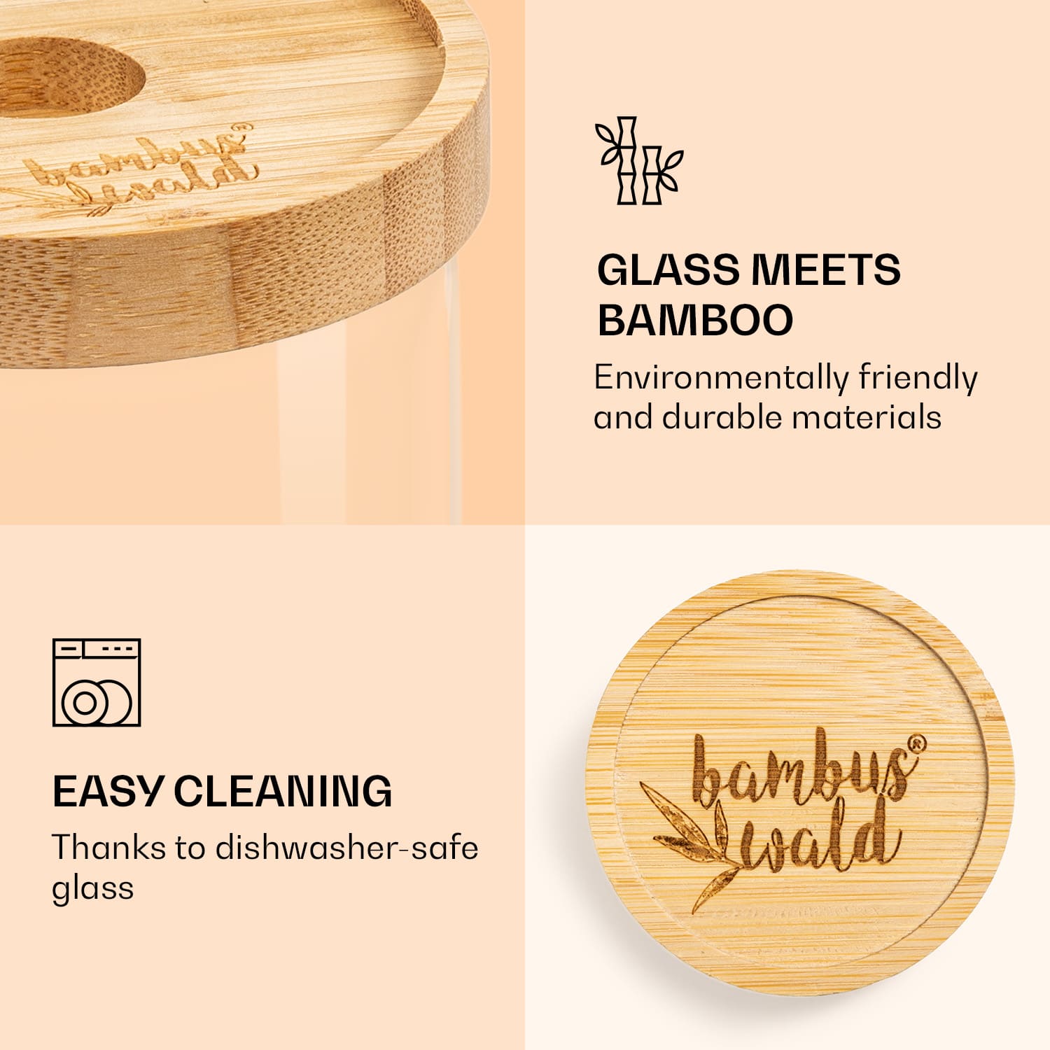 Ukladať a skladovať krajšie: so skladacou nádobou od Bambuswald už nemusíte Vaše nádoby ukrývať v skrinke, ale šikovne z nich urobte časť kuchynskej výbavy. Okrúhla skladovacia nádoba s praktickým uzáverom zo 100 % bambusu sa perfektne hodí na skladovanie cestovín, müsli, kávy, orechov, sušeného ovocia a pod. Vďaka silikónovému tesneniu je všetko vzduchotesne uzatvorené a udrží si dlho svoju chuť a vôňu. Okrem toho sú poháre ešte aj prakticky zložiteľné na seba. Na jednoduché čistenie ich bez uzáveru môžete dať do umývačky riadu.