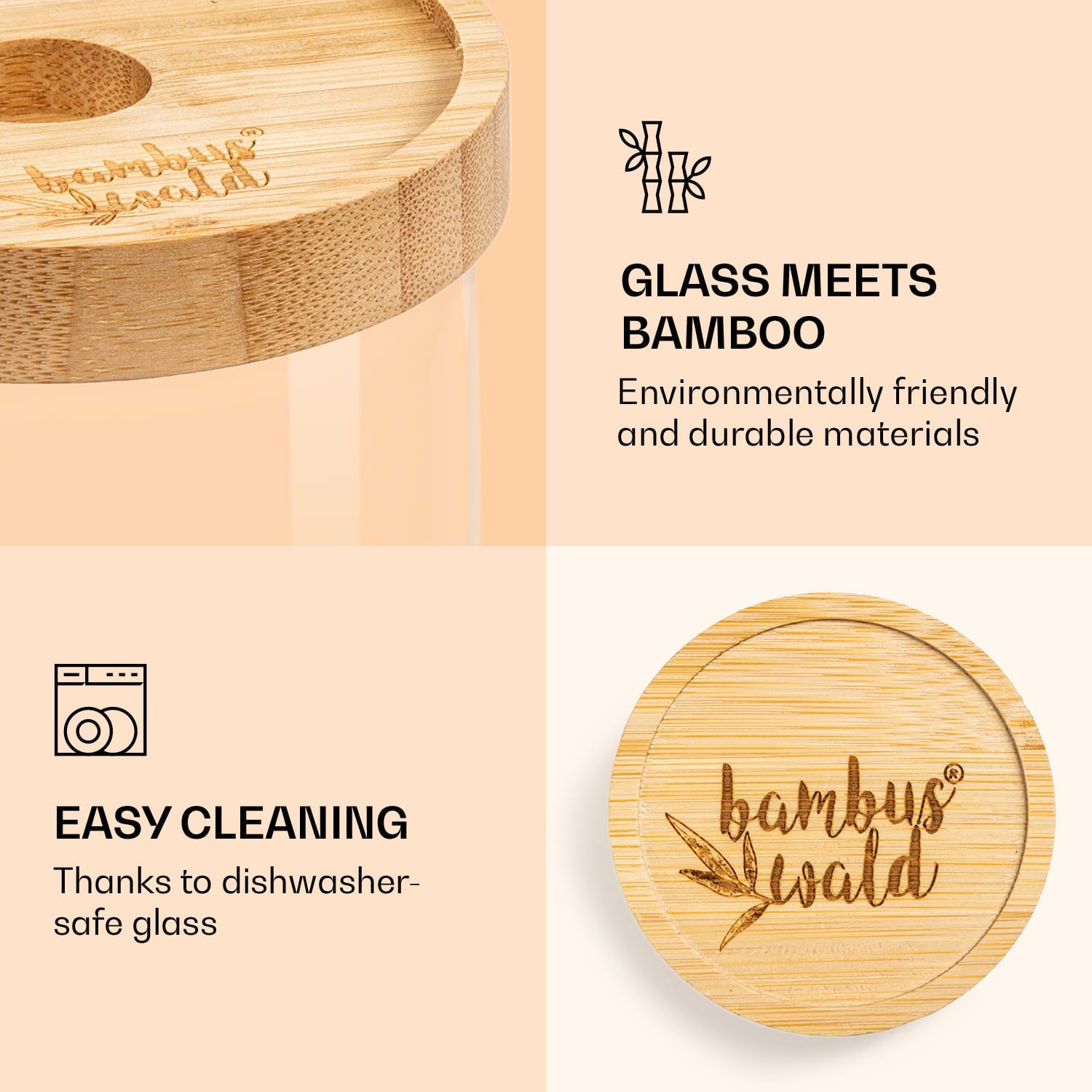 Ukladať a skladovať krajšie: so skladacou nádobou od Bambuswald už nemusíte Vaše nádoby ukrývať v skrinke, ale šikovne z nich urobte časť kuchynskej výbavy. Okrúhla skladovacia nádoba s praktickým uzáverom zo 100 % bambusu sa perfektne hodí na skladovanie cestovín, müsli, kávy, orechov, sušeného ovocia a pod. Vďaka silikónovému tesneniu je všetko vzduchotesne uzatvorené a udrží si dlho svoju chuť a vôňu. Okrem toho sú poháre ešte aj prakticky zložiteľné na seba. Na jednoduché čistenie ich bez uzáveru môžete dať do umývačky riadu.