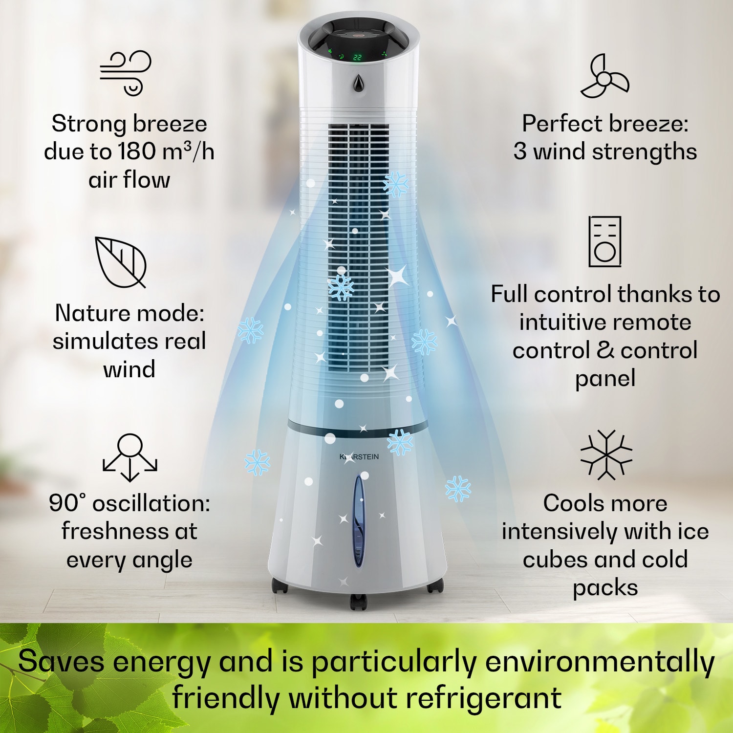 Štvornásobné osvieženie vďaka štýlovej ventilačnej veži: ochladzovač vzduchu 4-v-1 Klarstein Skyscraper Ice vám poskytne chladivý vánok s presnosťou na stupeň. Ako ventilátor, ochladzovač, čistička a zvlhčovač vzduchu zároveň.S vysokým prietokom vzduchu 210 m³/h uvádza Klarstein Skyscraper Ice do pohybu lenivý letný vzduch ako ventilátor v troch rýchlostiach. V kombinácii s funkciou ochladzovača vzduchu sa prúd vzduchu osviežuje odparovaním vody, ktorá sa dodatočne ochladzuje chladiacimi balíkmi. Vďaka tomu je Klarstein Skyscraper Ice užitočný ako zvlhčovač vzduchu aj v zime. Vertikálna a horizontálna oscilácia navyše umožňuje pohyb prúdu vzduchu. O lepšie dýchanie sa stará zabudovaný ionizátor , ktorý zo vzduchu účinne odstraňuje prachové častice a zápach. Vďaka zabudovaným podlahovým kolieskam je Klarstein Skyscraper Ice 4-v-1 ochladzovač vzduchu mimoriadne mobilný a odnímateľná nádrž na vodu umožňuje veľmi jednoduché plnenie, čistenie a vyprázdňovanie.Výkonný a všestranný: Ochladzovač vzduchu Klarstein Skyscraper Ice je osviežujúcim riešením pre všetky horúce dni v roku.