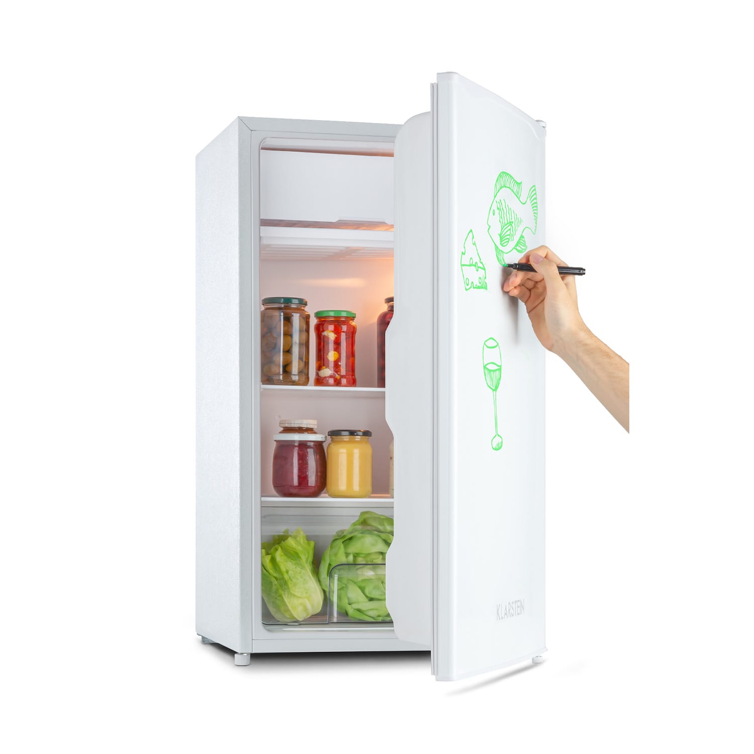 Studená a komunikatívna: ekologická chladnička Klarstein Spitzbergen Uni je nielen ideálnym miestom na uskladnenie čerstvých potravín v malých domácnostiach, ako sú internátne izby, apartmány jednotlivcov alebo záhradné domčeky, ale je zaujímavá aj svojou odkazovacou funkciou v kuchyni – či už ide o nákupné zoznamy, pozvánky alebo zaľúbené správy!Napriek svojim kompaktným rozmerom je chladnička Klarstein Spitzbergen Uni z hľadiska úložného priestoru dosť veľká. S kapacitou 91 litrov poskytuje dostatok priestoru pre širokú škálu potravín od jogurtov a syrov cez mäso až po zeleninu. Mimoriadne praktická: do 10 mraziacej časti môžete dlhodobo uskladniť mrazenú zeleninu, hranolky alebo pizzu. O dokonalú prehľadnosť čerstvých potravín sa postarajú dve sklenené regálové police, priečinok na zeleninu a tri bočné priehradky vo dverách. Vo dverách má zariadenie Spitzbergen Uni veľký držiak na nápoje a malú priehradku na vajíčka, marmelády, maslo atď. Vďaka štýlovému, úspornému a krištáľovo čistému LED svetlu vo vnútri zariadenia je možný vždy dokonalý prehľad o skladovaných potravinách. Veľmi pútavou a zaujímavou je chladnička Spitzbergen Uni predovšetkým vďaka predným dverám v dizajne ZestfulART Design. Na biely povrch je možné písať špeciálnymi fixkami a text potom znovu zotrieť. Vhodná fixka na všetky dôležité správy je súčasťou balenia. Kuchyňa získa úplne nové kúzlo.Vďaka triede energetickej účinnosti E je chladnička ekologická. Pomocou veľkého regulátora vo vnútri je možné teplotu nastaviť individuálne v piatich úrovniach.Energeticky úsporné zariadenie je prínosom pre každú malú domácnosť: chladnička Klarstein Spitzbergen Uni.