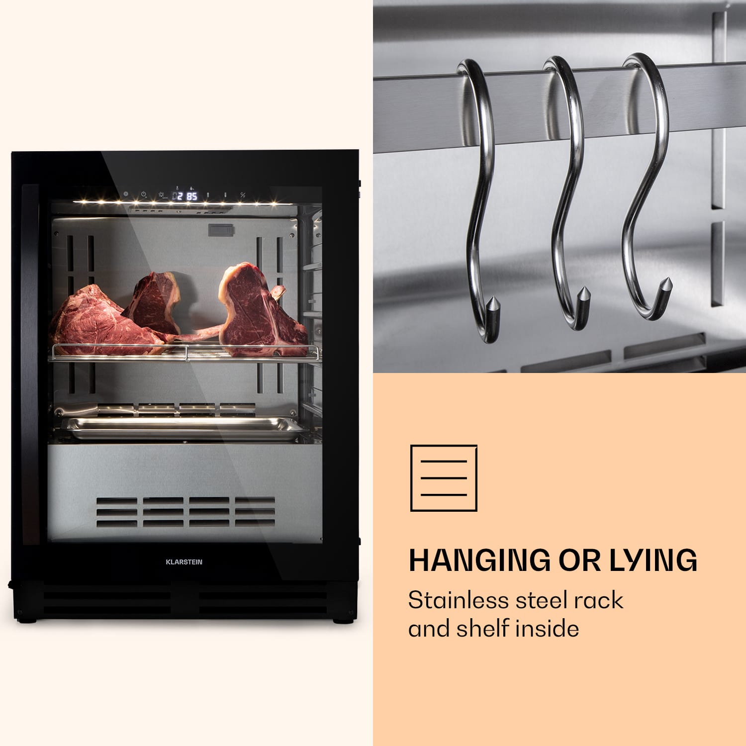 Správna zrelosť pre plný chuťový zážitok: v chladničke na zrenie mäsa Steakhouse Pro 98 Onyx od Klarstein zreje nielen mäso na steaky, ale aj saláma, šunka alebo suché bravčové mäso. Suché zrenie je jednou z najstarších a najosvedčenejších metód zušľachťovania mäsa. Vďaka chladničke na zrenie mäsa Steakhouse Pro 98 Onyx je táto metóda jednoducho dostupná. Špičková kvalita klobás a mäsa sa zušľachtí v tých najlepších podmienkach. Integrovaný systém UVC zabezpečuje antibakteriálnu čistotu vo vnútri. Všetky nastavenia vykonáte ľahko pomocou dotykového ovládacieho panela a proces zrenia prebieha v prístroji automaticky. Zapínateľné LED osvetlenie navyše prezentuje obsah chladničky. Práve to robí z chladničky na zrenie Steakhouse Pro 98 Onyx od Klarstein perfektné zariadenie na reprezentatívne vybavenie reštaurácií alebo lokálnych obchodov.