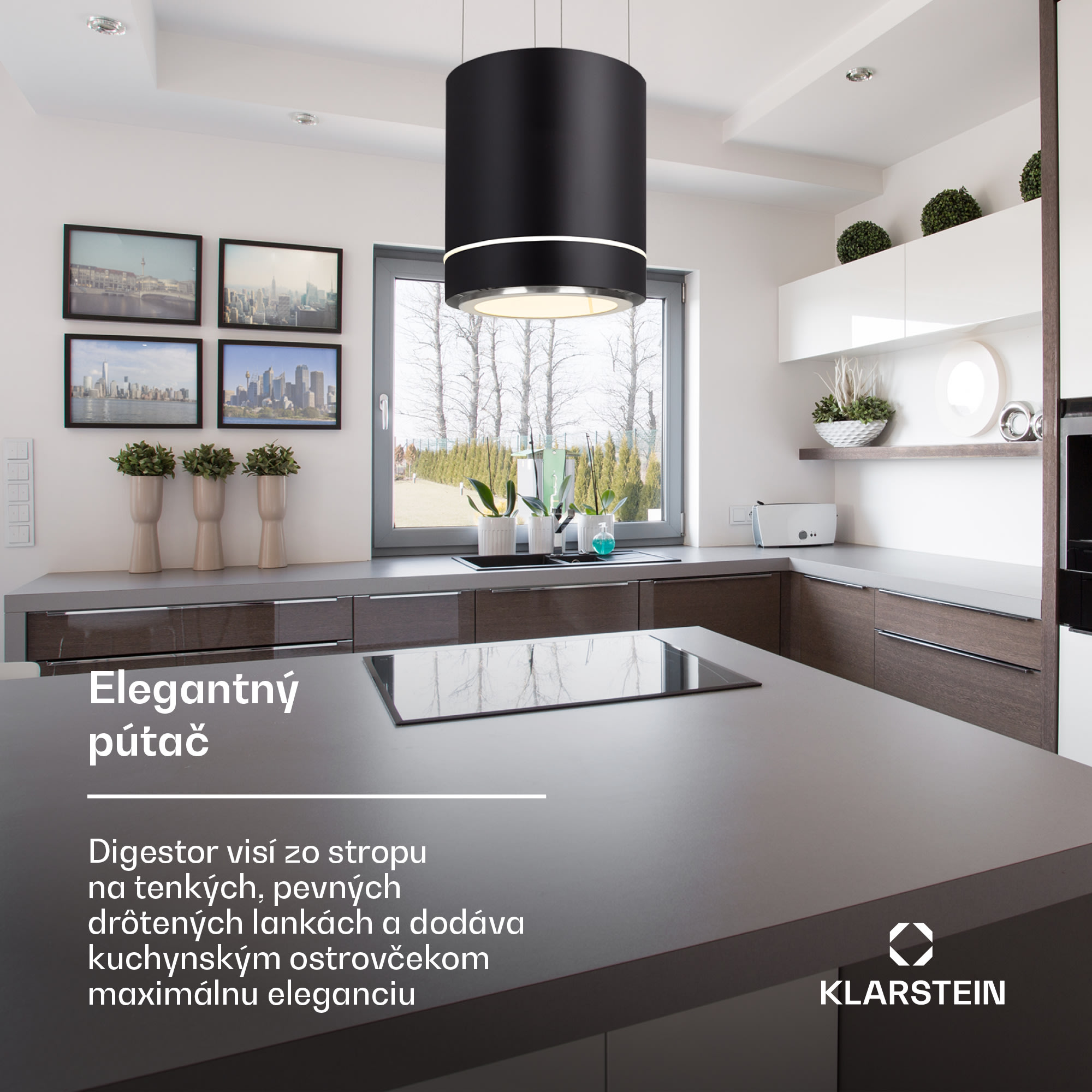 Budúcnosť odparovania výparov: ostrovčekový digestor Klarstein Tron Ambience prináša do kuchyne futuristický lesk a zbaví vzduch pár a výparov.Dokonalosť pre kuchynský ostrovček. S ostrovčekovým digestorom Klarstein Tron Ambience získa otvorená varná plocha posledné luxusné doladenie, keďže názov zariadenia zároveň pomenúva aj jeho program. Digestor voľne visí zo stropu na odolných, 140 cm dlhých oceľových lankách a efektívne sa postará o odstránenie výparov vznikajúcich pri varení. V troch výkonnostných úrovniach neúnavne cirkuluje vzduch s prietokom vzduchu až do 540 m³/h, čím neúnavne odstraňuje z kuchynského vzduchu mastnotou a pachy. Vďaka tomu je ideálny pre veľké priestory americkej ostrovčekovej kuchyne. Pri všetkých výkonnostných úrovniach dodáva zabudované LED diódy osvetlenie varnej plochy svetlé, biele svetlo, zatiaľ čo predný ovládací panel s digitálnym displejom presne zobrazuje jeden zo zvolených výkonnostných stupňov.Ostrovčekový digestor Klarstein Tron Ambience sa vyznačuje dokonale elegantným vonkajším vzhľadom. V dizajne PureAmbience získava okrúhla čierna konštrukcia s jasne osvetleným LED kruhom na varnom ostrove futuristický lesk.Čistý vzduch a elegantný vzhľad: stropný ostrovčekový digestor Klarstein Tron Ambience prinesie do kuchyne žiarivé momenty.Všimnite si, prosím, že tento digestor je určený na recirkulačnú prevádzku a je už už vybavený vhodnými filtrami s aktívnym uhlím.