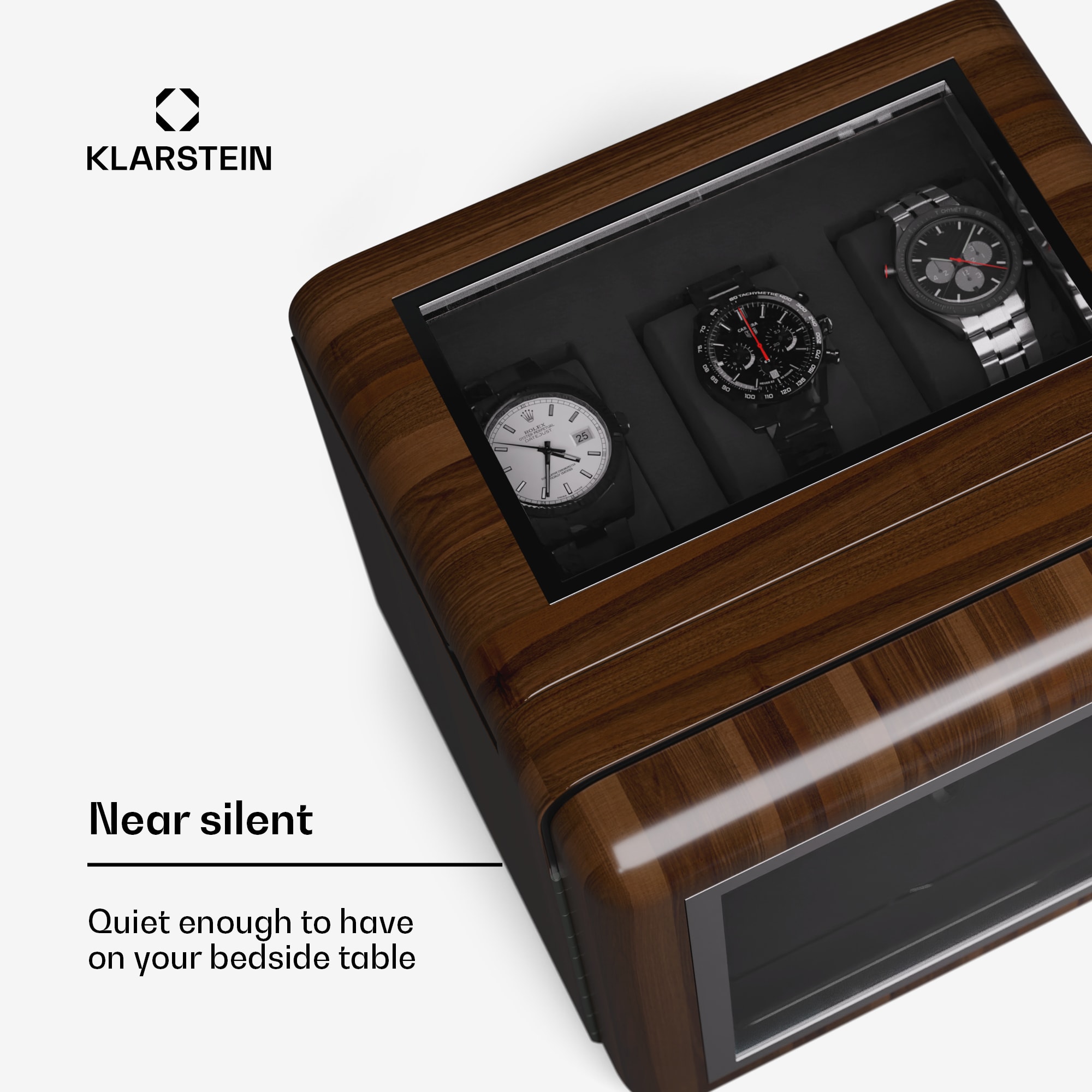 Ak chcete svoje cenné automatické hodinky uchovávať štýlovo, naťahovač hodiniek a stojan na hodinky Klarstein Valmont 2+3 je ideálnou voľbou. Tento elegantný naťahovač hodiniek pojme nielen dve hodinky, ale má aj uzamykateľnú priehradku na ďalšie tri, takže svoju zbierku môžete mať uloženú v bezpečí.Naťahovač hodiniek Klarstein Valmont 2+3 kombinuje nadčasovú eleganciu s najmodernejšou technológiou, aby udržal vaše automatické hodinky v najlepšom stave. Vďaka svojmu štýlovému dizajnu dokonale zapadne do každého prostredia a zaručene bude pútať pozornosť na nočnom stolíku alebo vo vašej zbierke.Vďaka nastaviteľným vankúšikom na hodinky sa naťahovač hodiniek Klarstein Valmont 2+3 prispôsobí hodinkám s priemerom od 46 do 72 mm, zatiaľ čo voľba otáčania vľavo/vpravo a nastaviteľné TPD zabezpečia optimálny pohyb hodiniek. Dotykový panel s osvetlením LED umožňuje jednoduchú obsluhu, zatiaľ čo funkcia uzamknutia kľúčom chráni hodinky pred zvedavými pohľadmi.