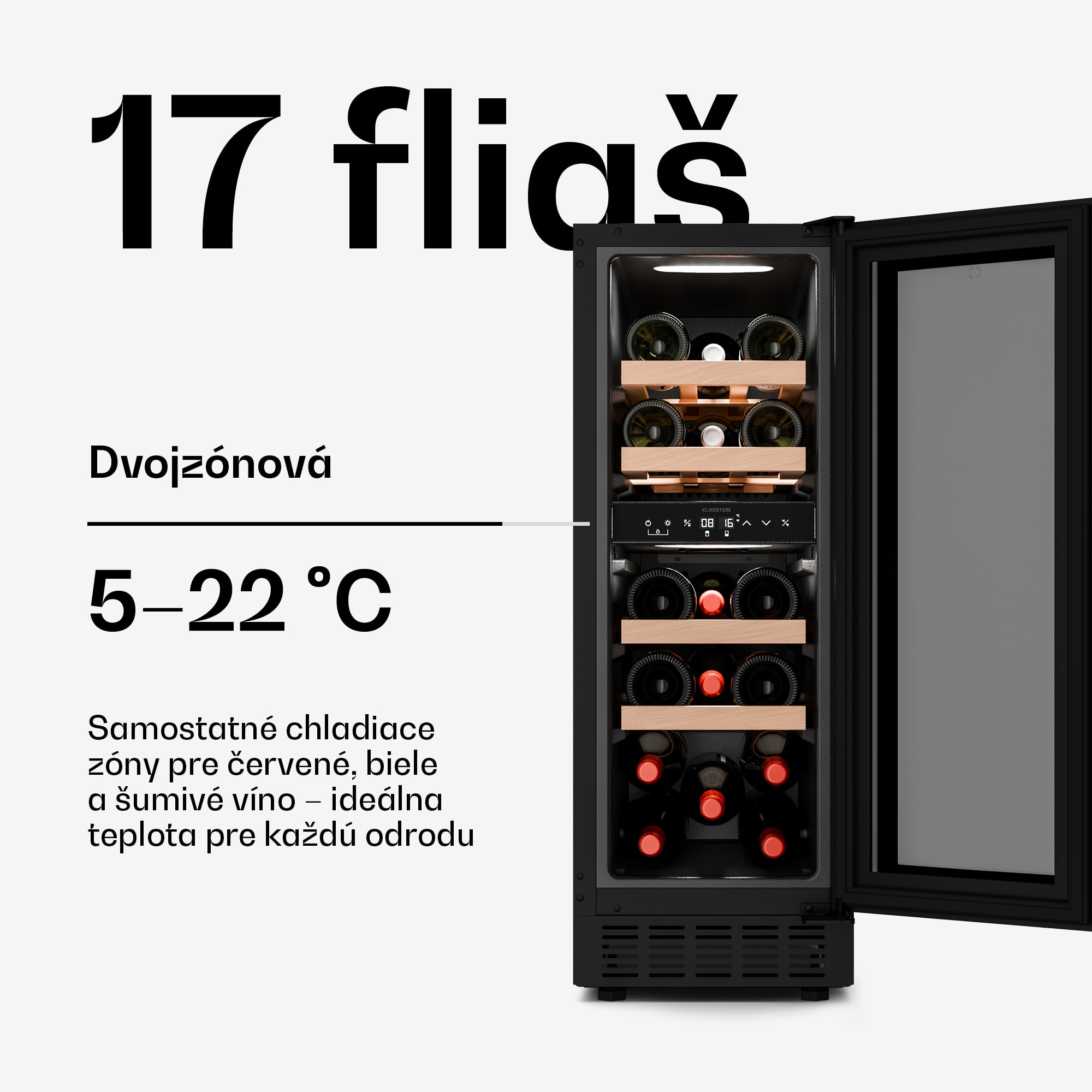 Vinotéka Klarstein Velaire kombinuje minimalistický dizajn s vysokým výkonom. Vďaka harmonickej kombinácii matných a lesklých povrchov sa bez problémov hodí do moderných priestorov. Ako súčasť dizajnovej série Velaire stelesňuje táto vinotéka minimalizmus, pokoj a čistú geometriu, vďaka čomu je prirodzeným doplnkom každej dobre vybavenej kuchyne. Vďaka dvom zónam sú víno a šampanské vždy skladované pri optimálne nastavenej teplote medzi 5 a 22 °C. Teplota sa dá ľahko nastaviť pomocou dotykového ovládania. Štyri kvalitné, odnímateľné drevené police ponúkajú priestor pre 17 fliaš vína, ktoré sú zvýraznené LED vnútorným osvetlením. Vinotéku je možné umiestniť ako voľne stojacu, ale je vhodná aj na inštaláciu pod kuchynskú linku. Chceli by ste si zariadiť celú kuchyňu jednotným spôsobom s jednoduchou eleganciou? Objavte všetky naše spotrebiče Velaire a vytvorte si sofistikovaný a harmonický kuchynský zážitok!
