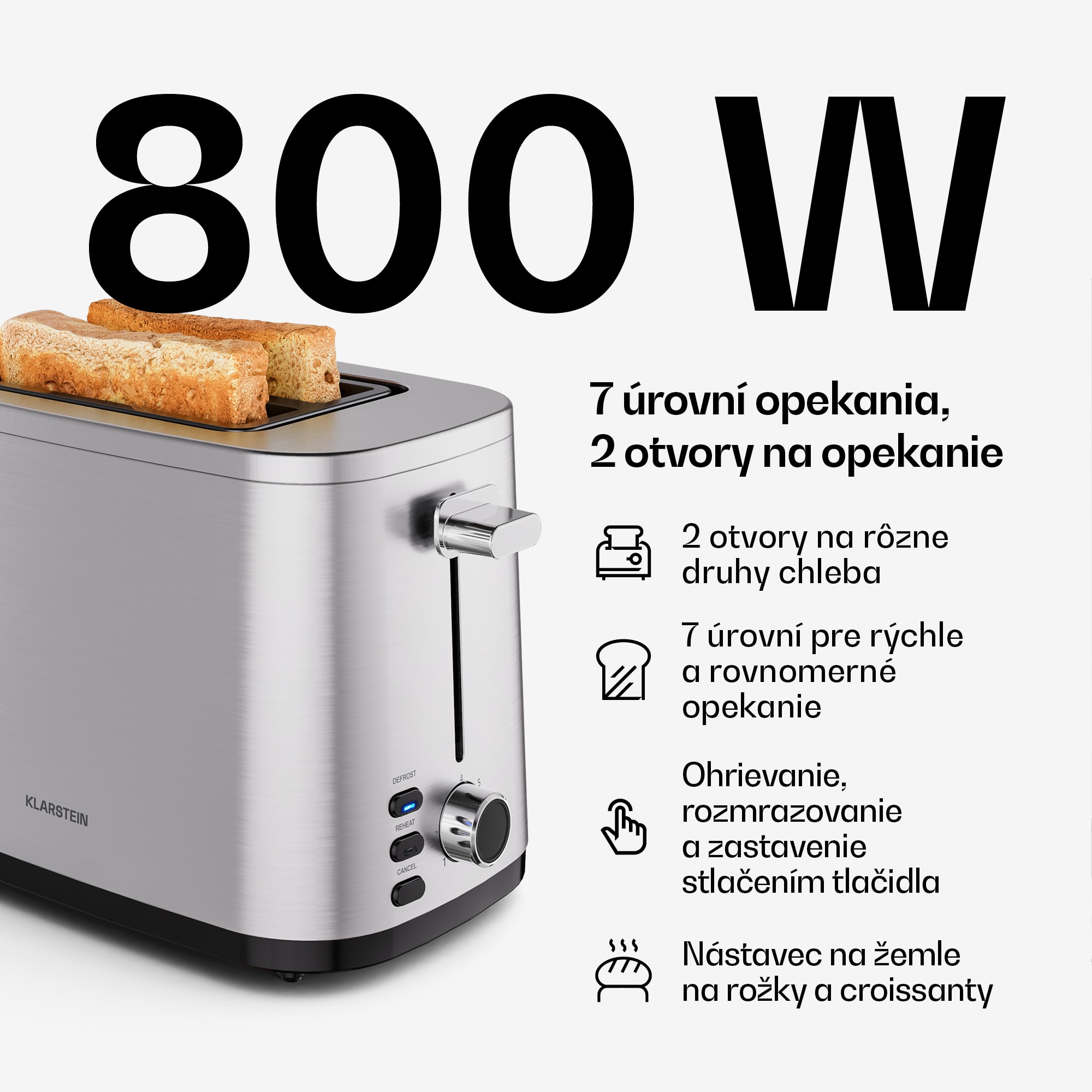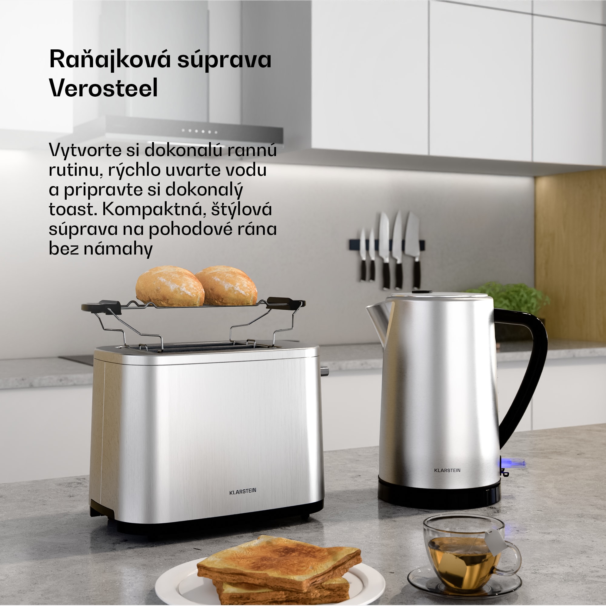 Základná raňajková súprava Klarstein Verosteel zaujme kvalitnou nehrdzavejúcou oceľou a decentnými čiernymi lesklými prvkami. Preto sa bez problémov hodí do moderných interiérov. Táto raňajková súprava, ktorá je súčasťou dizajnovej série Verosteel, stelesňuje pokoj, minimalizmus a čistú geometriu, vďaka čomu je prirodzeným doplnkom každej dobre vybavenej kuchyne. Súprava sa skladá z dvojštrbinového hriankovača s príkonom 800 W a rýchlovarnej kanvice s objemom 1,7 litra. Hriankovač disponuje aj 7 rôznymi stupňami opečenia a má nástavec na pečenie žemlí a croissantov. Kanvica s výkonom až 2200 W je vybavená integrovaným filtrom vodného kameňa. Chceli by ste si zariadiť celú kuchyňu jednotným spôsobom s jednoduchou eleganciou? Objavte všetky naše spotrebiče Verosteel a vytvorte si sofistikovaný a harmonický kuchynský zážitok!