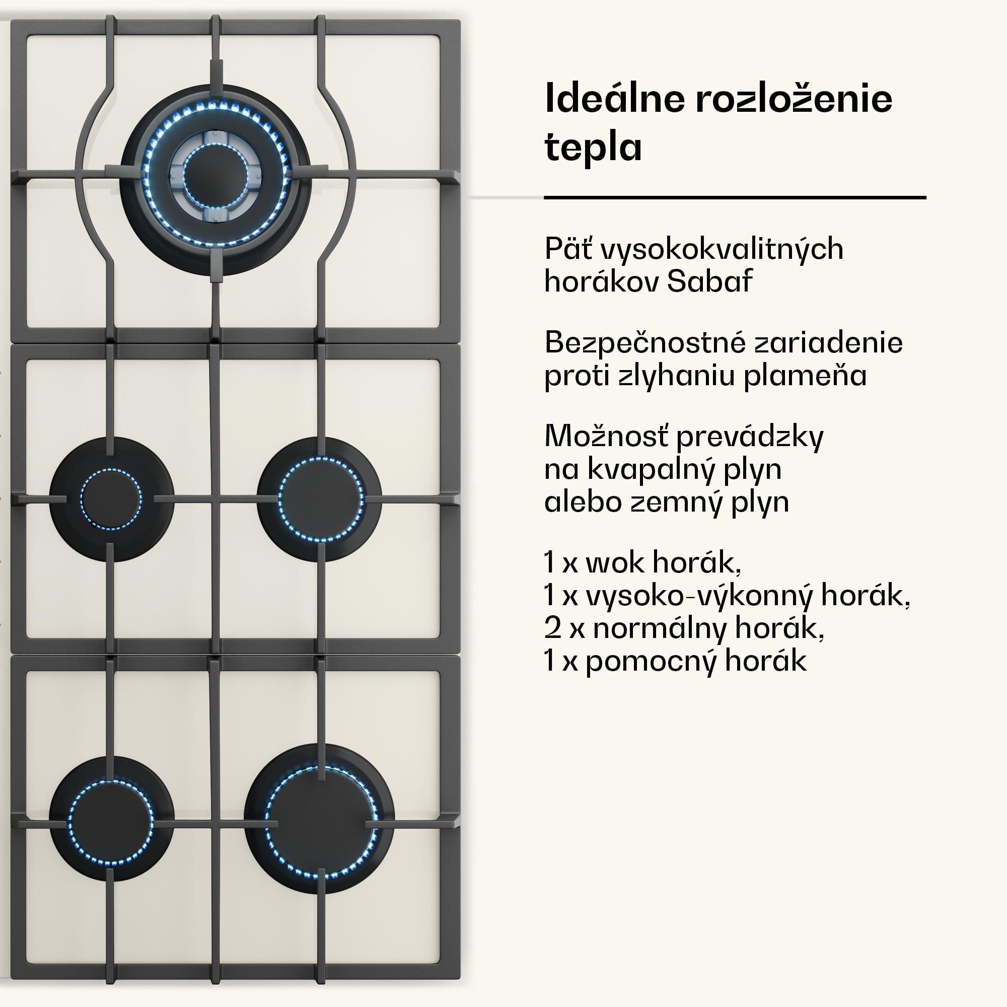 Plynová varná doska Klarstein Victoria Chef Edition s 5 zónami spája moderný dizajn s vynikajúcim výkonom a užívateľsky prívetivou obsluhou. Vďaka výkonným horákom, jednoduchej manipulácii a rôznym bezpečnostným funkciám ponúka všetko, čo potrebujete pre efektívne a bezpečné varenie.Plynová varná doska Klarstein Victoria Chef Edition s 5 zónami má vysoko výkonné horáky z mosadze, ktoré ponúkajú celkový výkon 11 100 W. Tento výkon umožňuje nielen varenie, ale aj vyprážanie, dusenie v pare, dusenie a mnoho ďalšieho. Rôzne stupne výkonu umožňujú presnú kontrolu ohrevu na dosiahnutie optimálnych výsledkov varenia.Zapaľovanie SnapJet a bezpečnostné funkcie, ako napríklad detekcia zlyhania plameňa, zabezpečujú pohodlnú a bezpečnú prevádzku. Rôzne možnosti usporiadania, najmä bočný horák WOK, umožňujú všestranné varenie a šetria miesto – aj na úzkych pracovných doskách.Jednou z výnimočných funkcií je možnosť prepínania medzi zemným plynom a skvapalneným ropným plynom (LPG). Vďaka tryskám, ktoré sú súčasťou dodávky, môže zákazník túto úpravu vykonať sám v závislosti od dostupnosti plynu v jeho regióne.Plynová varná doska sa vďaka integrovanému dizajnu a sklokeramickému povrchu v slonovinovej farbe ľahko čistí. Plynová varná doska Klarstein Victoria Chef Edition s 5 zónami je dokonale zapustená do pracovnej dosky, šetrí miesto a podčiarkuje moderný estetický vzhľad kuchyne.