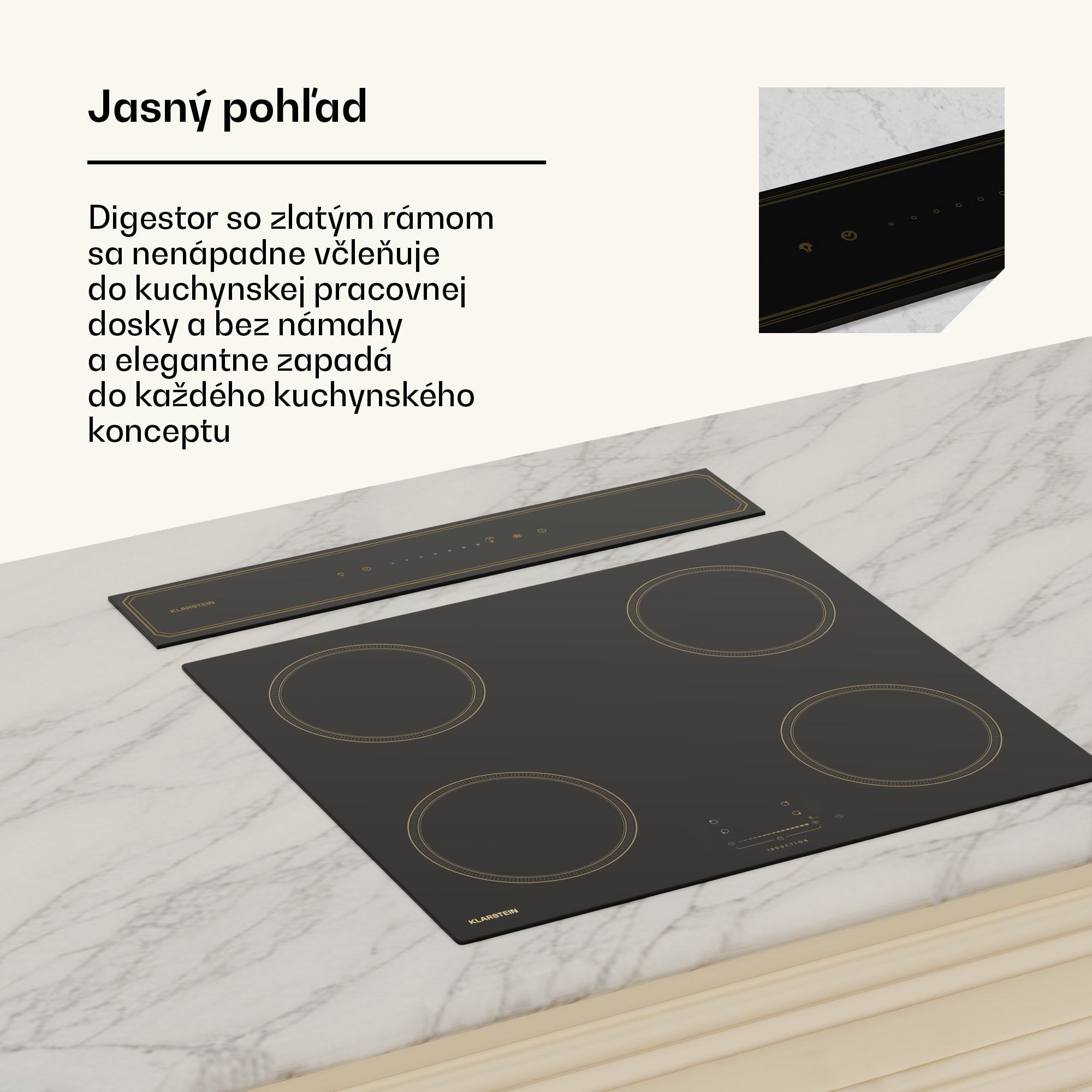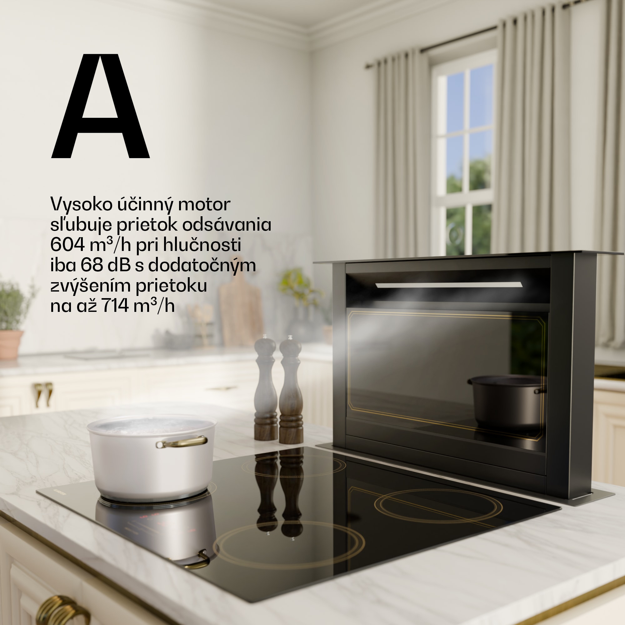 Downdraft-digestor Klarstein Victoria prináša do vašej kuchyne moderný dizajn a výkonnú technológiu. Vďaka triede energetickej účinnosti A zabezpečuje ekologickú prevádzku a šetrí vašu peňaženku. Digestor ponúka 8 úrovní výkonu a funkciu Boost, ktorá umožňuje zvýšiť prietok vzduchu až na 713,8 m³/h. Vďaka výkonnému 120 W BLDC-motoru zostáva hlučnosť minimálne 52 dB, čo z neho robí jeden z najtichších digestorov na trhu. Motor tiež prispieva k vysokej energetickej účinnosti s ročnou spotrebou energie len 17,3 kWh.Digestor sa obsluhuje pomocou užívateľsky prívetivého dotykového panela, ktorý uľahčuje ovládanie. Downdraft-digestor Klarstein Victoria je vynikajúcim doplnkom každej modernej kuchyne, ktorá kladie dôraz na účinnosť, tichú prevádzku a jednoduchú obsluhu.