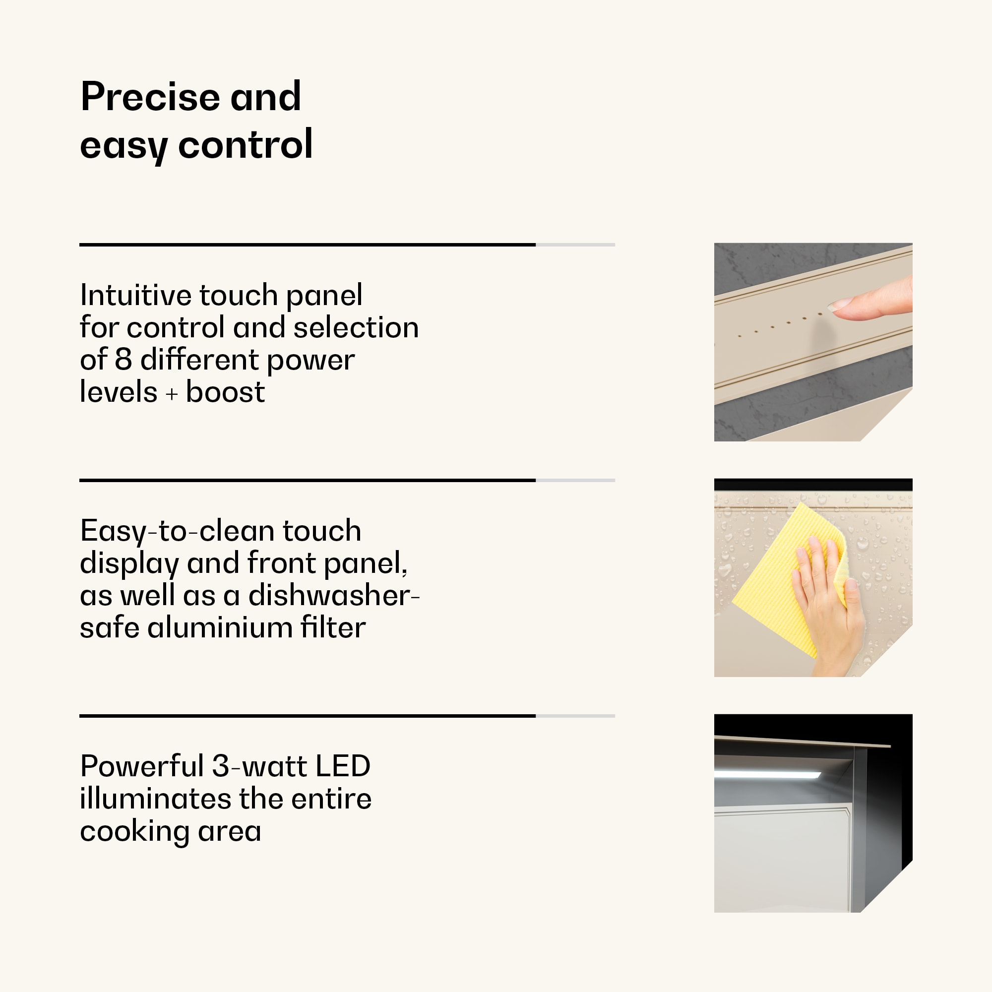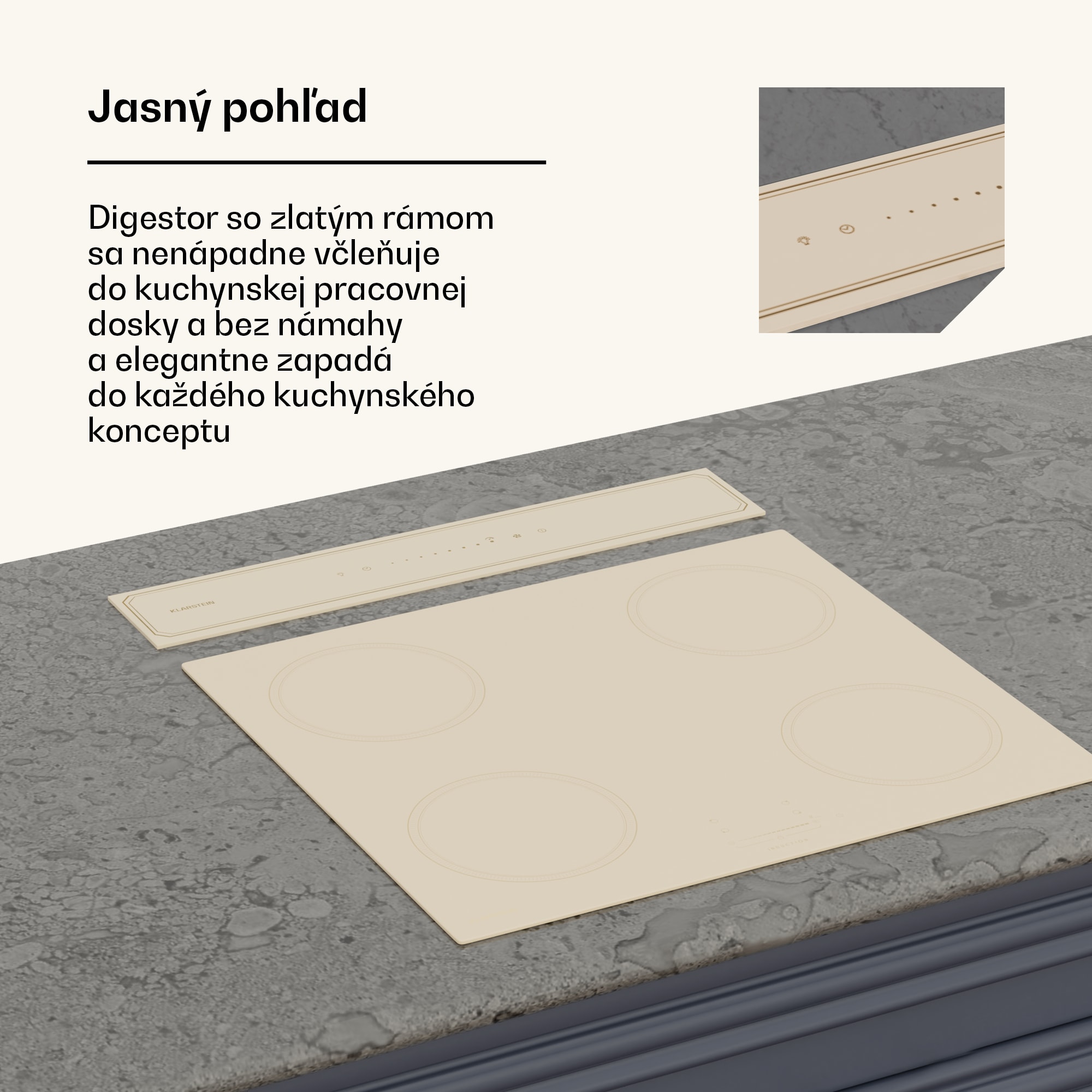 Downdraft-digestor Klarstein Victoria prináša do vašej kuchyne moderný dizajn a výkonnú technológiu. Vďaka triede energetickej účinnosti A zabezpečuje ekologickú prevádzku a šetrí vašu peňaženku. Digestor ponúka 8 úrovní výkonu a funkciu Boost, ktorá umožňuje zvýšiť prietok vzduchu až na 713,8 m³/h. Vďaka výkonnému 120 W BLDC-motoru zostáva hlučnosť minimálne 52 dB, čo z neho robí jeden z najtichších digestorov na trhu. Motor tiež prispieva k vysokej energetickej účinnosti s ročnou spotrebou energie len 17,3 kWh.Digestor sa obsluhuje pomocou užívateľsky prívetivého dotykového panela, ktorý uľahčuje ovládanie. Downdraft-digestor Klarstein Victoria je vynikajúcim doplnkom každej modernej kuchyne, ktorá kladie dôraz na účinnosť, tichú prevádzku a jednoduchú obsluhu.