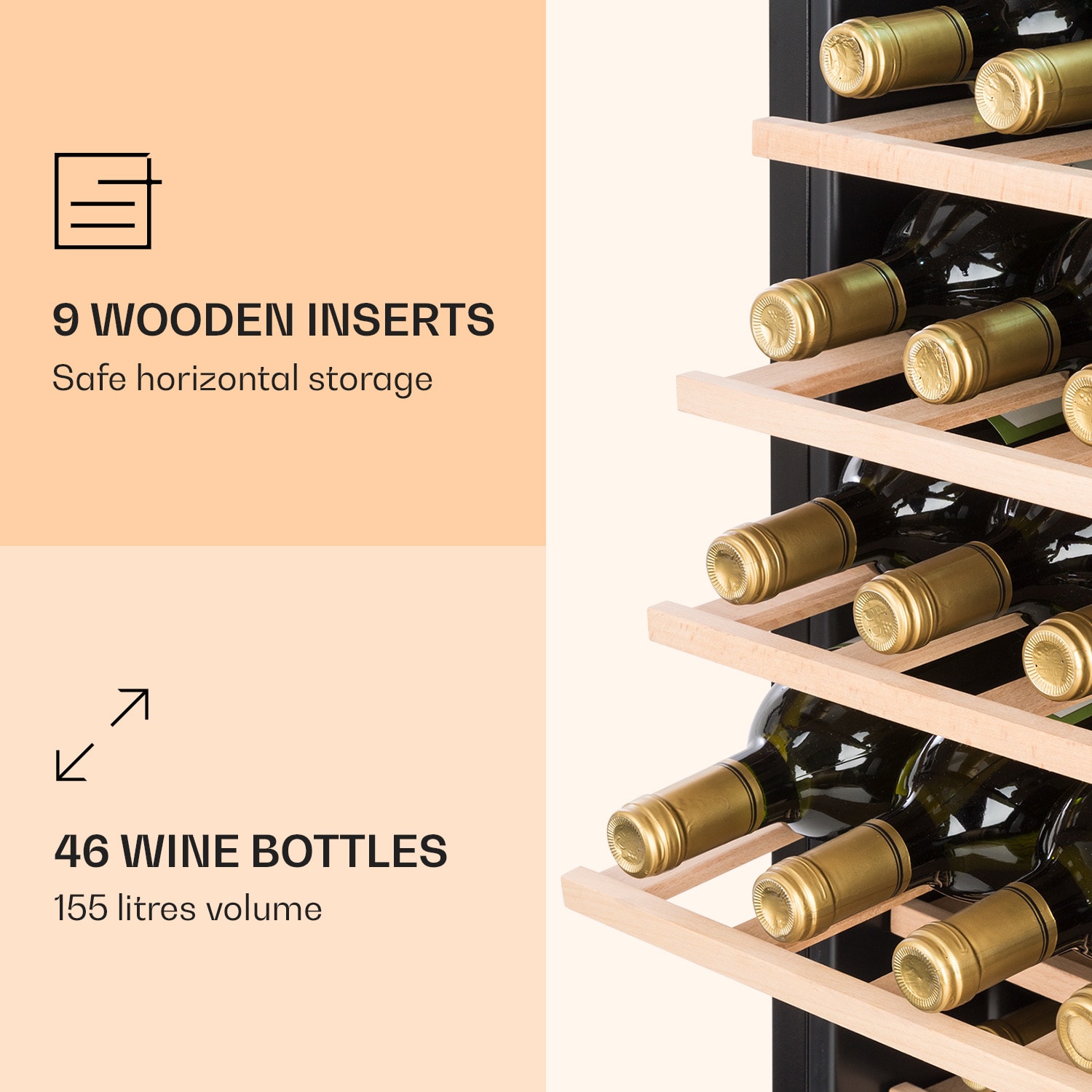 Z lásky k vínu: Vinotéka Vinamour 46 Uno od Klarstein zaručuje ten najlepší pôžitok z vína. S objemom 155 litrov pojme až 46 fliaš vína na 10 úrovniach a 9 drevených policiach a ochladí ich na požadovanú teplotu od 4 do 18 °C. V hornej časti nájde chladné miesto pre 6 elegantne zavesených pohárov na víno. Dotykové ovládanie je pohodlné a jednoduché. Vďaka osvetleniu interiéru sú fľaše luxusne prezentované a sklenené dvere tak ponúkajú vzrušujúci pohľad. Táto dvojzónová vinotéka je ideálna pre rôzne druhy vín.Pre gastronómov a znalcov: V luxusnej vinotéke Vinamour 46 Uno od Klarstein môžete štýlovo skladovať a chladiť vína i poháre!