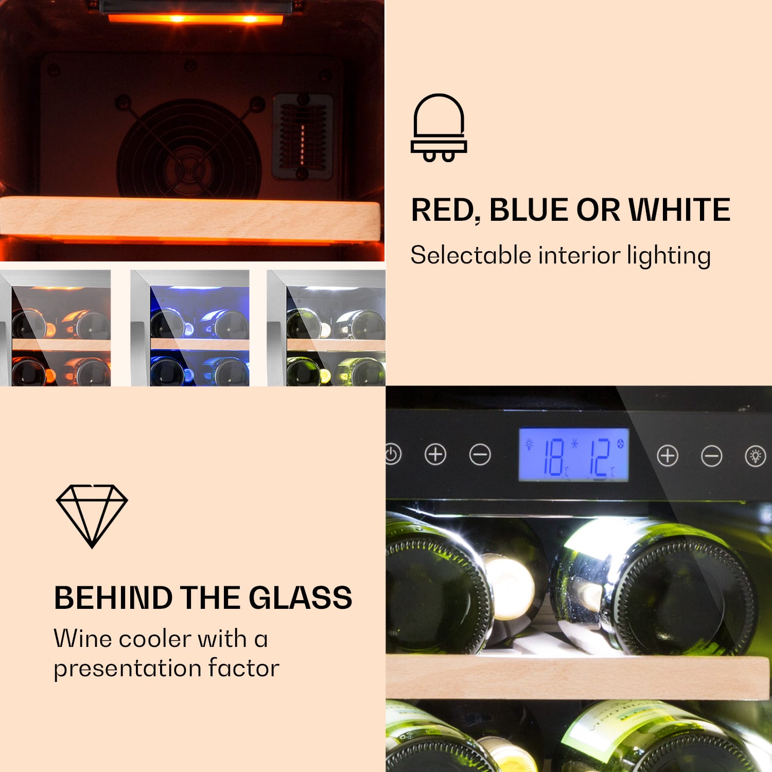 Elegantný dizajn a farebná prezentácia: Klarstein Vinovilla 17 Built-In Duo vinotéka sa vďaka svojmu štíhlemu dizajnu hodí takmer do každého priestoru! Obe zóny možno nastaviť oddelene, čo umožňuje chladiť a skladovať červené a biele vína súčasne. Táto dvojzónová vinotéka navyše umožňuje optimálne a dlhodobo skladovať aj šampanské, šumivé vína, sekty alebo iné jemné sekty v temperovacej skrinke. Okrem najlepších podmienok na skladovanie a chladenie ponúka vašej zbierke vín extravagantnú scénu: za sklom sa fľaše nádherne prezentujú – osvetlené červenou, modrou alebo bielou farbou.