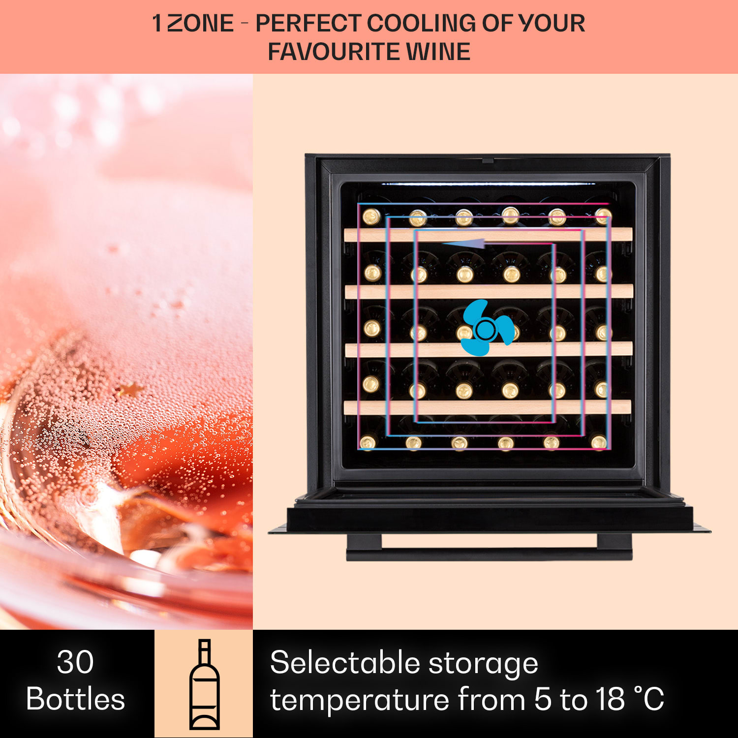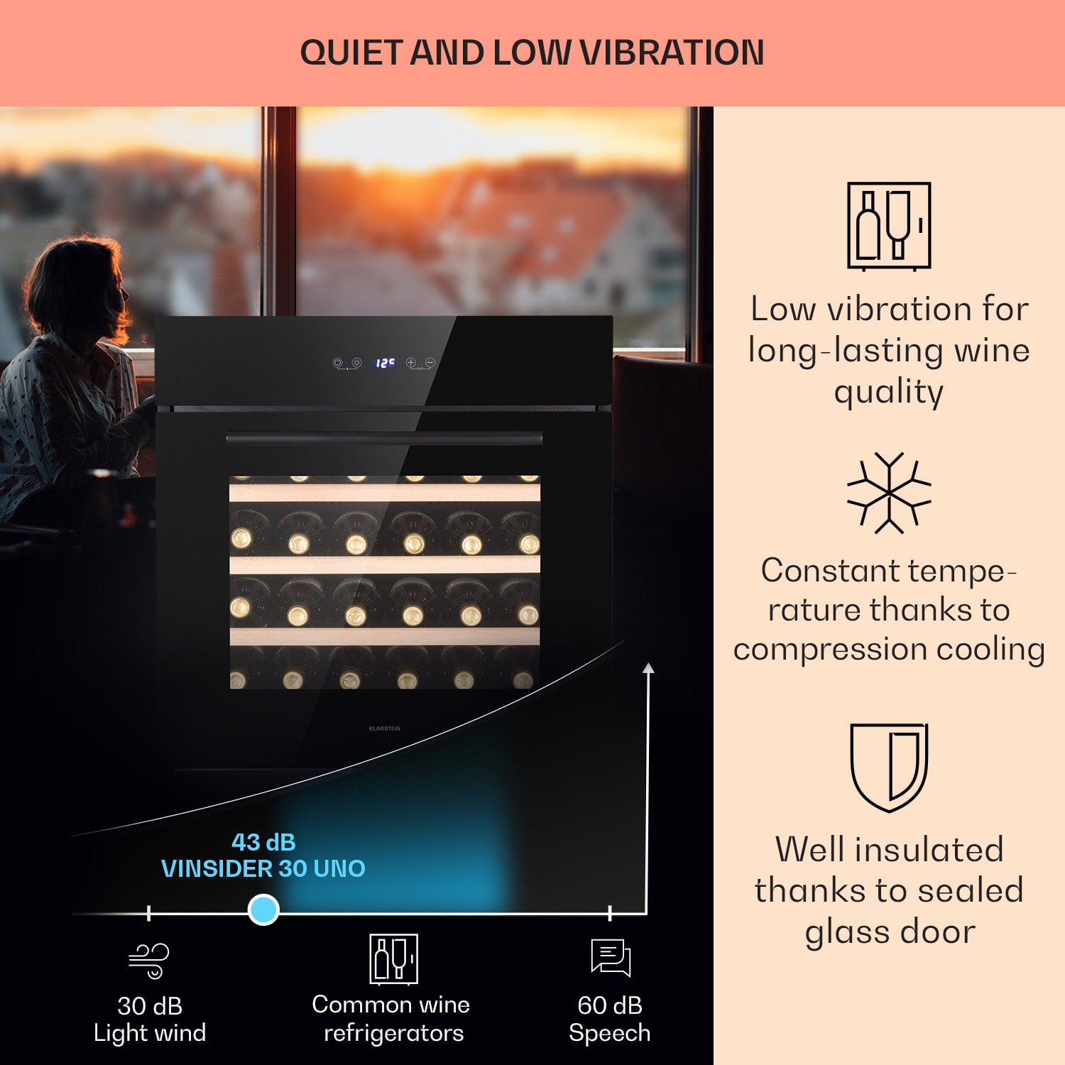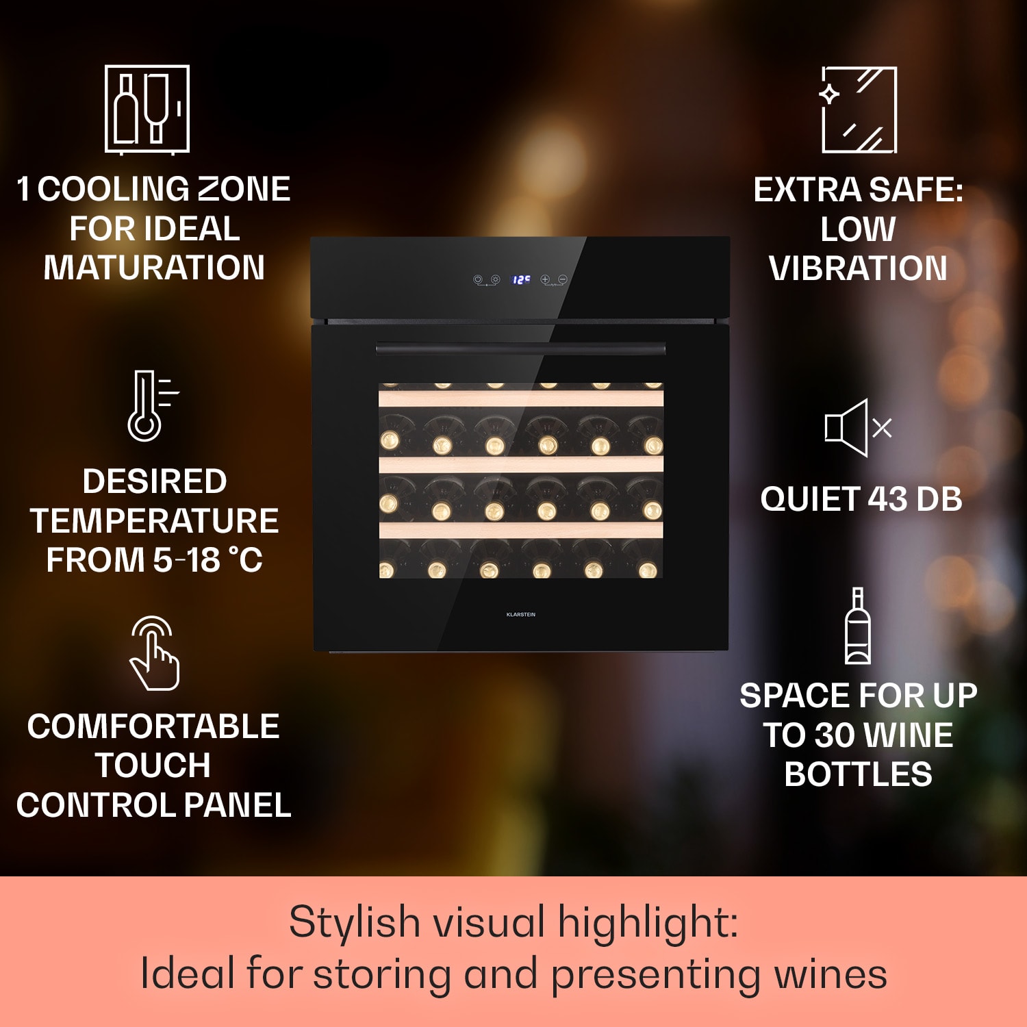 Vďaka vstavanej vinotéke Klarstein Vinsider 30 Built-In Uno môžete vínu poskytnúť ideálne podmienky pre jeho plnú vôňu a dokonalú teplotu počas pitia. Všetko čo musíte spraviť je otvoriť elegantné predné dvierka s panoramatickým sklom a položiť víno na jednu zo 4 drevených políc. Špeciálna vychytávka: dvere sa otvárajú zhora nadol, rovnako ako rúra. Aby sa chladenie neprerušovalo, môžete na dotykovom ovládacom paneli mimo spotrebiča nastaviť požadovanú teplotu chladenia. Vaša vinotéka Vinsider 30 Built-In Uno od Klarstein sa postará o príjemnú klímu pre víno, aby vaše kvalitné vína boli vždy pripravené na vychutnanie pri príjemnej teplote. Táto vstavaná vinotéka je ideálnym riešením pre každého milovníka vína.