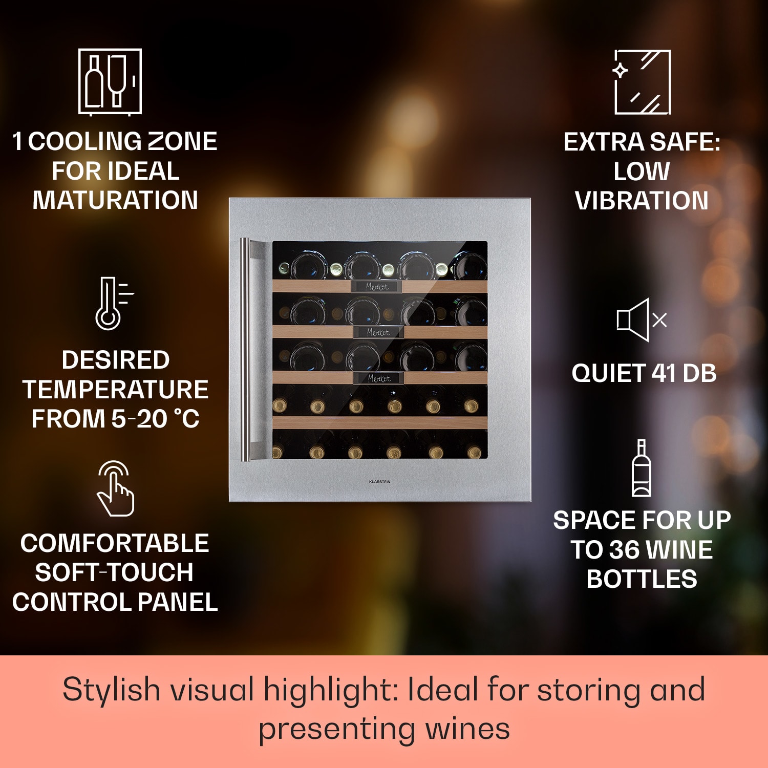 Vďaka vstavanej vinotéke Vinsider 36 Built-In Uno od Klarstein môžete zabezpečiť vínu ideálne podmienky na to, aby plne rozvinulo svoju chuť a vôňu. Všetko čo musíte spraviť je otvoriť elegantné predné dvierka s panoramatickým sklom a položiť víno na jednu zo 4 drevených políc. Potom stačí nastaviť želanú teplotu a vaša vinotéka od Klarstein sa postará o „príjemnú atmosféru pre víno“. Ak budete vašim hosťom chcieť ponúknuť víno, tak bude vždy vychladené na tú správnu teplotu: vždy a po ruke. Vstavaná vinotéka je skvelým doplnkom pre každého milovníka vína.