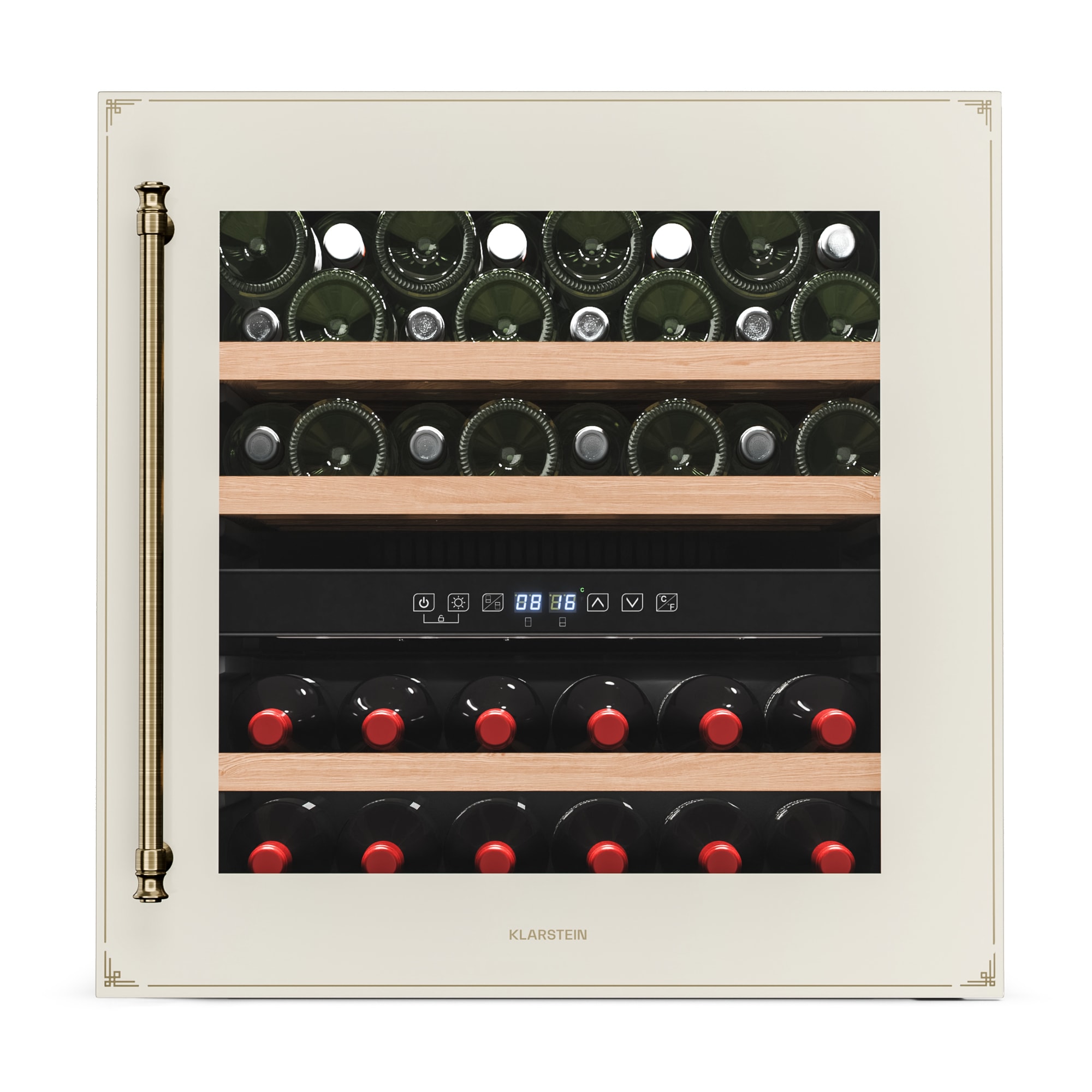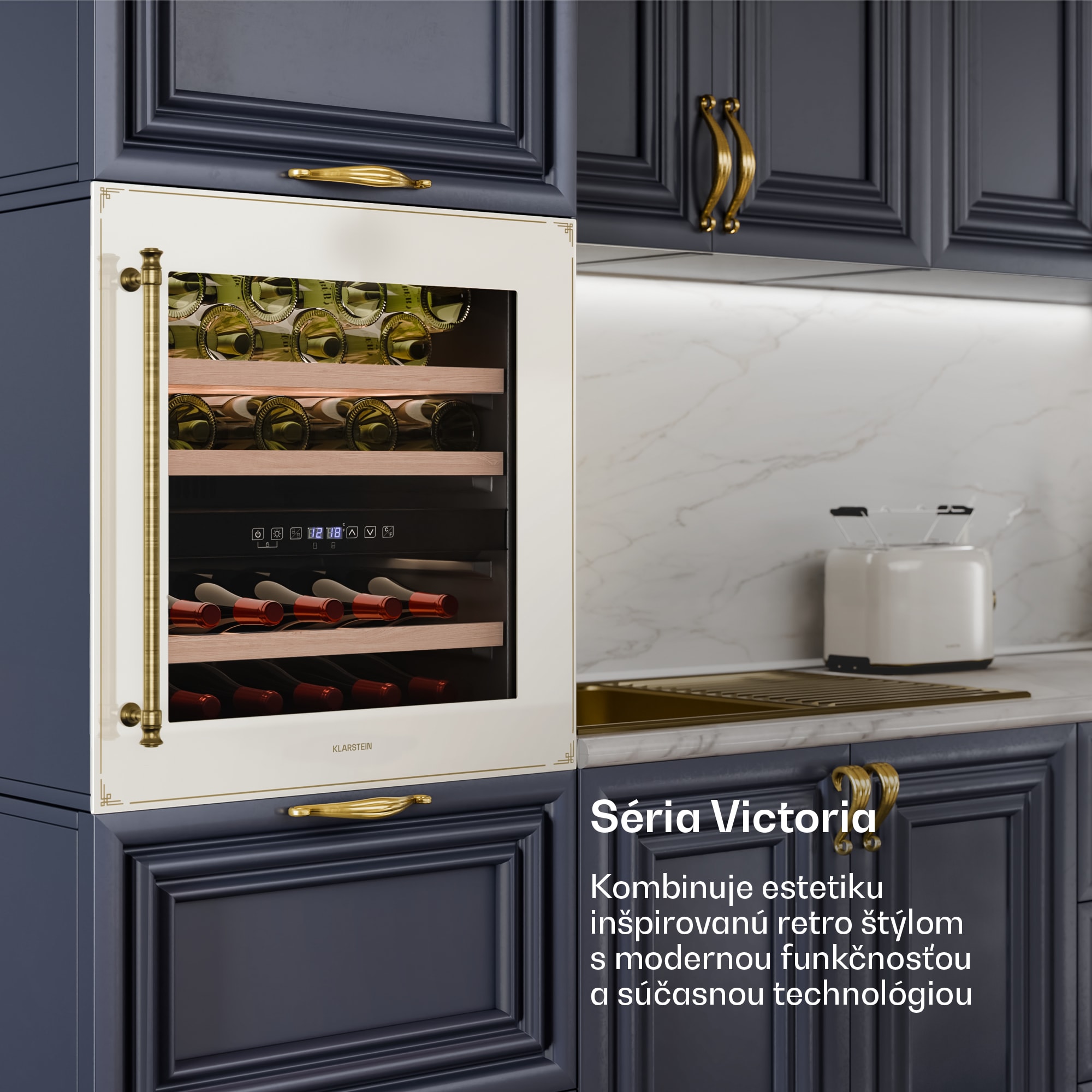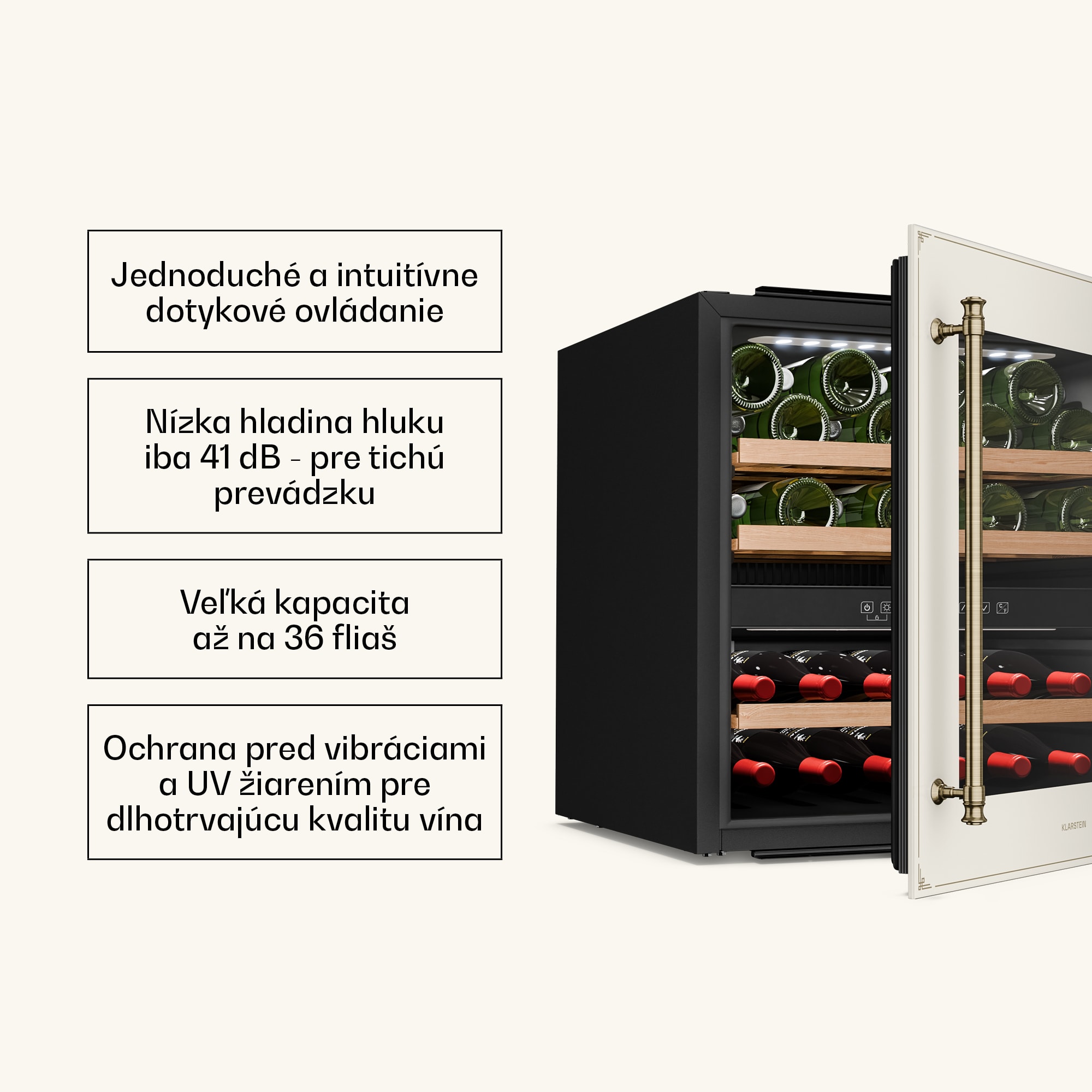 Vinotéka Klarstein Vinsider Victoria 36 kombinuje vintage dizajn s optimálnou funkčnosťou na dokonalé uskladnenie a prezentáciu vašich vín.S kapacitou až 36 fliaš ponúka chladnička na víno Klarstein Vinsider Victoria 36 dostatok priestoru pre vaše najcennejšie vína. Vysokokvalitné spracovanie s odnímateľnými drevenými policami v dvoch chladiacich zónach zaručuje nielen štýlovú prezentáciu, ale aj skladovanie bez vibrácií a s ochranou proti UV žiareniu, ktorá dlhodobo zachováva kvalitu vína. Intuitívne dotykové ovládanie umožňuje jednoduchú reguláciu teploty v rozsahu od 5 do 22 stupňov Celzia, takže vaše vína budú mať vždy ideálnu teplotu na pitie. Vďaka tichej prevádzke s hlučnosťou len 41 dB a elegantnému vnútornému LED osvetleniu chladnička na víno dokonale zapadne do každej kuchyne a vytvorí príjemnú atmosféru. Chladničku na víno je potrebné pravidelne čistiť a podľa potreby upravovať teplotu, aby sa zabezpečilo optimálne skladovanie vašich vín. Táto vstavaná vinotéka je ideálnym riešením pre každého milovníka vína.Vyskúšajte rozdiel a kúpte si chladničku na víno Klarstein Vinsider Victoria 36 pre dokonalé uskladnenie vína.