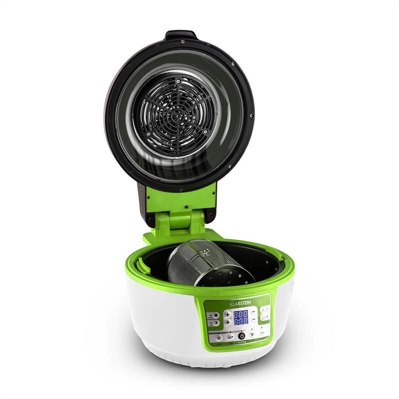 Klarstein VitAir je futuristicky pôsobiaca teplovzdušná frítéza s inovatívnym prístupom ku klasickým kulinárskym technikám, ako sú fritovanie, grilovanie či pečenie. Tento kuchynský majster spája všetky tieto postupy do jedného multifunkčného zariadenia. Pomocou halogénového infračerveného výhrevného telesa Vám umožní rekordne rýchlu a k tomu zdravú prípravu mäsa, rýb a zeleniny. Či už varíte z čerstvých alebo mrazených surovín, jedno jedlo alebo kompletné menu, toto zariadenie Vám pomôže prichystať chutné menu bez prihrievania, rozmrazovania a dodatočného pridávania oleja do chutných jedál. Revolučná konštrukcia a vetracia technológia zariadenia zaručujú rovnomerné pôsobenie tepla a zachovanie uvoľňujúcich sa štiav. Výsledkom je takmer 60% úspora času, nevysušené jedlo a zachovaná šťavnatosť a chrumkavosť. Teplotu a dĺžku prípravy je možné nastavovať manuálne, pričom zariadenie umožňuje využívanie teploty v rozsahu od 50 do 230 °C a maximálne hodinovú dĺžku prípravy pre najrozličnejšie druhy prípravy. Okrem toho môžete využiť aj predprogramované programy určené na prípravu hranolčekov, grilovaného kurčaťa, koláčov, pizze, steakov a šašlíkov. S funkciou časovača je možné samostatné spustenie procesu prípravy v určenom čase, takže Vás po prebudení budú čakať čerstvé žemle alebo hotová večera po dlhom dni v práci. Všetky funkcie sú riadené pohodlne cez predný dotykový panel, pričom LCD displej stále podáva informácie o zvolenom programe, teplote a čase chodu. Súčasťou balenia je rôzne príslušenstvo na využívanie všetkých funkcií zariadenia Klarstein VitAir, vďaka ktorému budete môcť hranolčeky pripravovať v praktickom 3D grilovacom koši, kurča alebo šašlíky upevniť na ražni v zariadení horizontálne. Zapínateľné otáčanie umožňuje hranolčekom a špízovým jedlám optimálny grilovací kôš a otáčací špíz tiež umožňuje dosiahnutie optimálneho prepečenia surovín. Pre pizzu je tu samostatný plech, na grilovanie rošt pre prípravu steakov. Štýlová oblá konštrukcia zariadenia vyrobená z dvojstenného plastu je vybavená 310° panoramatickým priehľadným okienkom pre sledovanie procesu prípravy. Vďaka nepriľnavému povrchu je zminimalizovaná námaha pri čistení a možné je aj umývanie v umývačke riadu. Vďaka svojim kompaktným rozmerom si zariadenie Klarstein VitAir nájde svoje miesto v takmer každej kuchyni, keďže kombinuje viaceré kuchynské zariadenia a robí ich zbytočnými. So svojou zeleno-bielou konštrukciou je halogénová rúra od spoločnosti Klarstein okrem toho príjemným pútačom pozornosti a určite spôsobí mnohé zvedavé otázky u Vašich hostí.